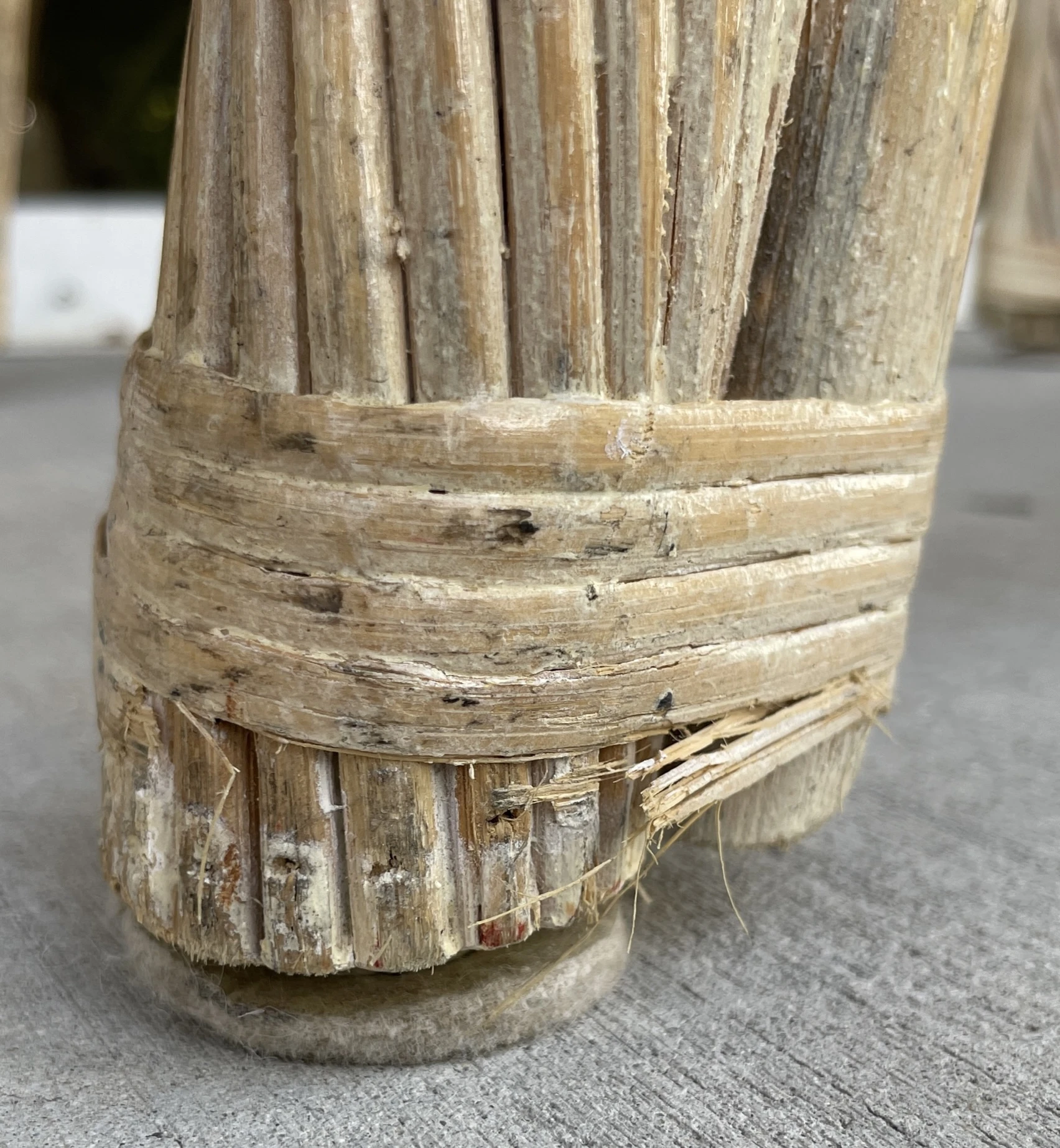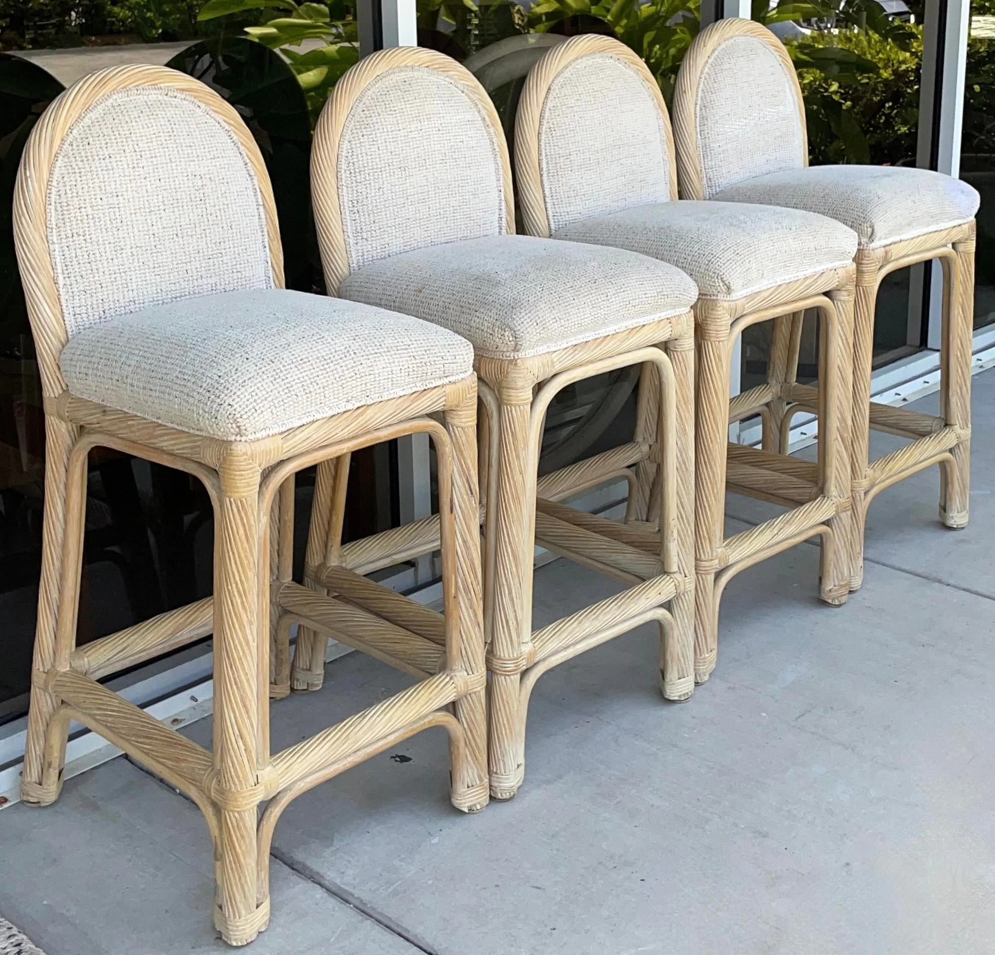 Art Deco style set of 4 pencil reed bar stools from 80’s. White washed finish, with upholstered back and seat. Sturdy and light weight. Timeless and very good quality.