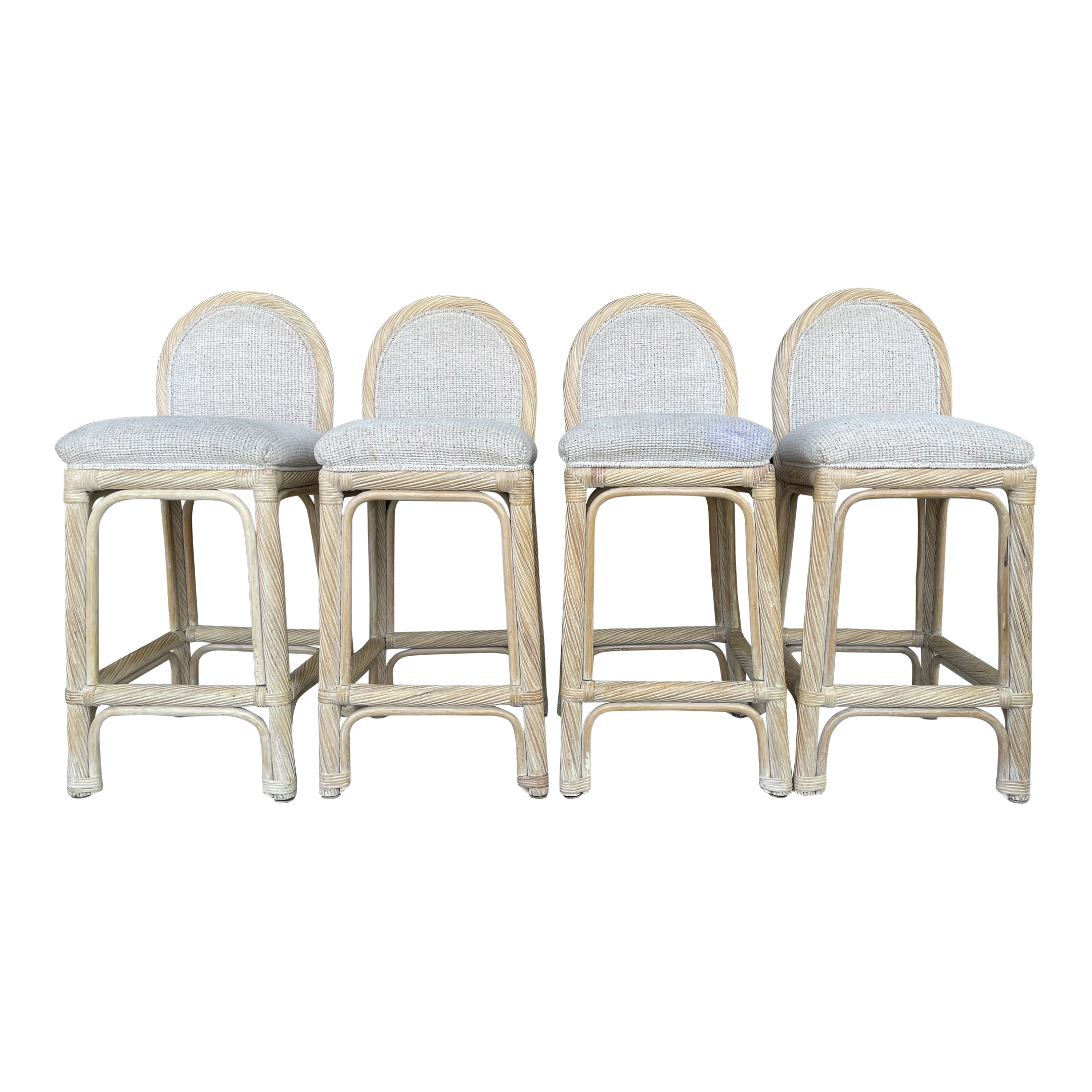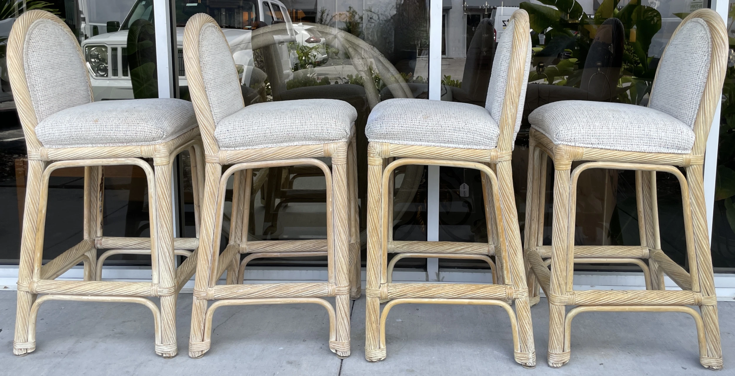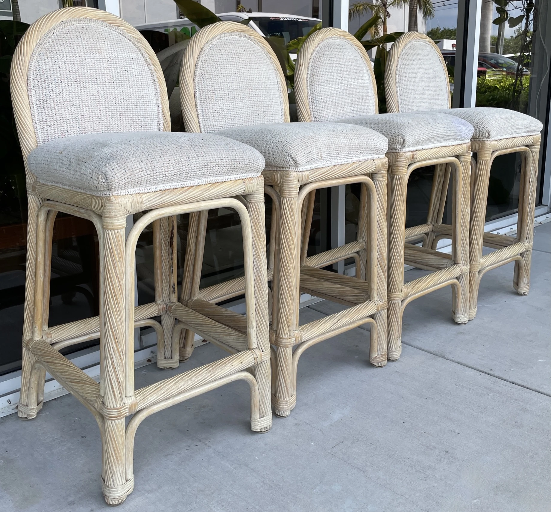 Art Deco style set of 4 pencil reed bar stools from 80’s. White washed finish, with upholstered back and seat. …