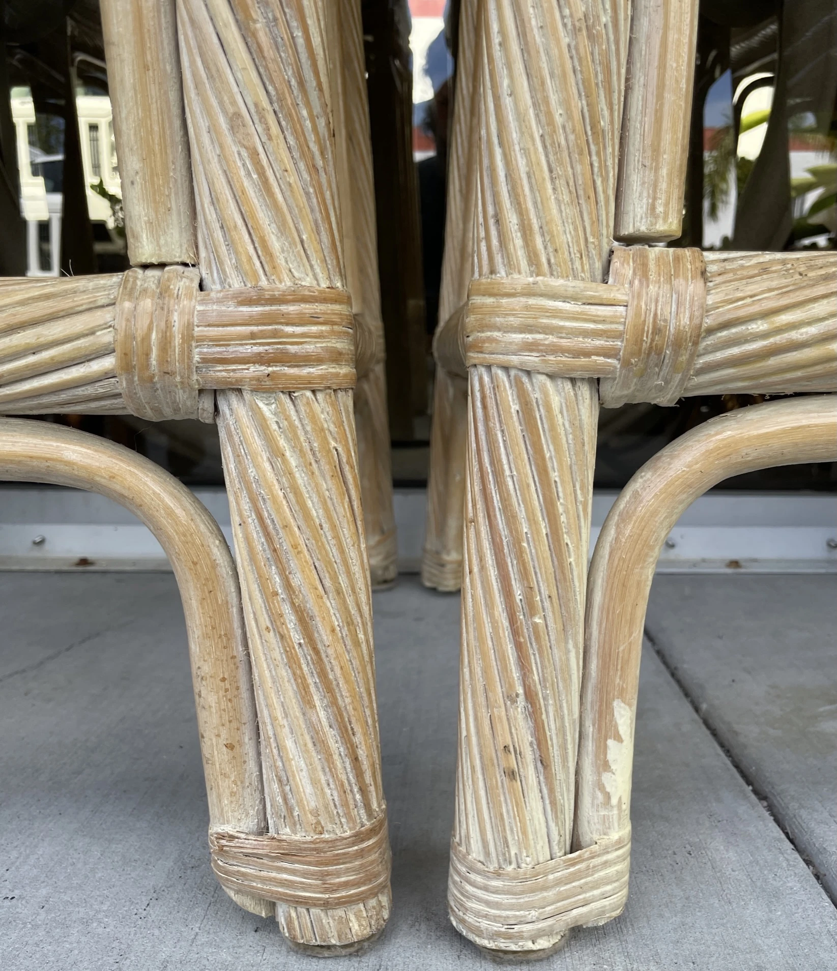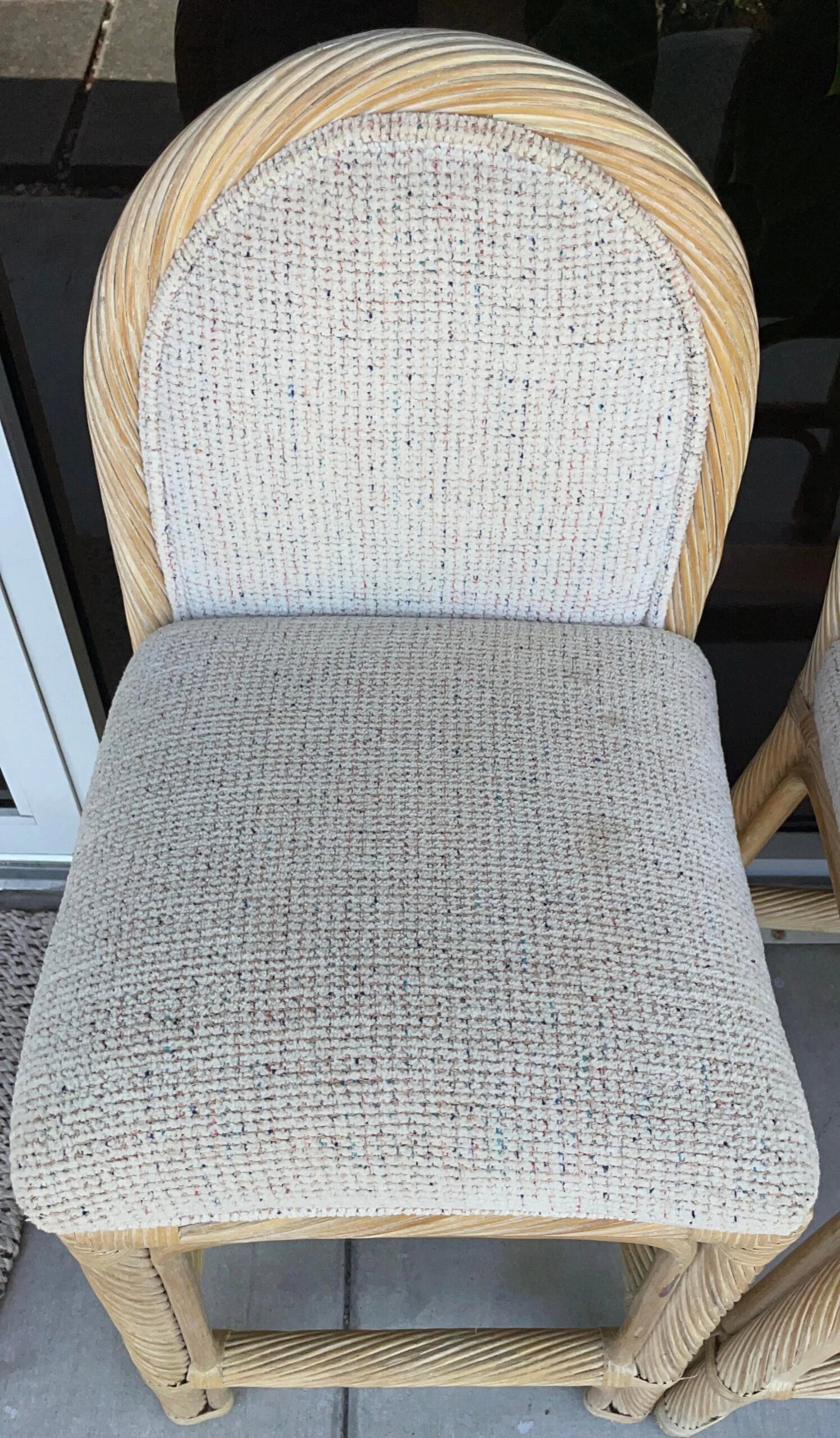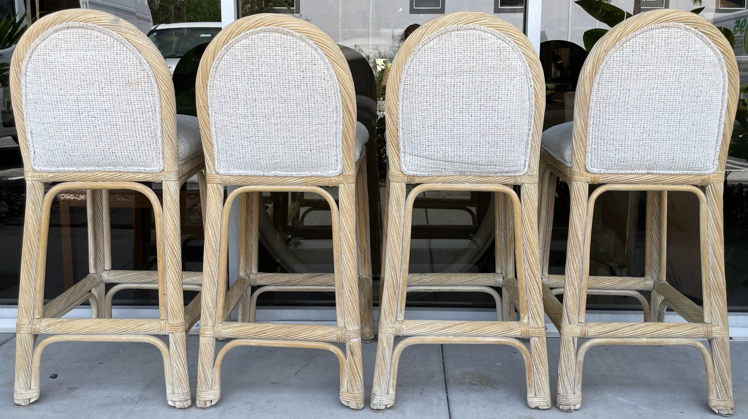Art Deco style set of 4 pencil reed bar stools from 80’s. White washed finish, with upholstered back and seat. …