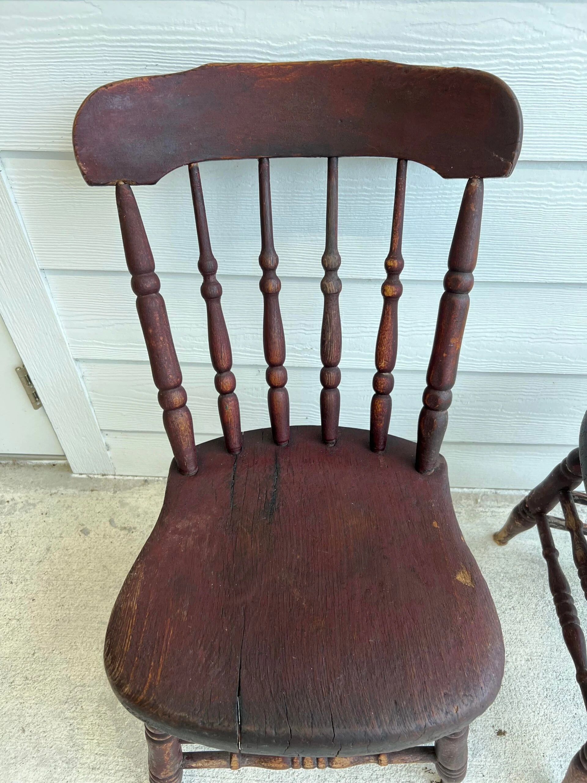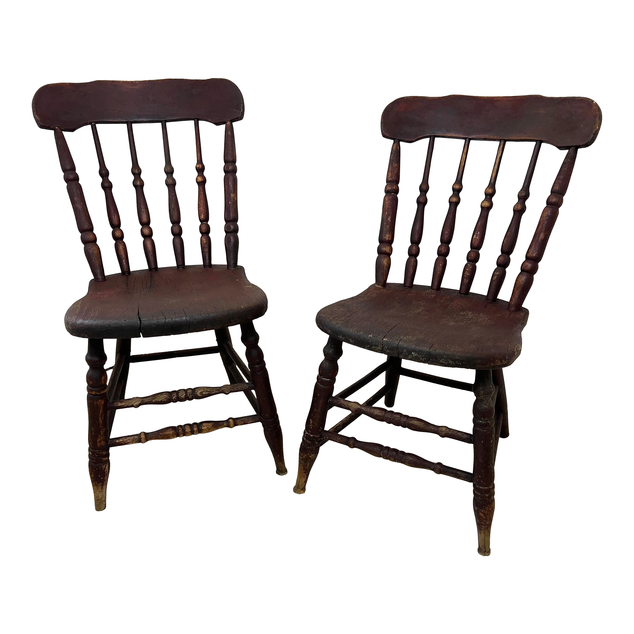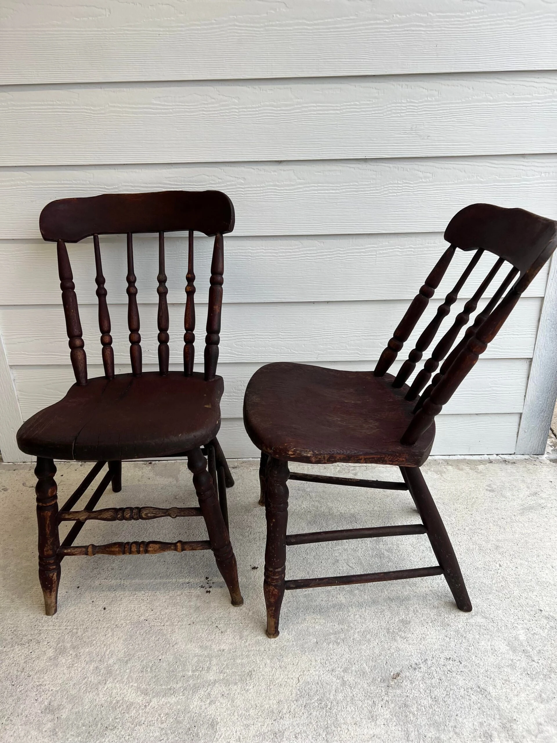 You will love the character and charm of this pair of primitive handmade antique wood dining chairs with original primitive red stain, circa 1850. They are in exceptional antique condition considering age and household use. The solid wood ( elm, ash or fruitwood) chairs have plank seats with spindle splayed slant back and matching double stretcher. One chair has hand signed name under seat bottom. Appraiser suggested it was to identify the owner during over country transport by train or other mode of transport. Place as a lovely warm accent side chairs / chair shelf in any room. Also love them styled on a breezy care free covered porch. The slant back makes for an enjoyable place to relax for sweet tea and tall tales with the neighbor folk. Partner with our primitive rustic drop leaf while available.