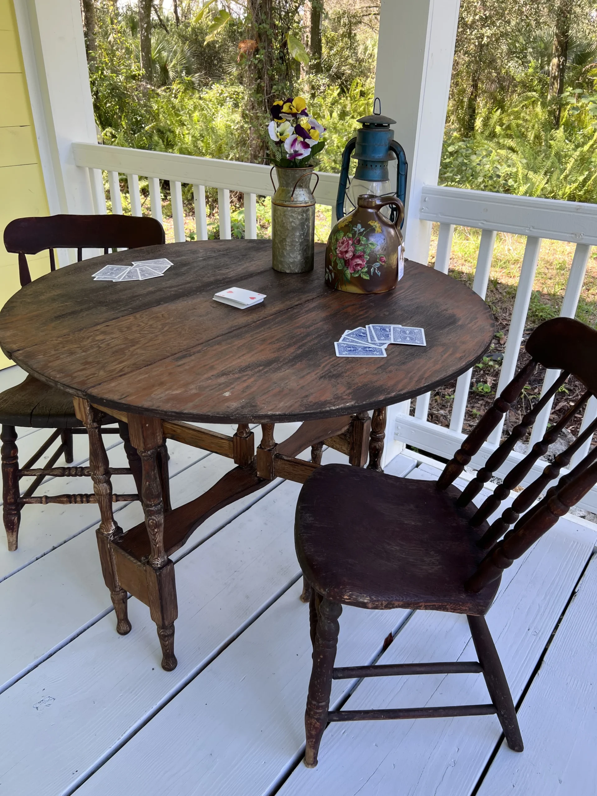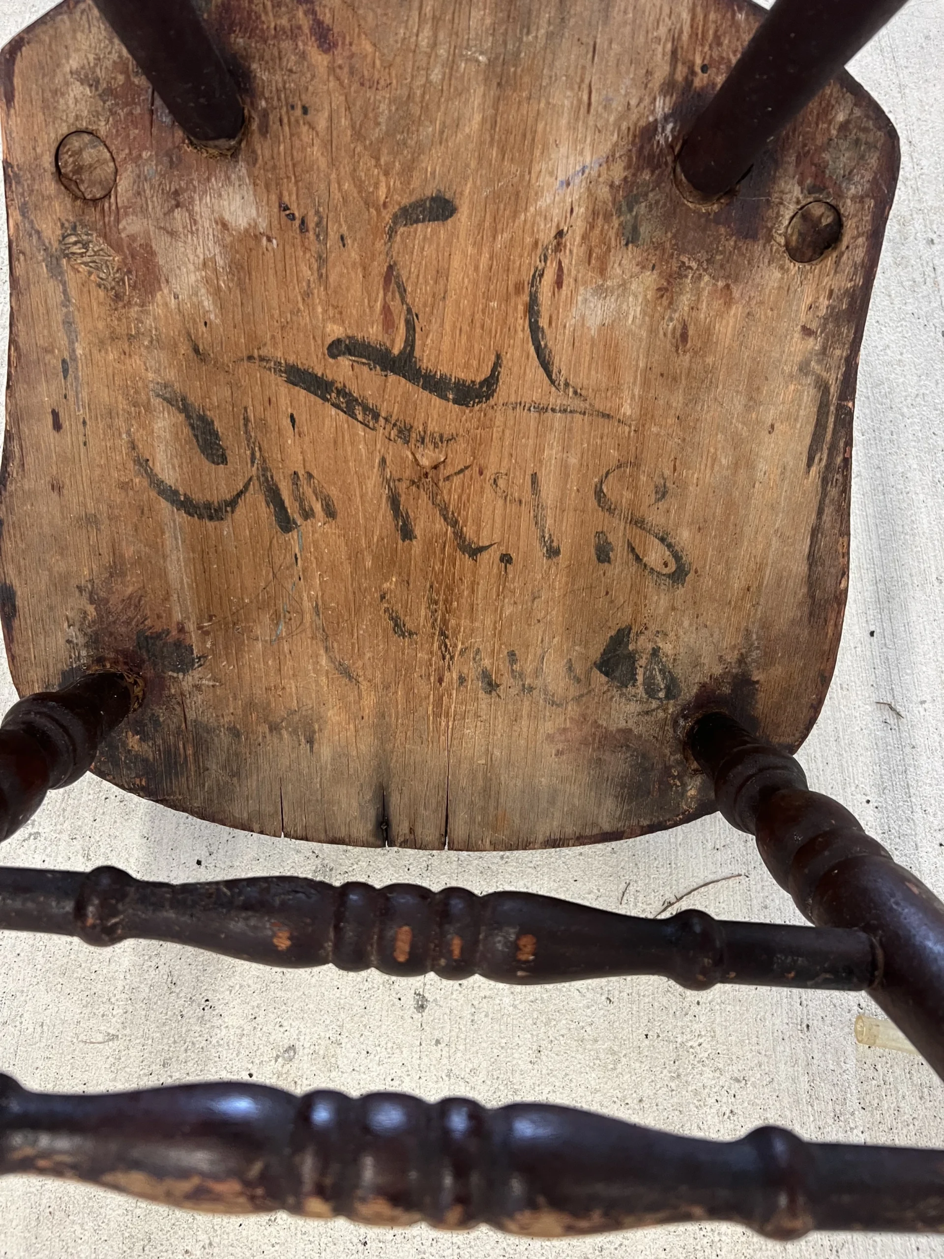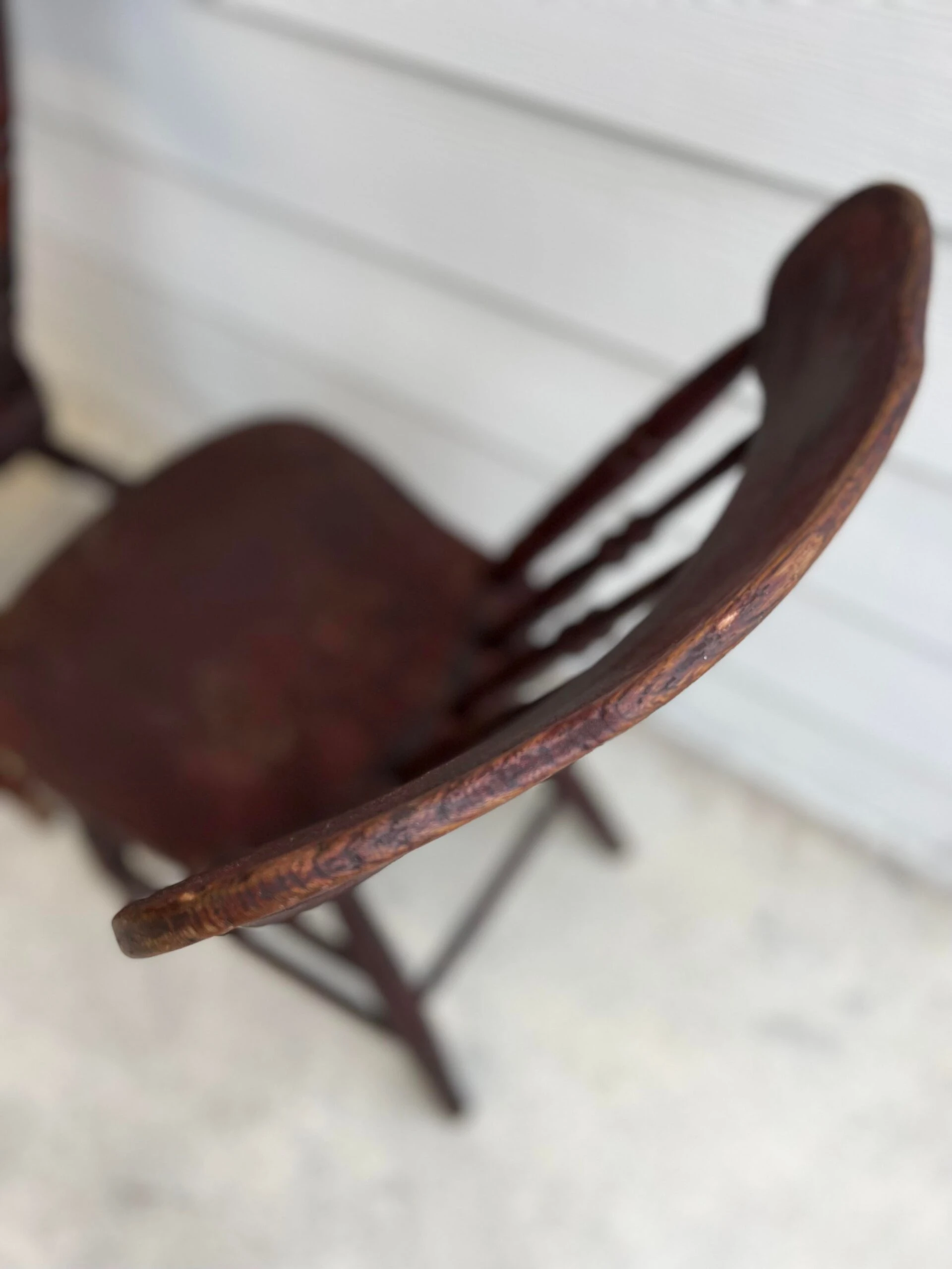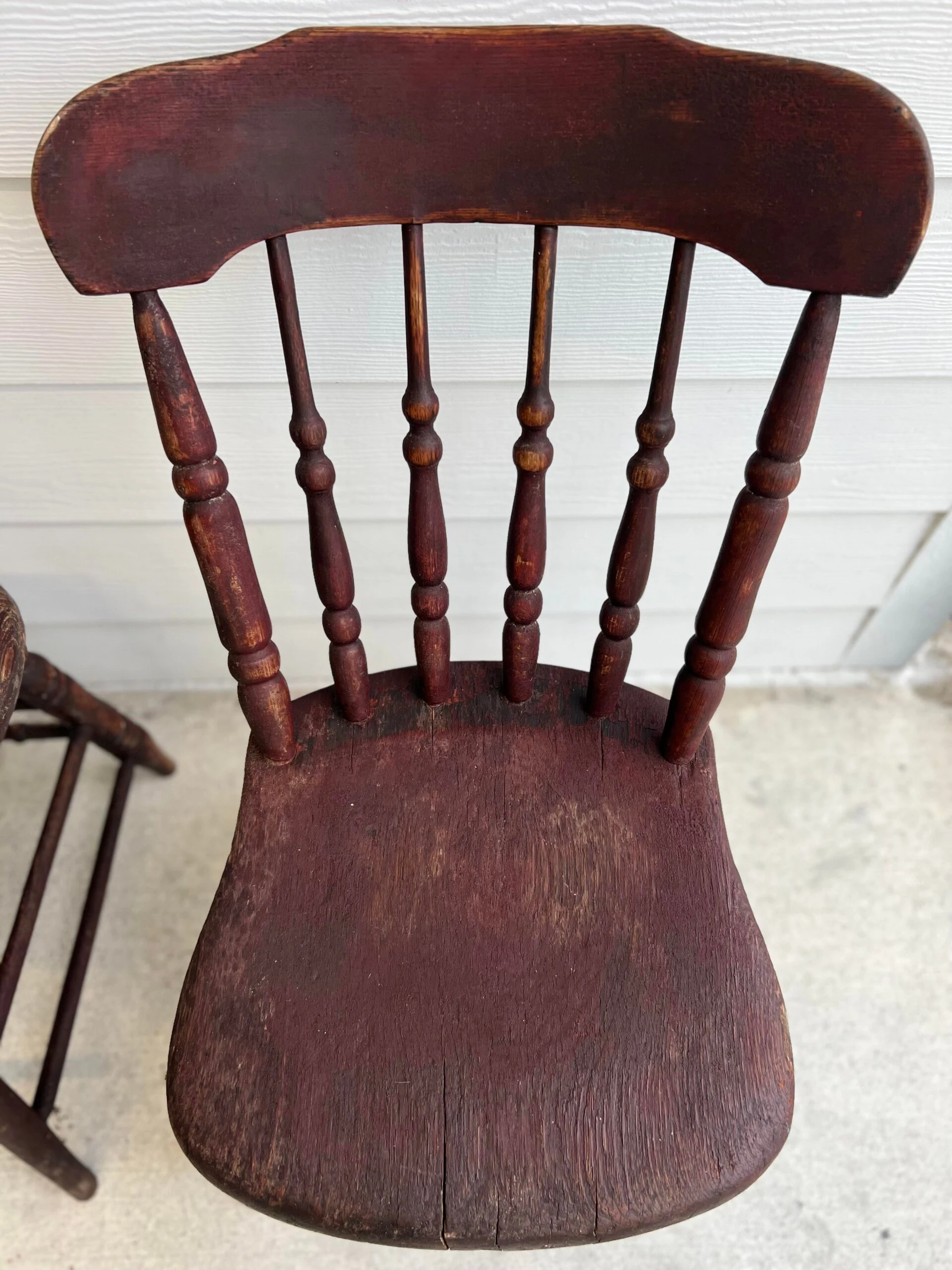 You will love the character and charm of this pair of primitive handmade antique wood dining chairs with original primitive red stain, circa 1850. They are in exceptional antique condition considering age and household use. The solid wood ( elm, ash or fruitwood) chairs have plank seats with spindle splayed slant back and matching double stretcher. One chair has hand signed name under seat bottom. Appraiser suggested it was to identify the owner during over country transport by train or other mode of transport. Place as a lovely warm accent side chairs / chair shelf in any room. Also love them styled on a breezy care free covered porch. The slant back makes for an enjoyable place to relax for sweet tea and tall tales with the neighbor folk. Partner with our primitive rustic drop leaf while available.