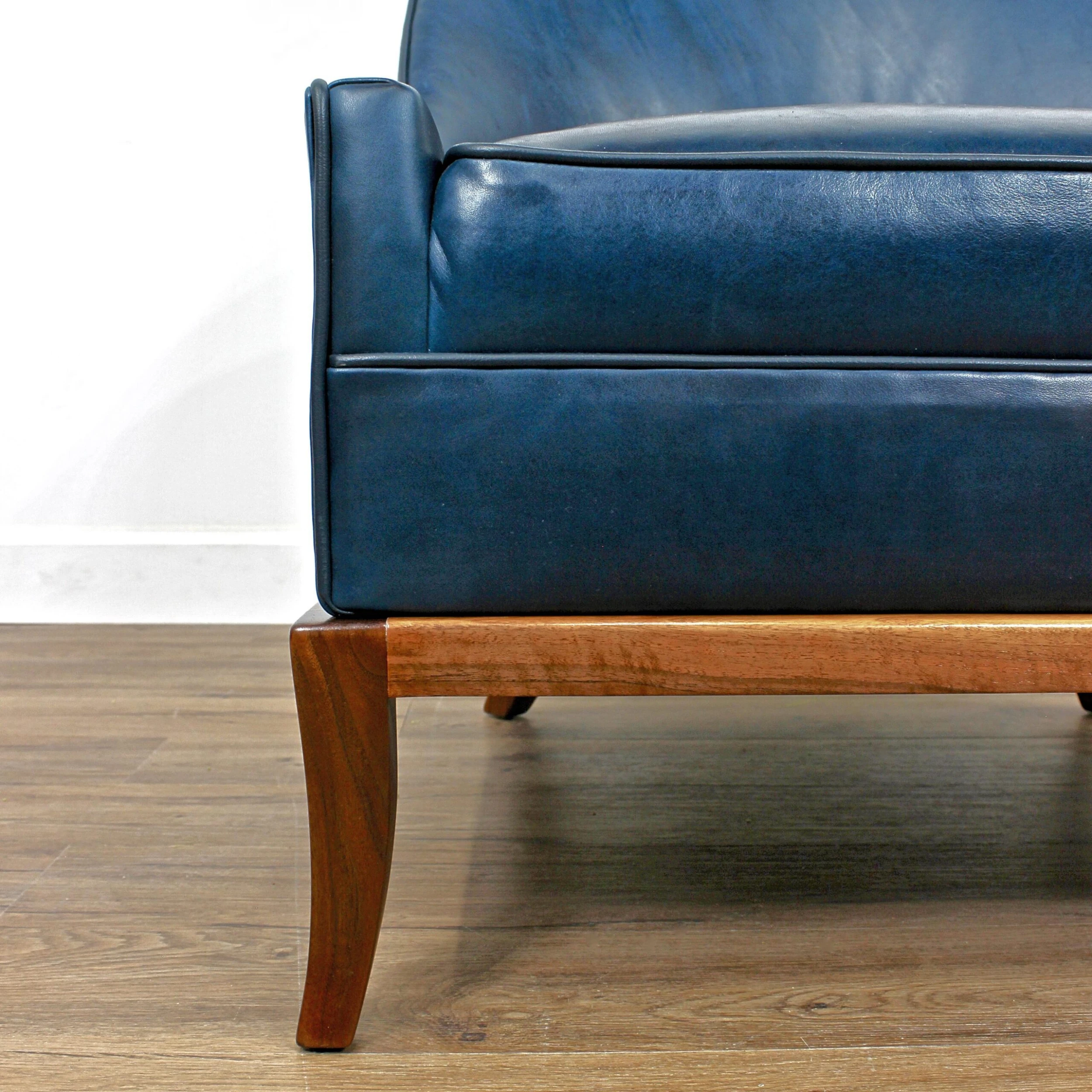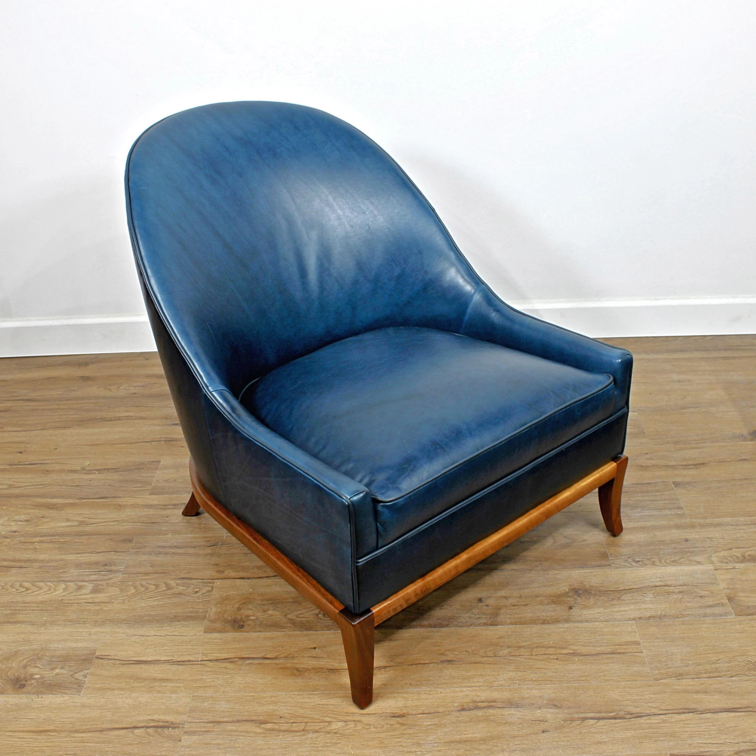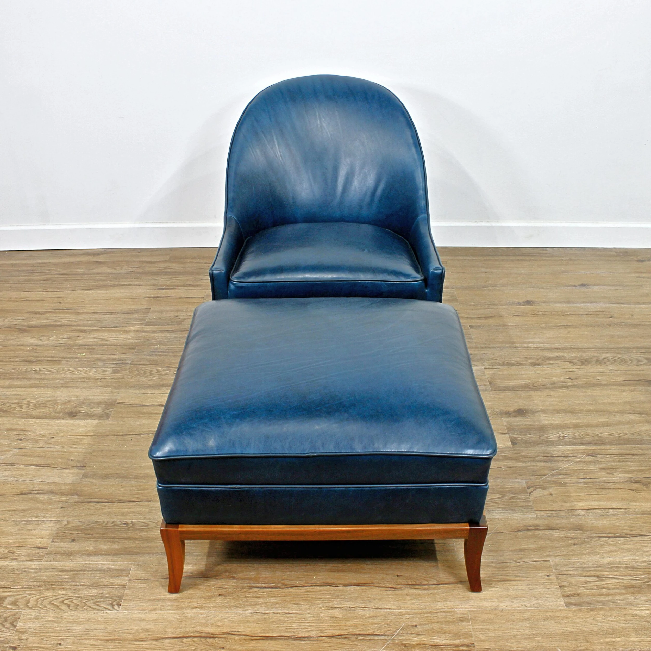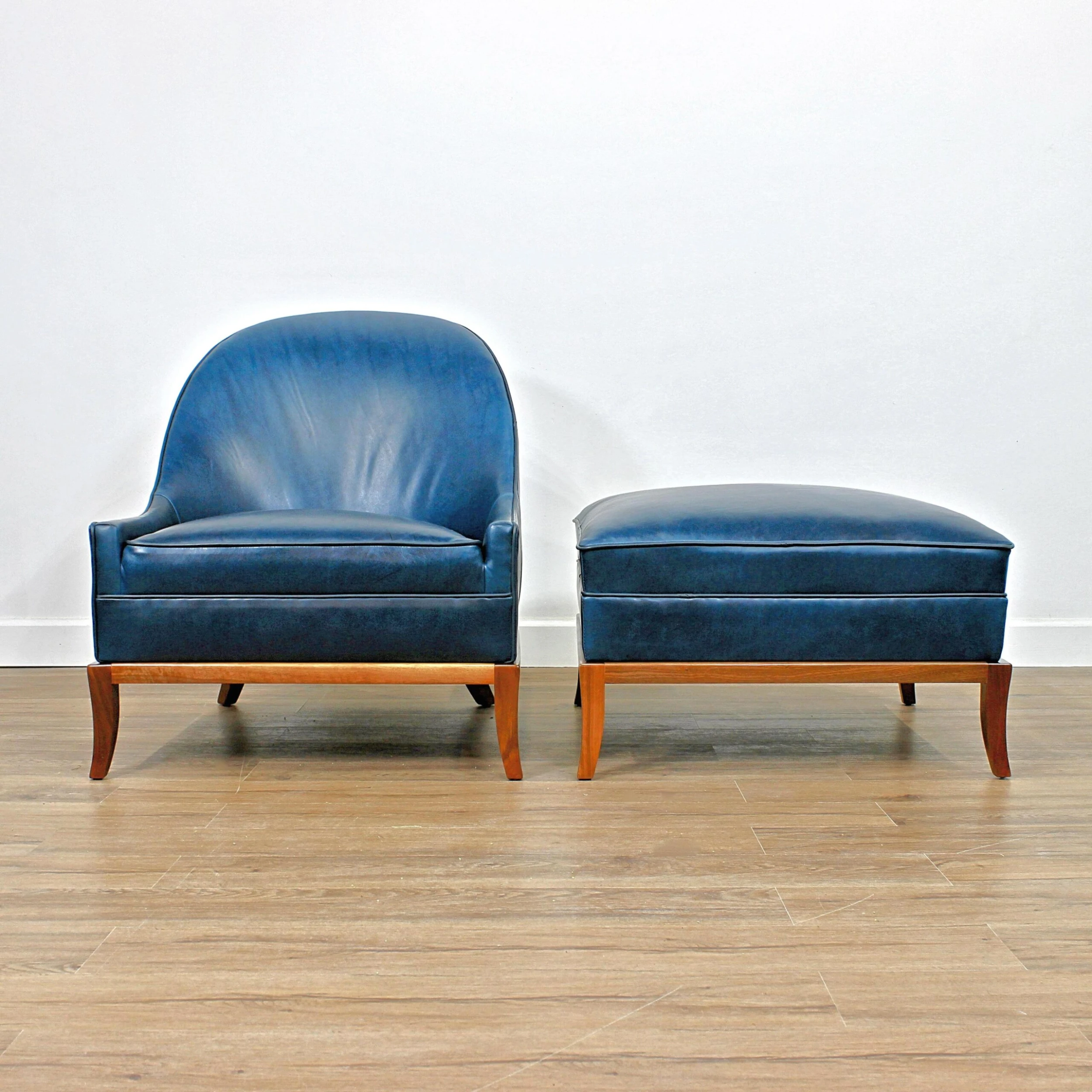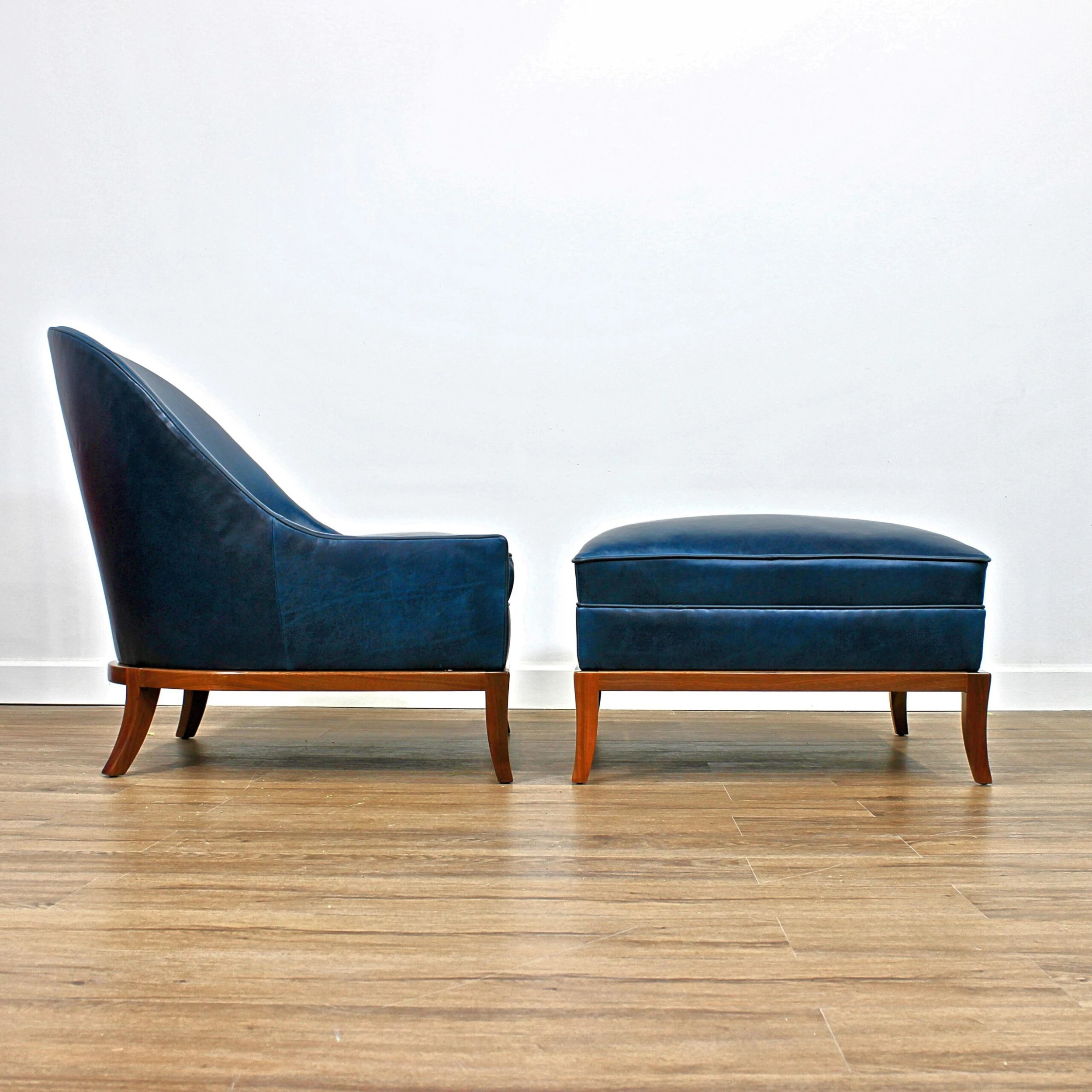 Gorgeous and exceedingly rare 1950’s Model 2043 lounge chair and ottoman by T.H. Robsjohn Gibbings for Widdicomb. Both chair and ottoman have been given a full restoration with professionally refinished walnut bases and deep sapphire blue Italian leather upholstery. In an effort to streamline both comfort and appearance the original button tufting detail has been deleted from the chair’s design. This is actually the only original ottoman I’ve come across after extensive research and was apparently produced in very limited quantities. The chair measures 26″ wide by 30.5″ tall and 28″ deep with a seat height of 14.5″. The ottoman is 26″ wide by 26″ deep with a corresponding height of 14.5″.