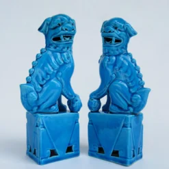 Vintage C1970’s-1980’s Ceramic Glazed Peacock Cerulean Blue Foo Dogs -A Pair