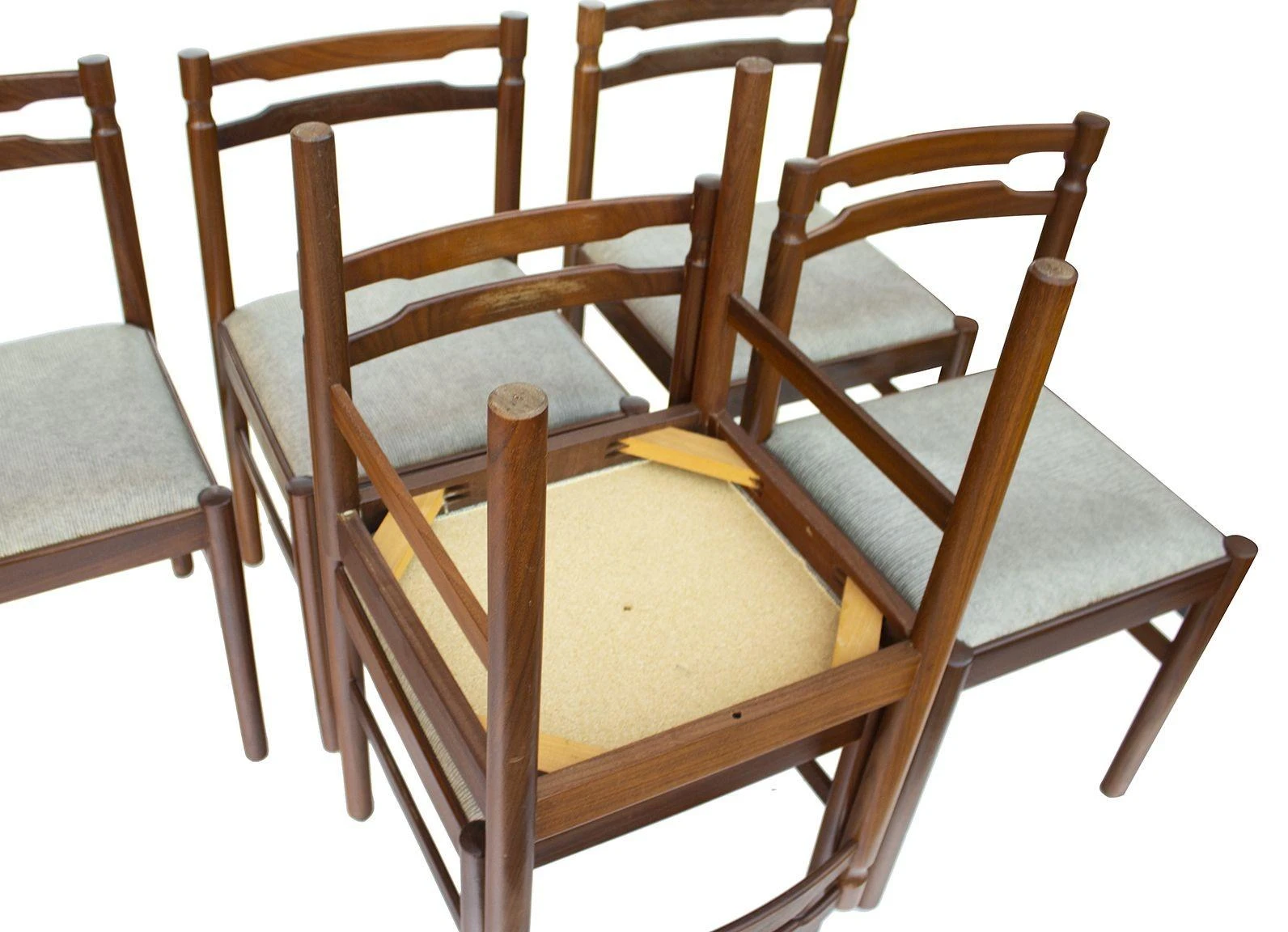 Set of six Scandinavian dining chairs in teak or rosewood. These are a nicely turned set in rich wood tones. Upholstery is in a textured neutral warm grey vinyl and it is in very good condition- usable as is with soft cushions. No maker’s marks remain.