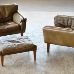 Pair Of 1960’s Olive Brown Leather Lounge Chairs With Ottoman By Illum Wikkelsø