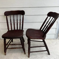 Primitive Rustic Farmhouse Slant Back Plank Seat Antique Pine Chairs, A Pair, Circa 1850’s