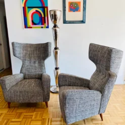 Renzo Zavanella Attributed 1950’s Pair Of Wingback Armchairs Newly Reupholstered In Tweed
