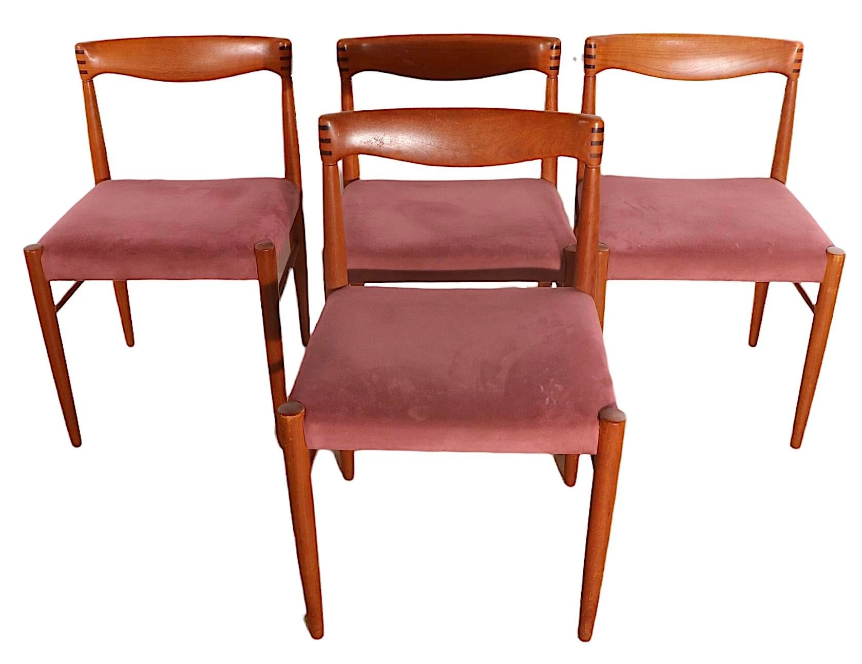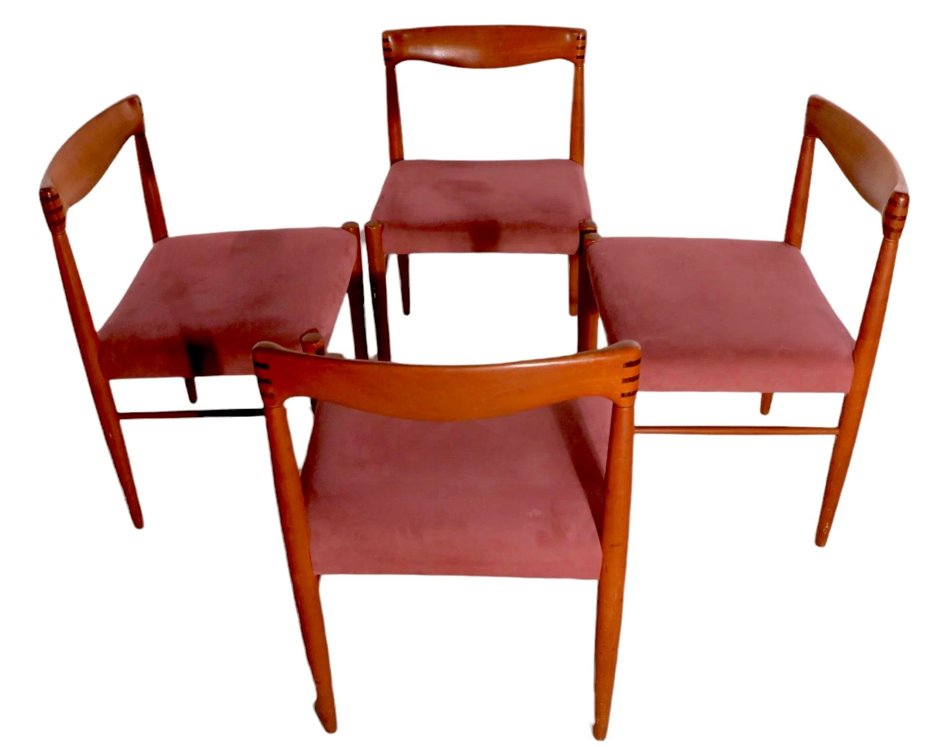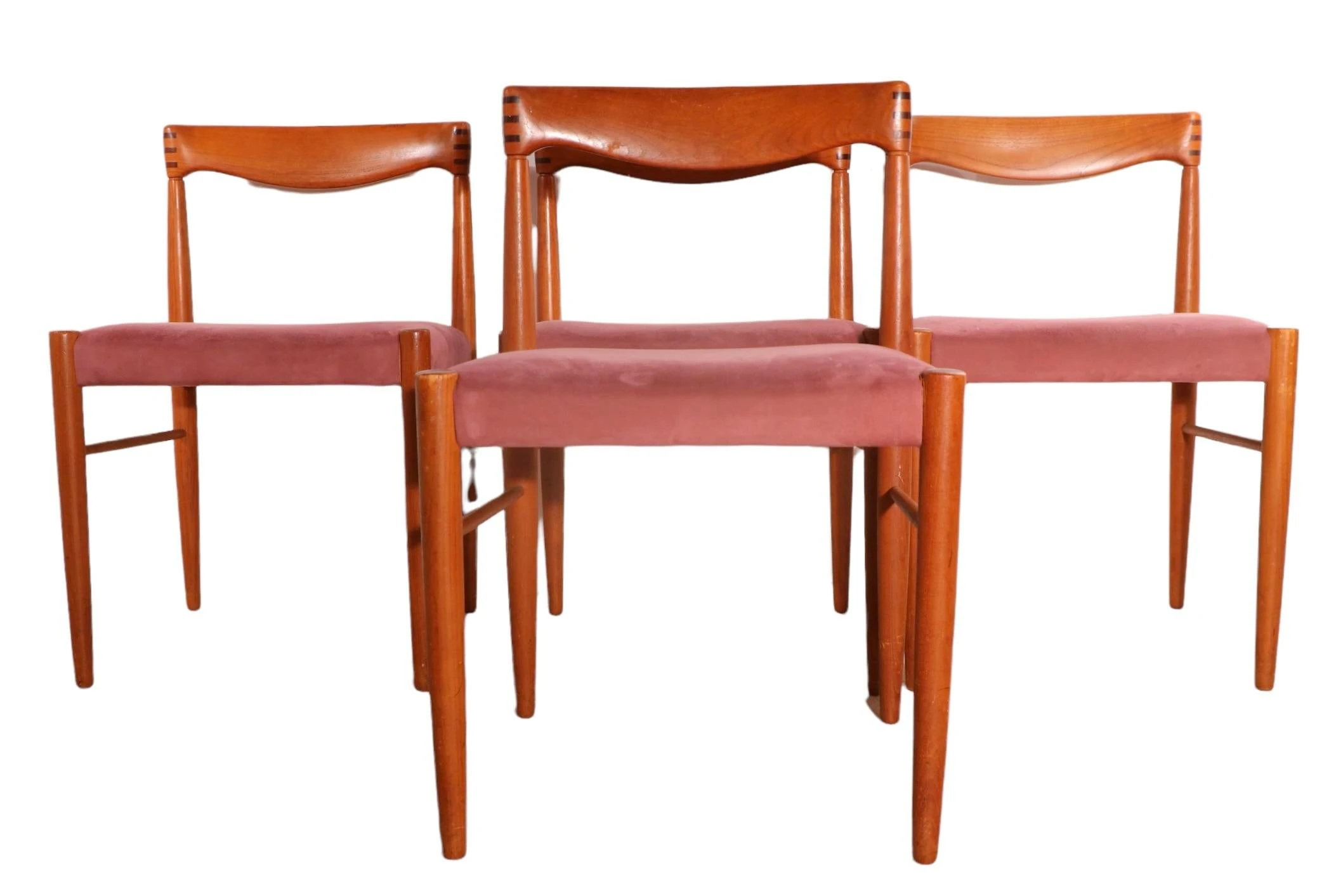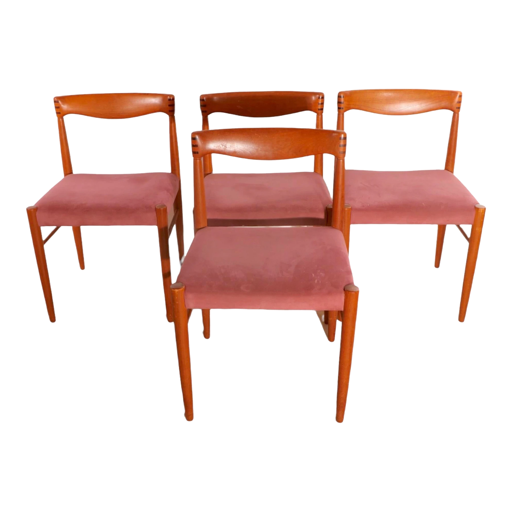 Nice set of four teak and rosewood chairs designed by H W Klein for Bramin, Made in Denmark, circa 1960’s. The chairs are all in very fine, original condition, clean and ready to use. The chairs feature exposed rosewood joinery at the top of the back support, which adds to the beauty and sophistication of the design. The seats are salmon/pink ultra suede, which is still serviceable, but shows some minor cosmetic wear, normal and consistent with age. offered and priced as a set of four.