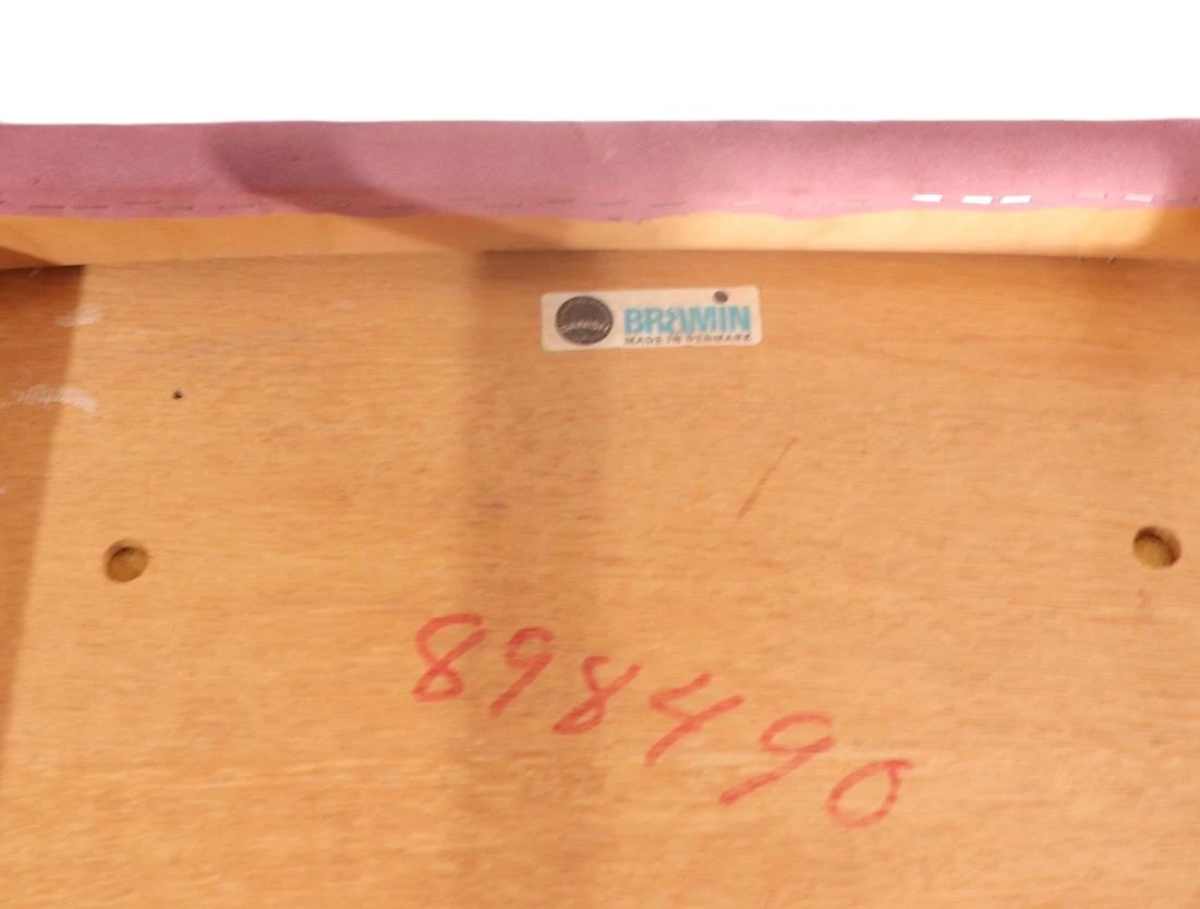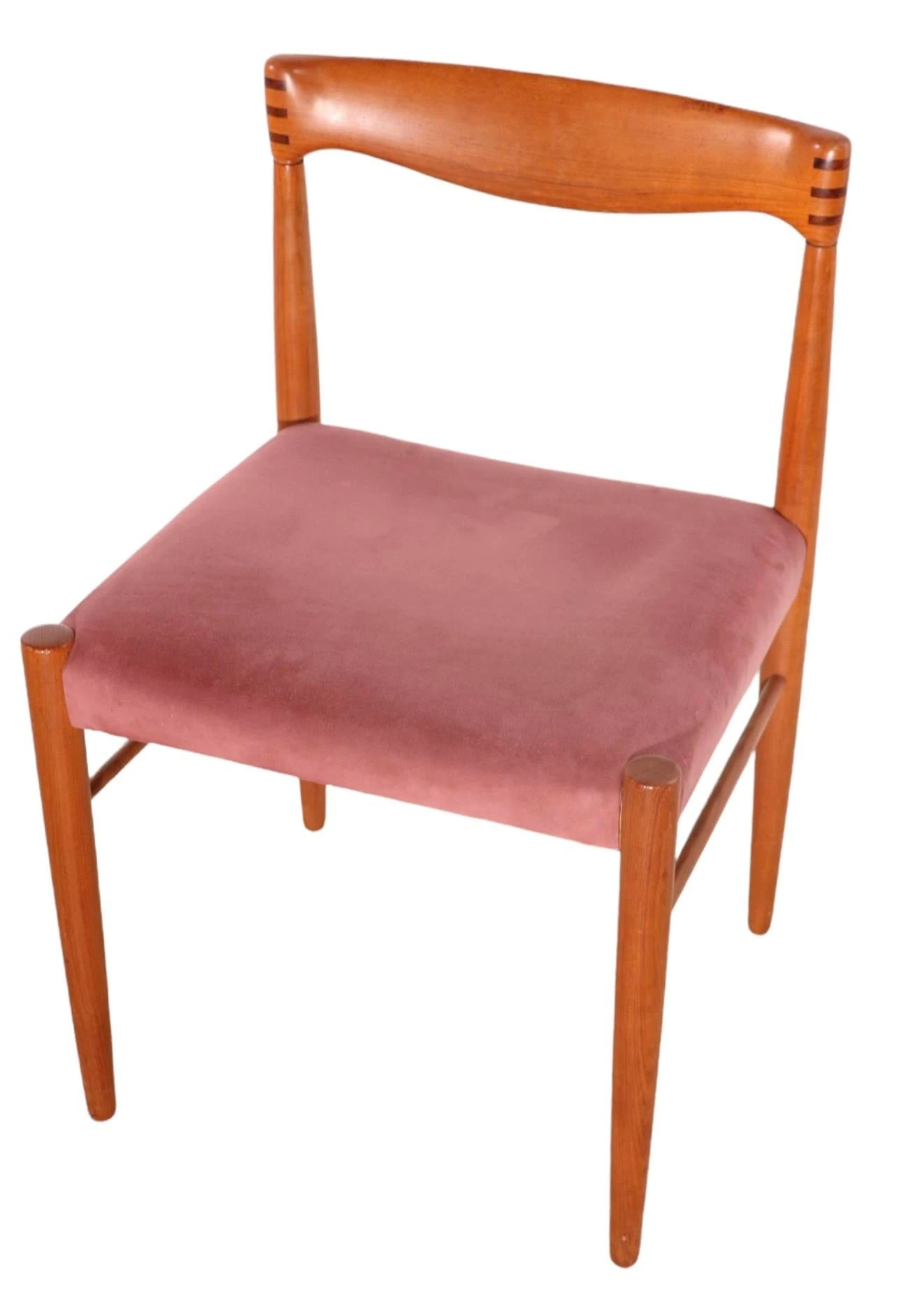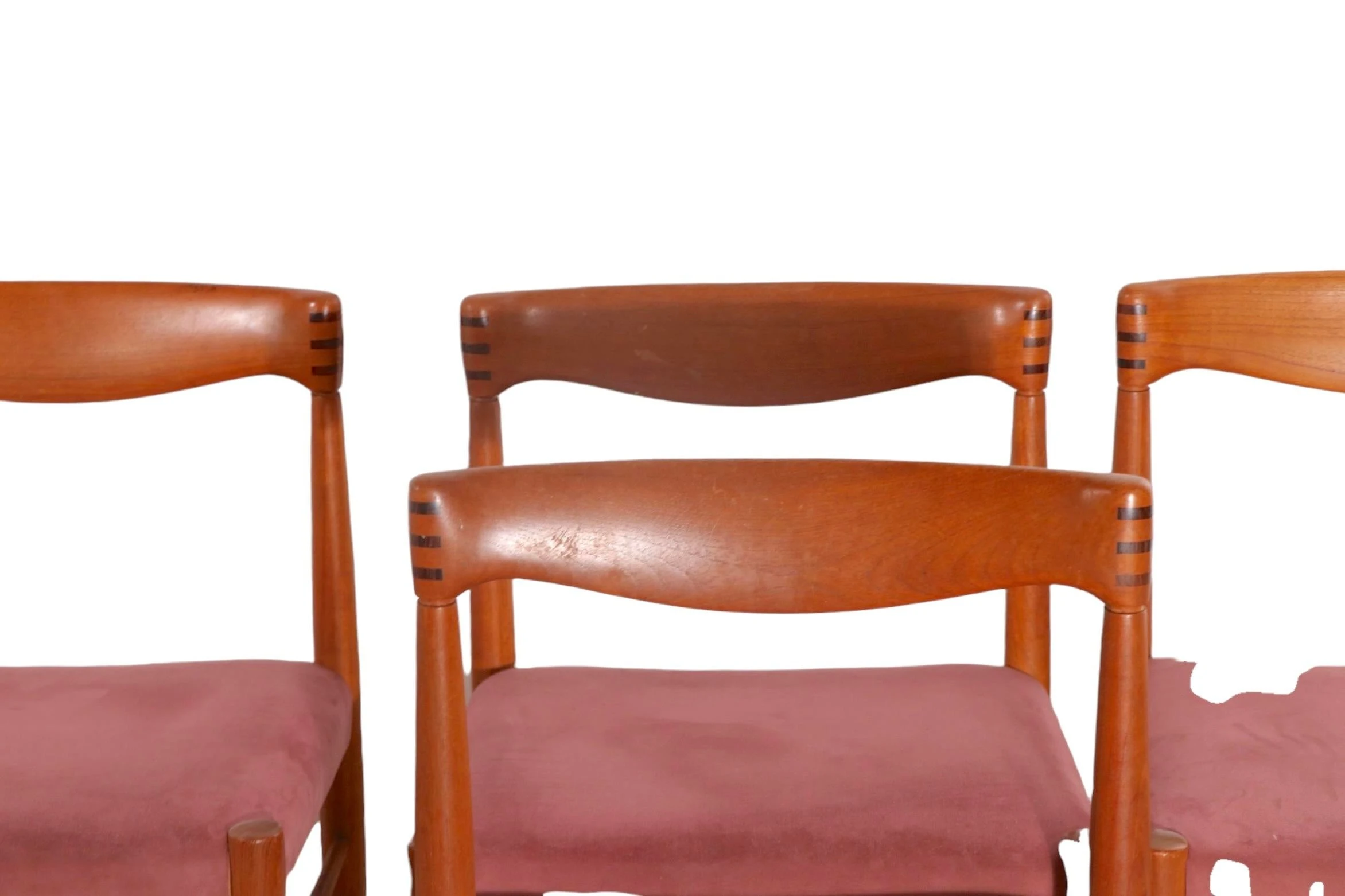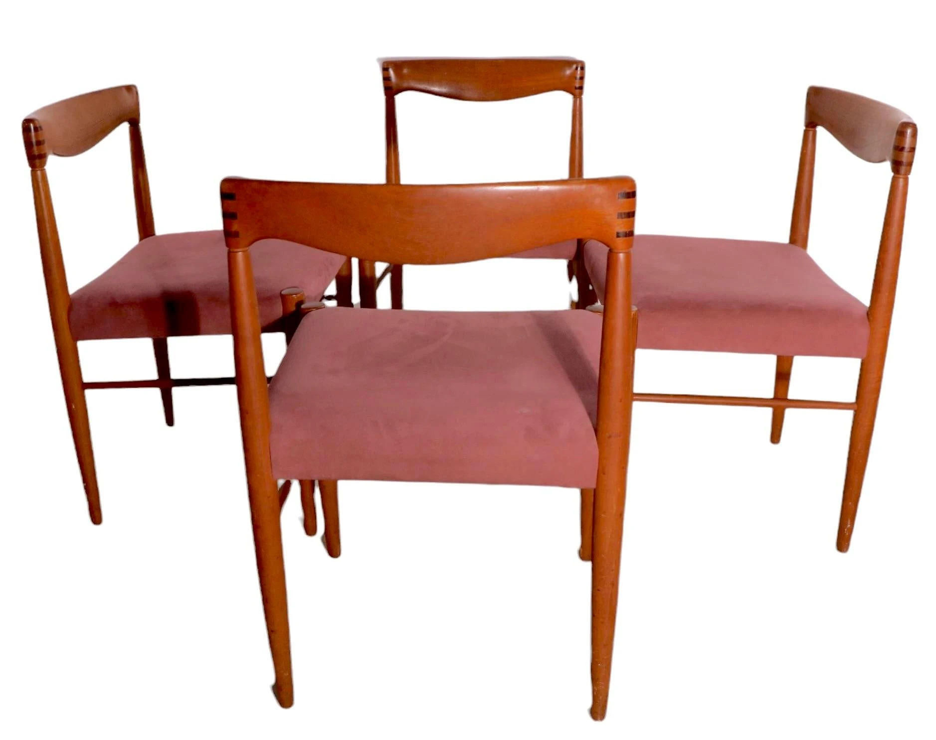 Nice set of four teak and rosewood chairs designed by H W Klein for Bramin, Made in Denmark, circa 1960’s. The chairs are all in very fine, original condition, clean and ready to use. The chairs feature exposed rosewood joinery at the top of the back support, which adds to the beauty and sophistication of the design. The seats are salmon/pink ultra suede, which is still serviceable, but shows some minor cosmetic wear, normal and consistent with age. offered and priced as a set of four.