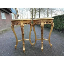1990’s French Louis XVI Style Side Tables In Gold With Beige Marble Top – A Pair