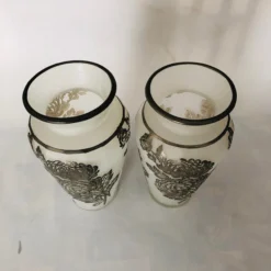 Vintage Frosted Glass Silver Overlay Floral Design Vases S/2
