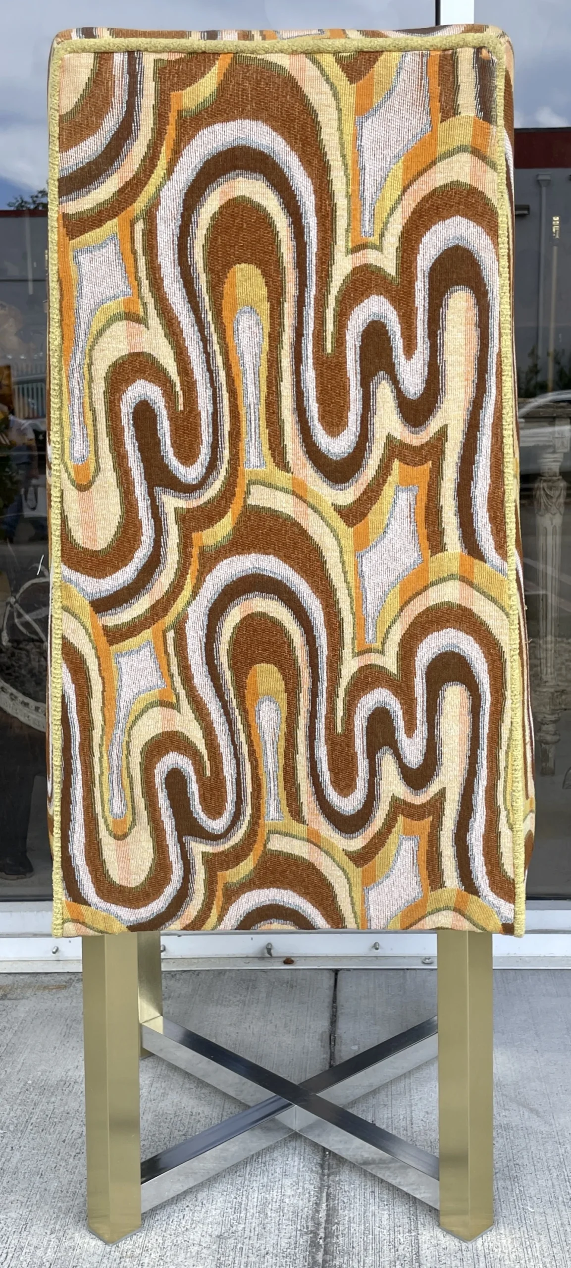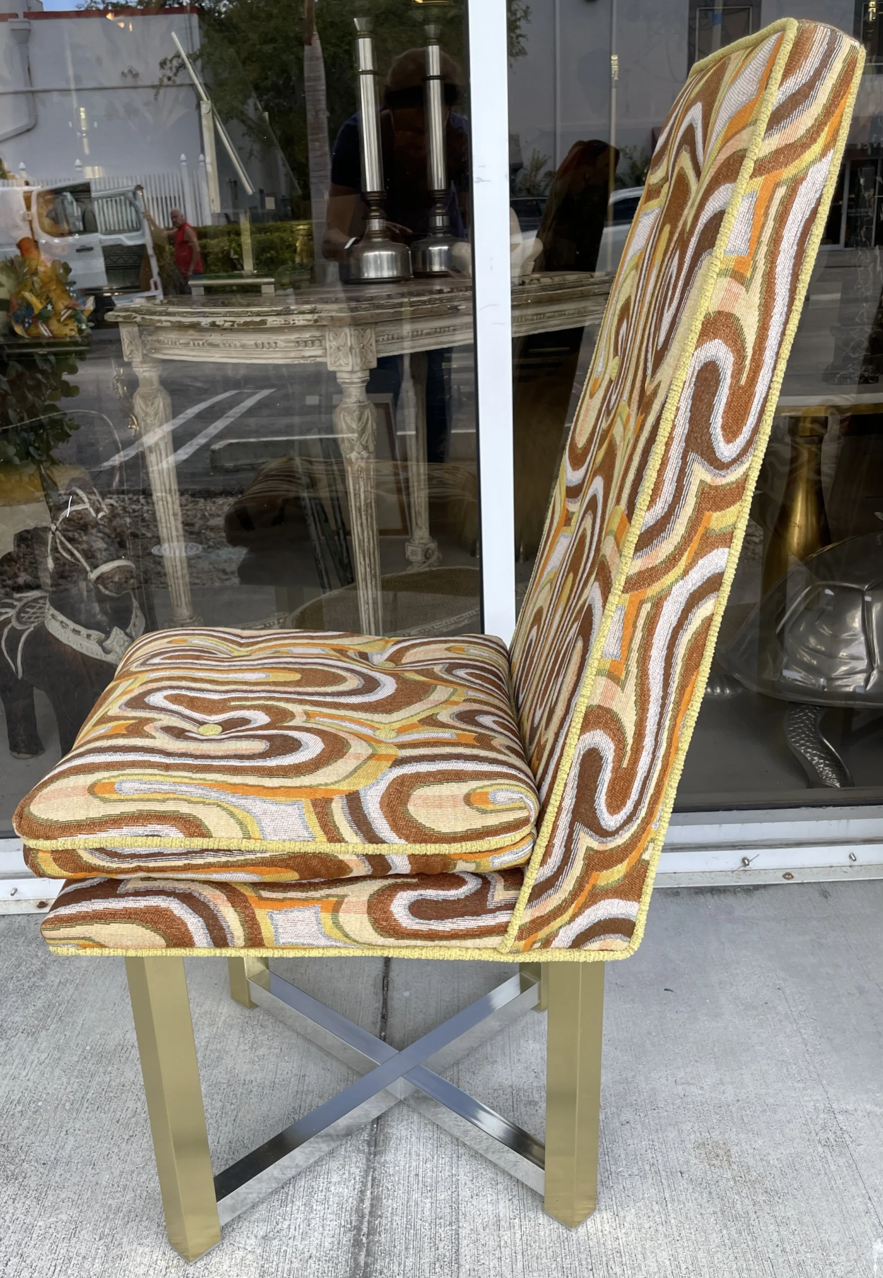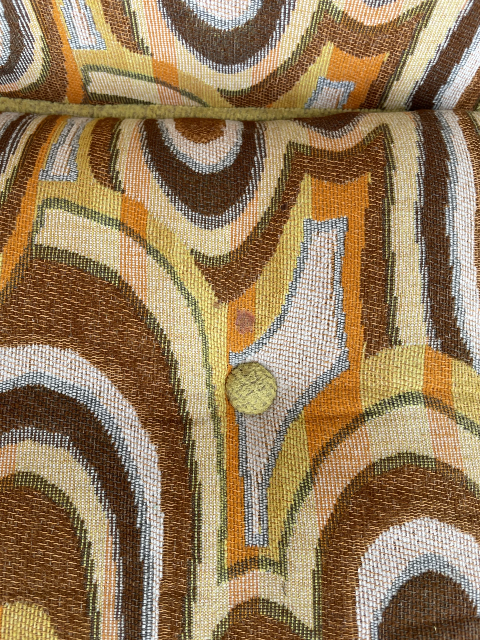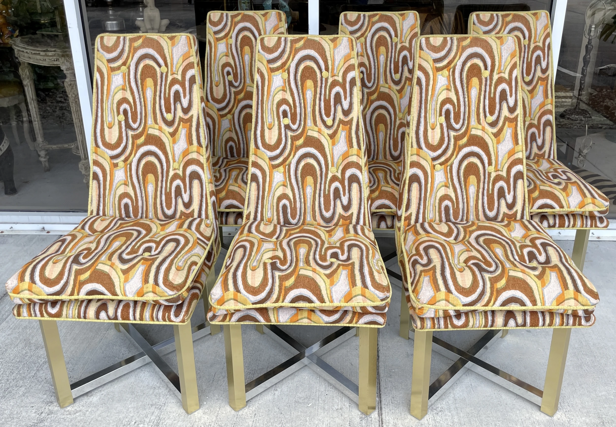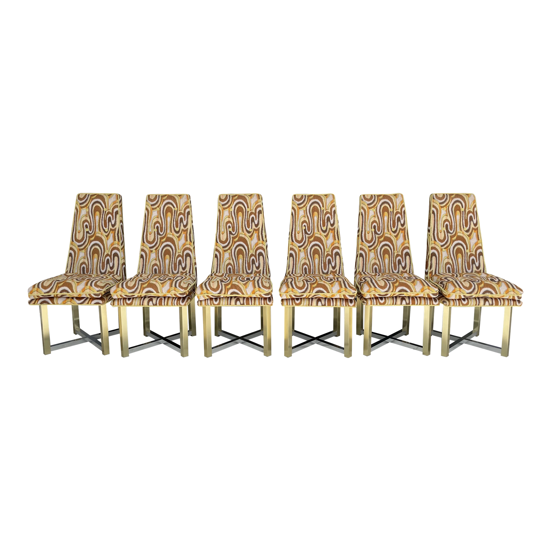 Space age cool set of 6 dining chairs from late 60’s. Incredibly catching fabric with legs in silver and gold aluminum. Fabric is original and has a wave pattern mixing tones of browns, yellow and orange on a lighter base. Some stains and one small cut. All these issues are shown in pictures and are hardly noticeable. Metal shows light wear with no oxidation. Chairs backs slightly move.