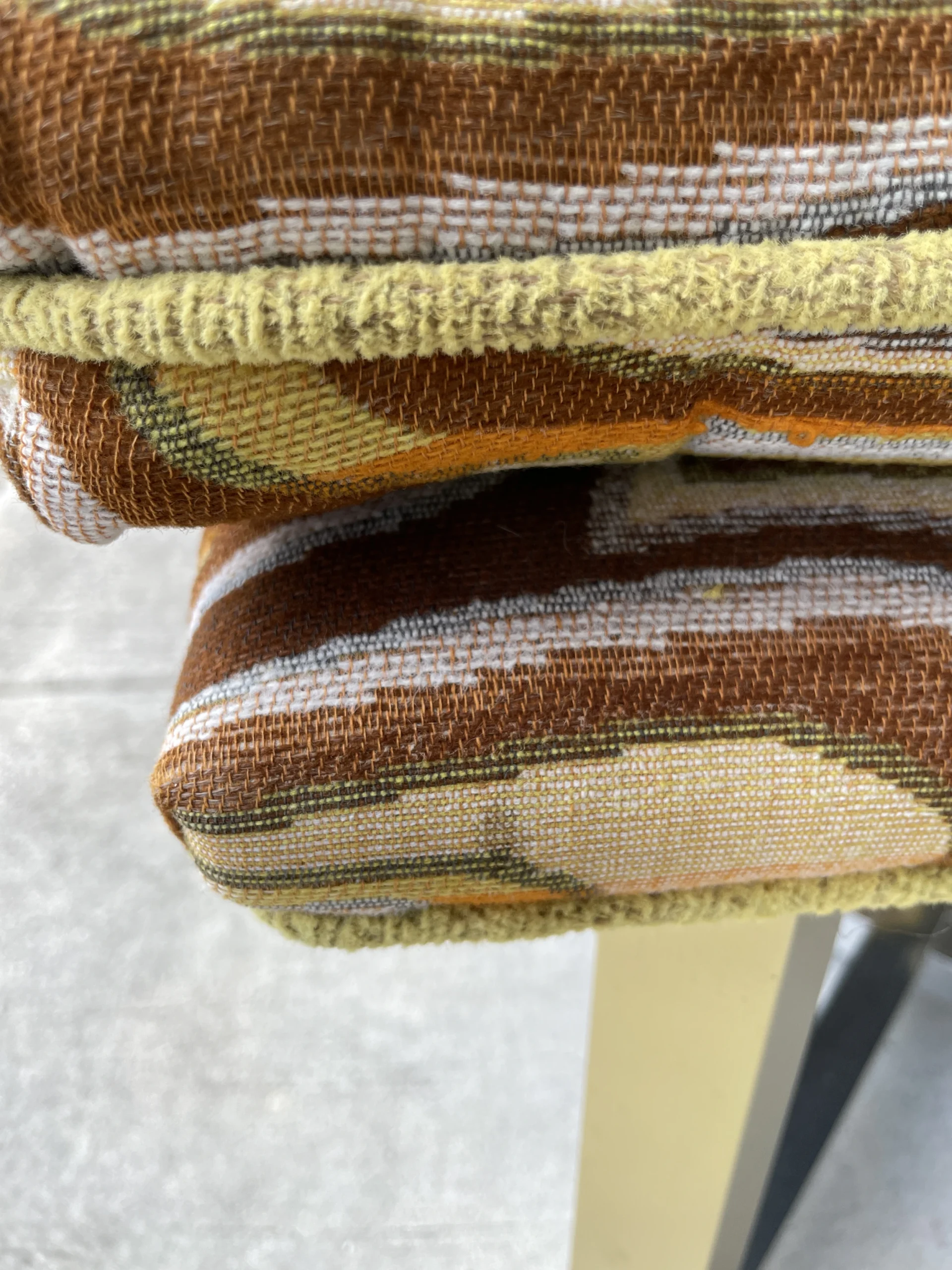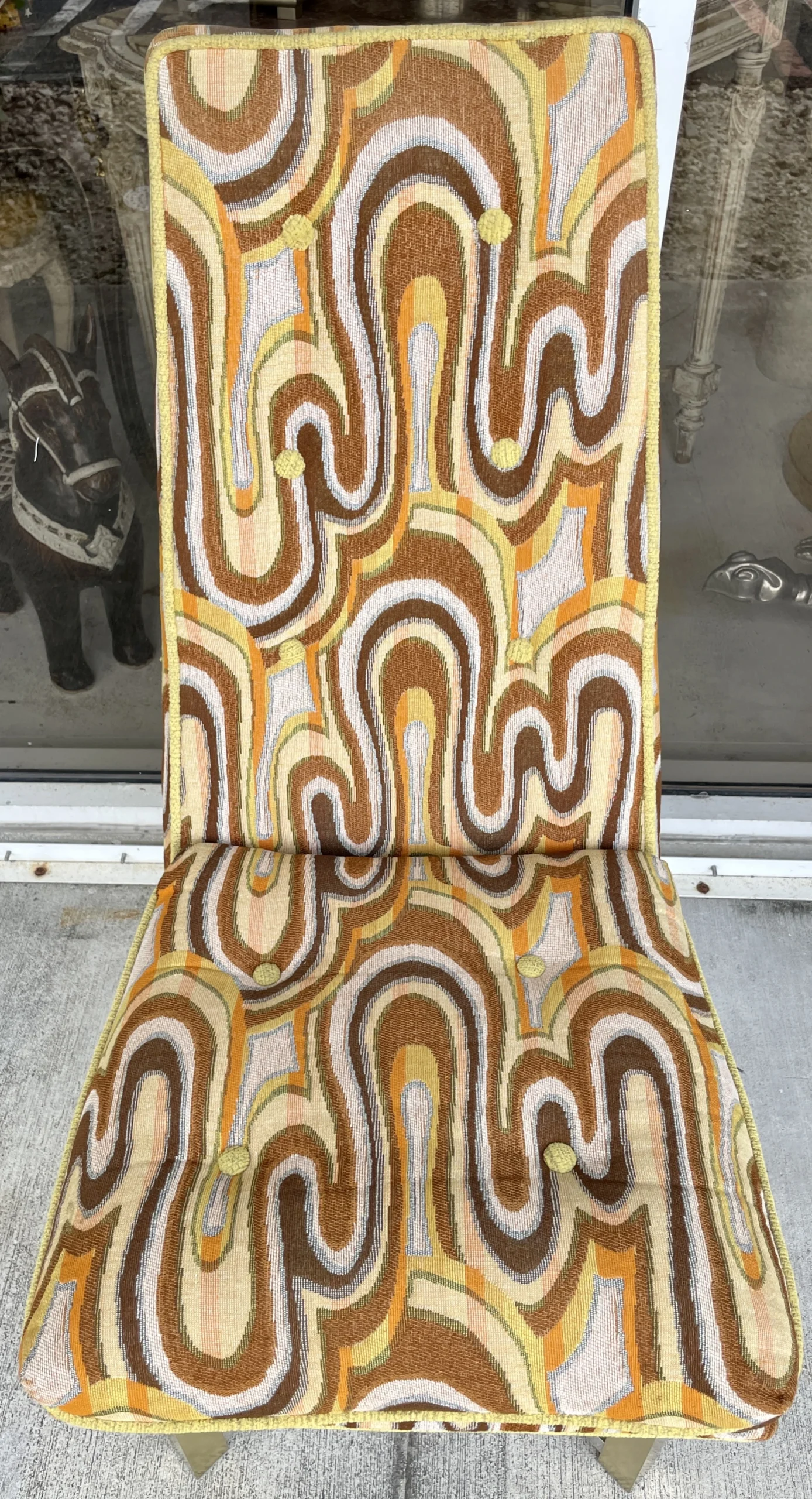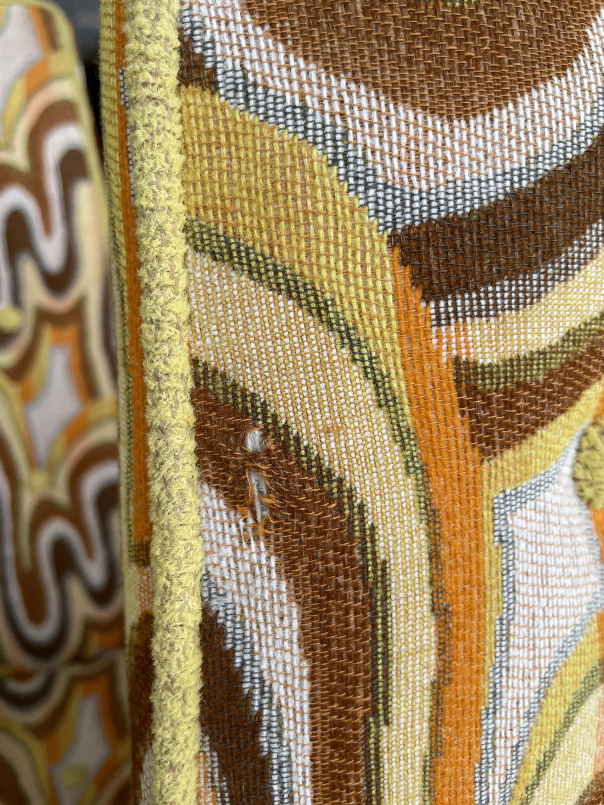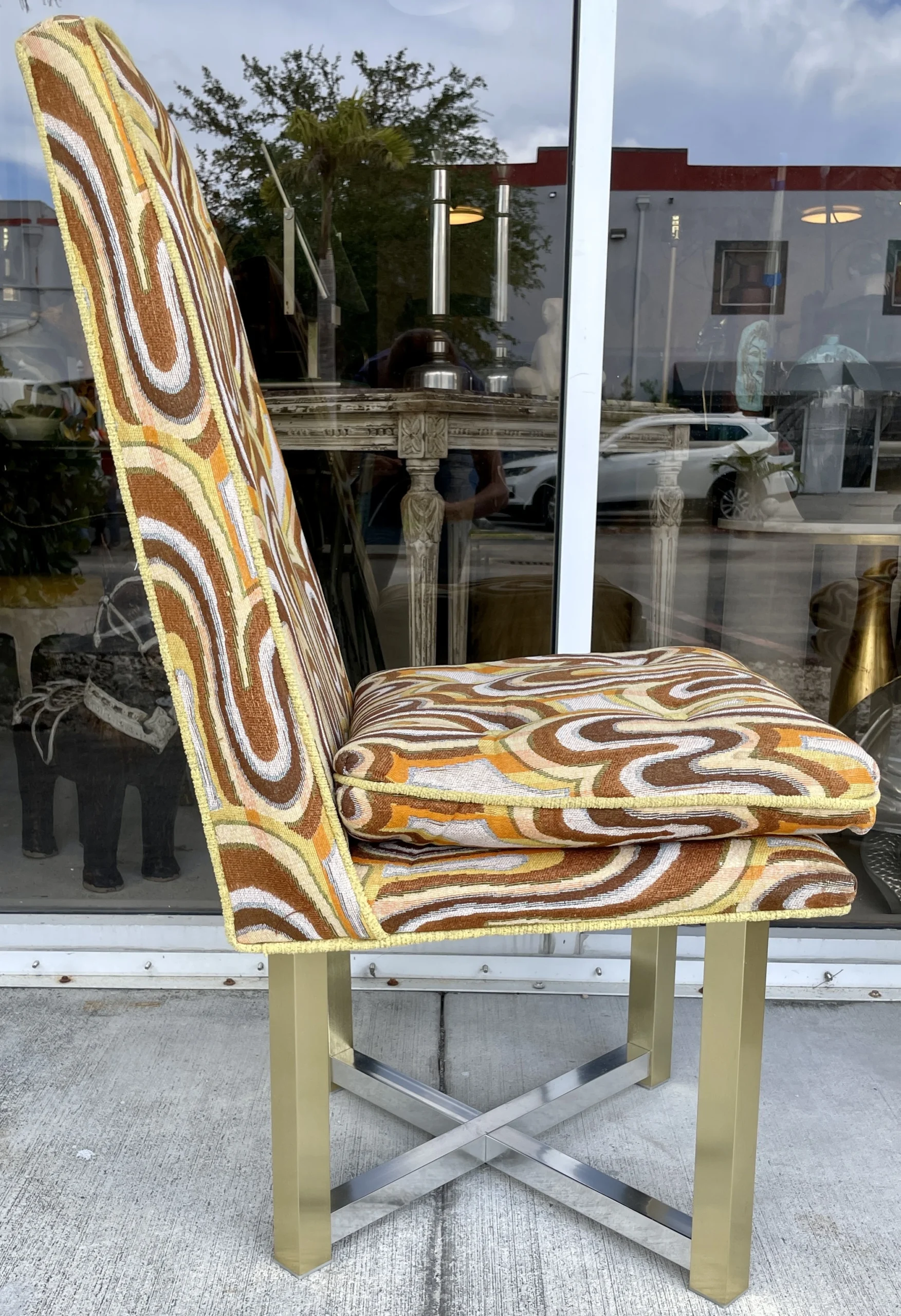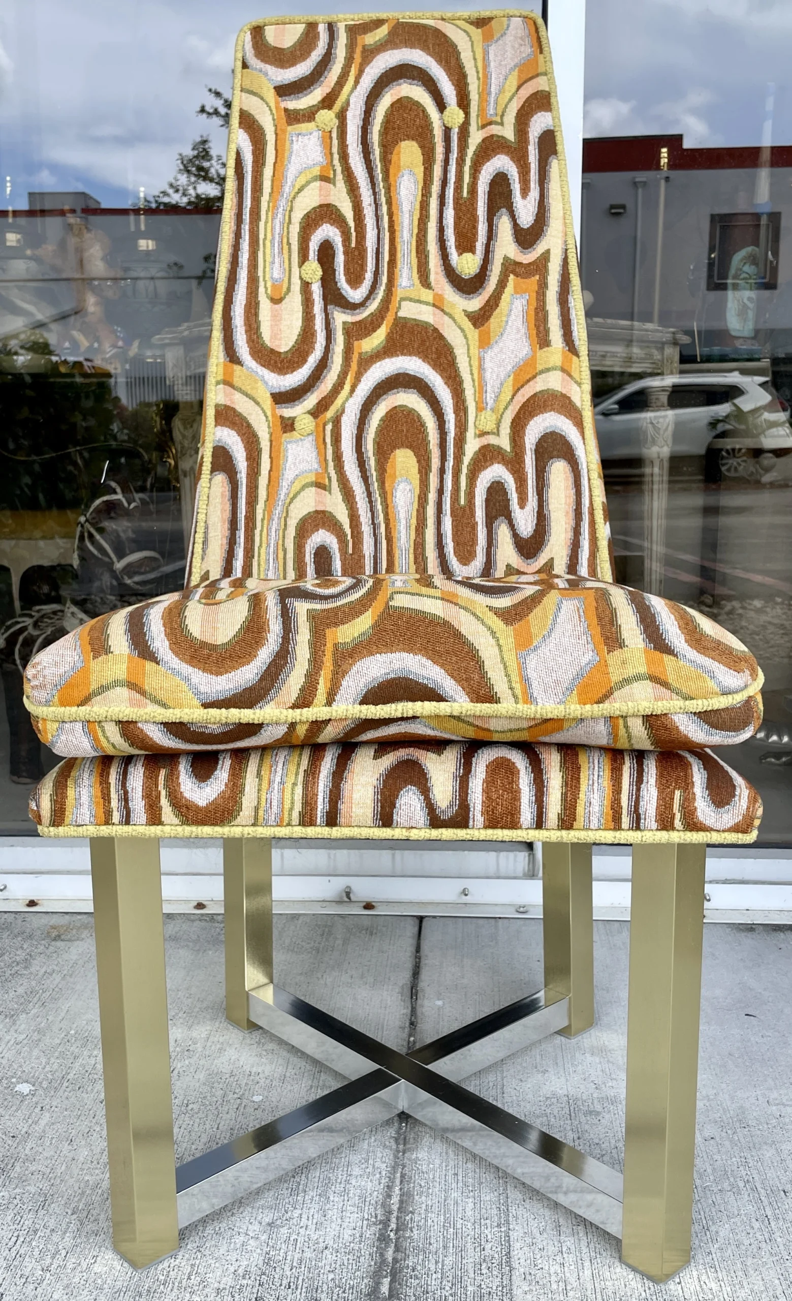 Space age cool set of 6 dining chairs from late 60’s. Incredibly catching fabric with legs in silver and gold aluminum. Fabric is original and has a wave pattern mixing tones of browns, yellow and orange on a lighter base. Some stains and one small cut. All these issues are shown in pictures and are hardly noticeable. Metal shows light wear with no oxidation. Chairs backs slightly move.