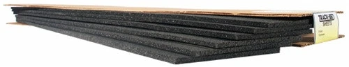 There are six Sheets in this package. These Sheets are great for railyards or sidings. The Sheets are 5mm x 5″x 24″. Track-Bed requires no pre-soaking like cork does: it remains flexible and won’t dry out or become brittle! It aligns well with cork or Homasote applications. Install Track-Bed with Foam Tack Glue (ST1444). Pin in place with Foam Nails (ST1432).