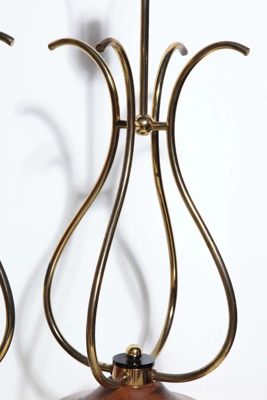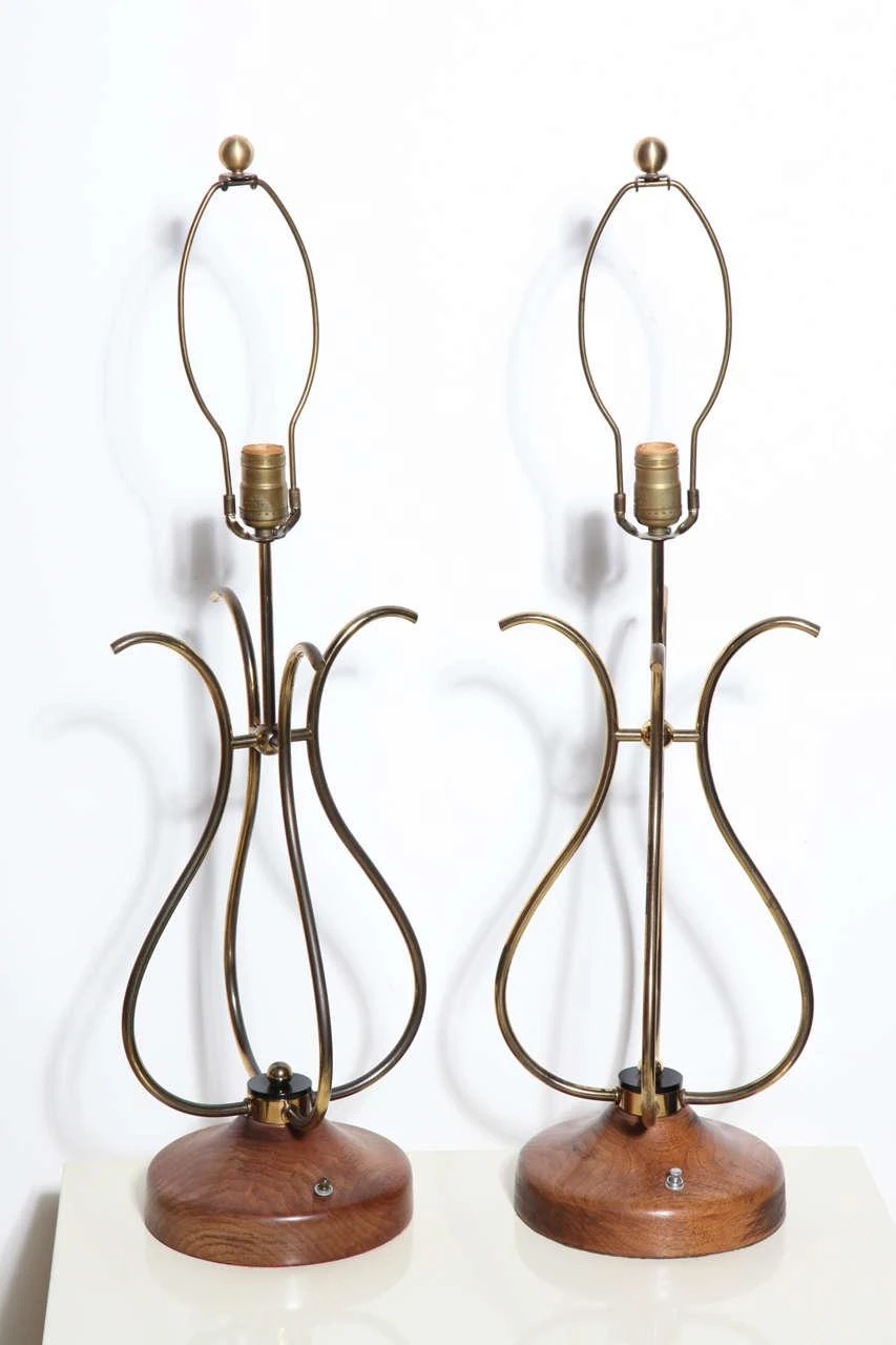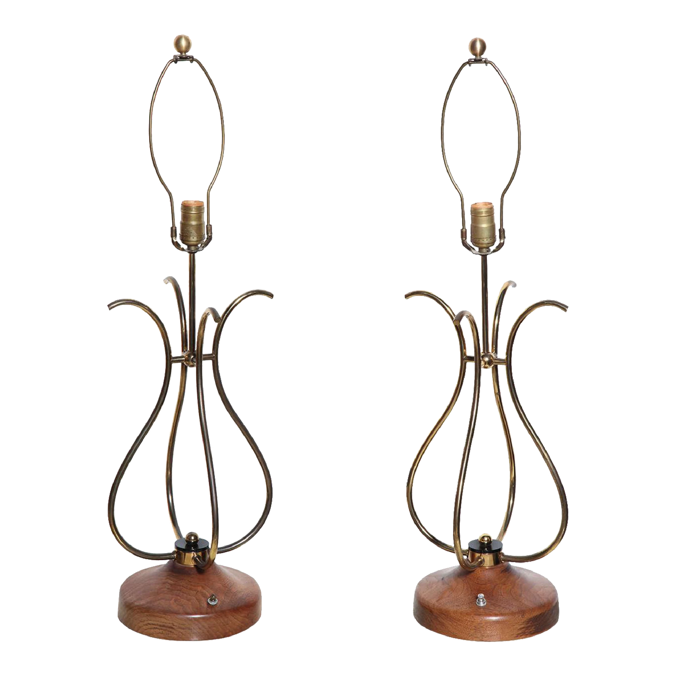 Pair of sculptural french style scrolled Brass Wire and Walnut Table Lamps. Featuring four joined curved S shape patinated Brass wire forms, a lightly restored solid grained Walnut 8D base with Black Lucite disks and Brass knob detail. Standard sockets. Base switch. Musical. Lyrical. Resembling Treble Clef.