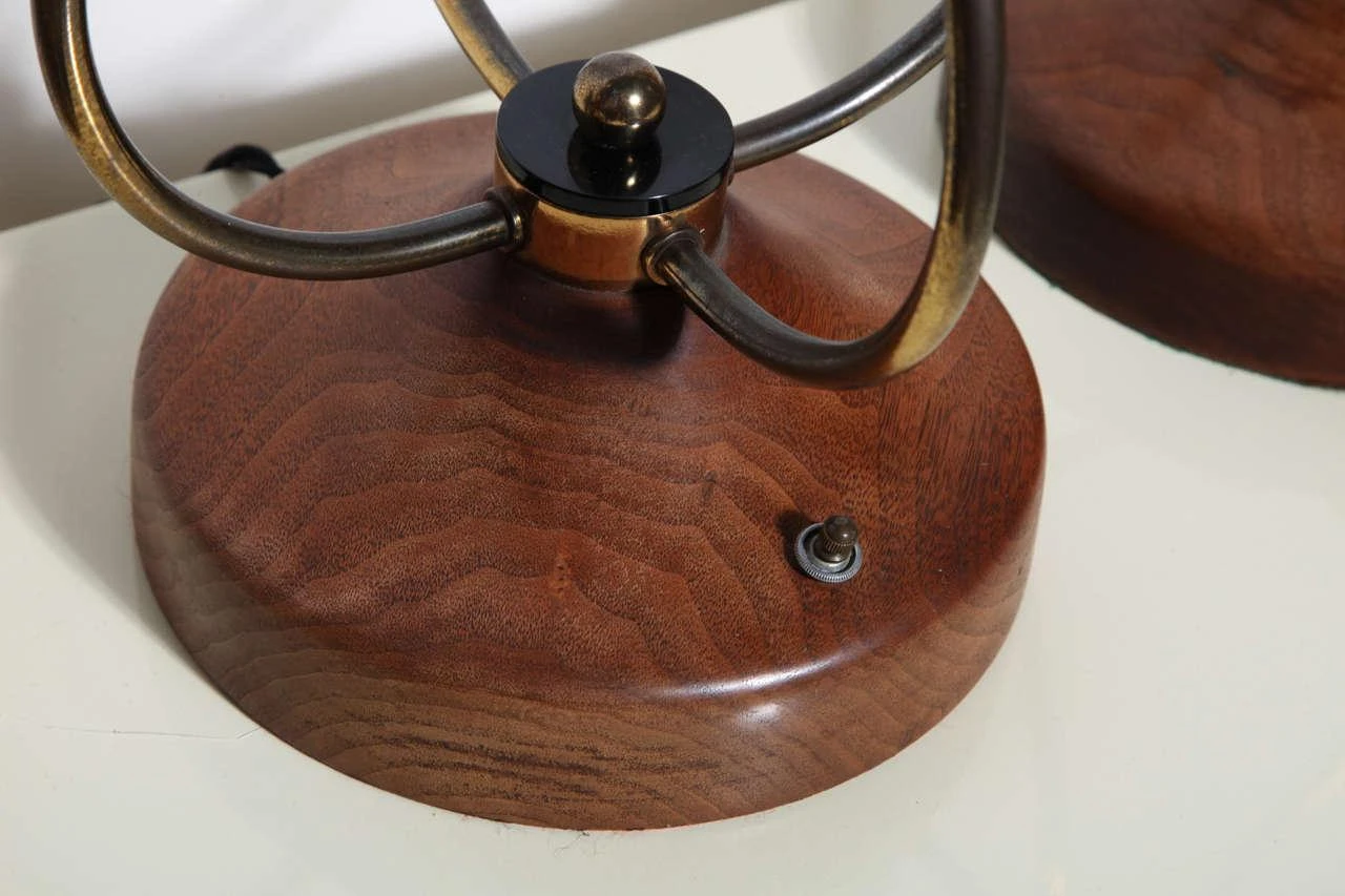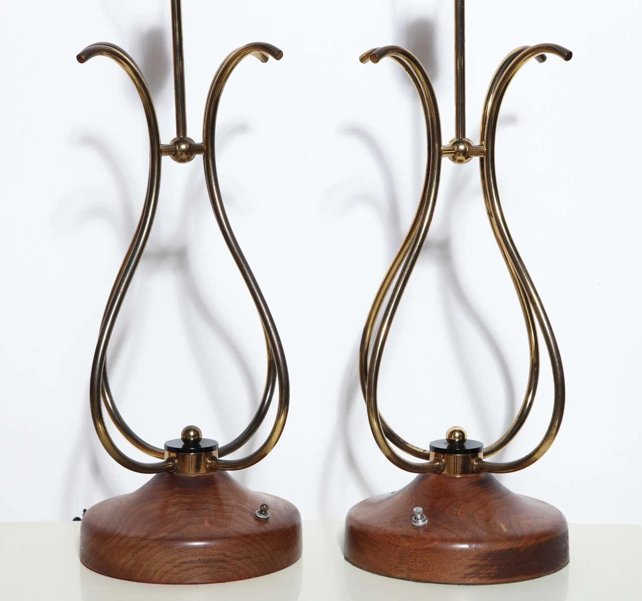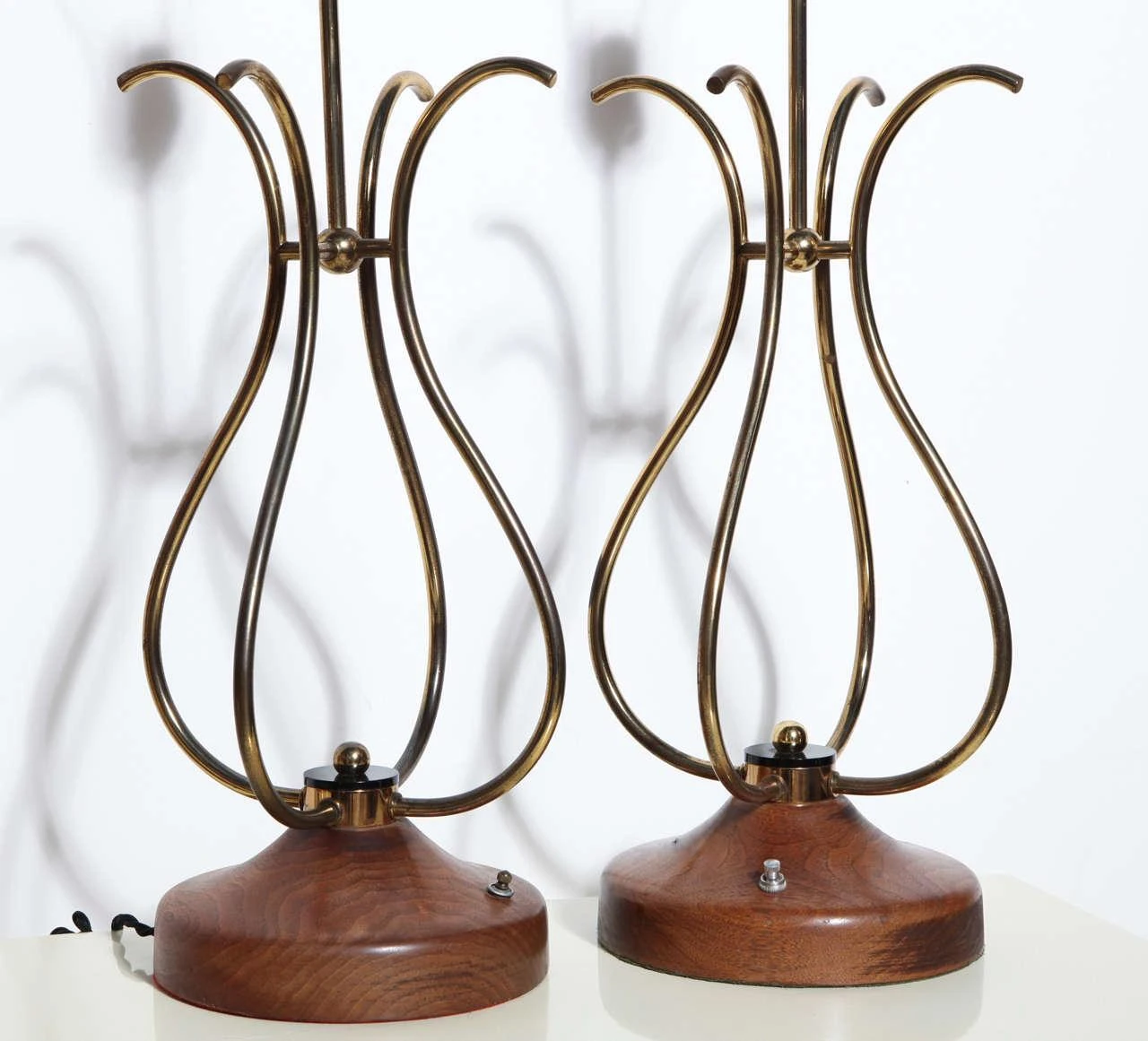 Pair of sculptural french style scrolled Brass Wire and Walnut Table Lamps. Featuring four joined curved S shape patinated Brass wire forms, a lightly restored solid grained Walnut 8D base with Black Lucite disks and Brass knob detail. Standard sockets. Base switch. Musical. Lyrical. Resembling Treble Clef.