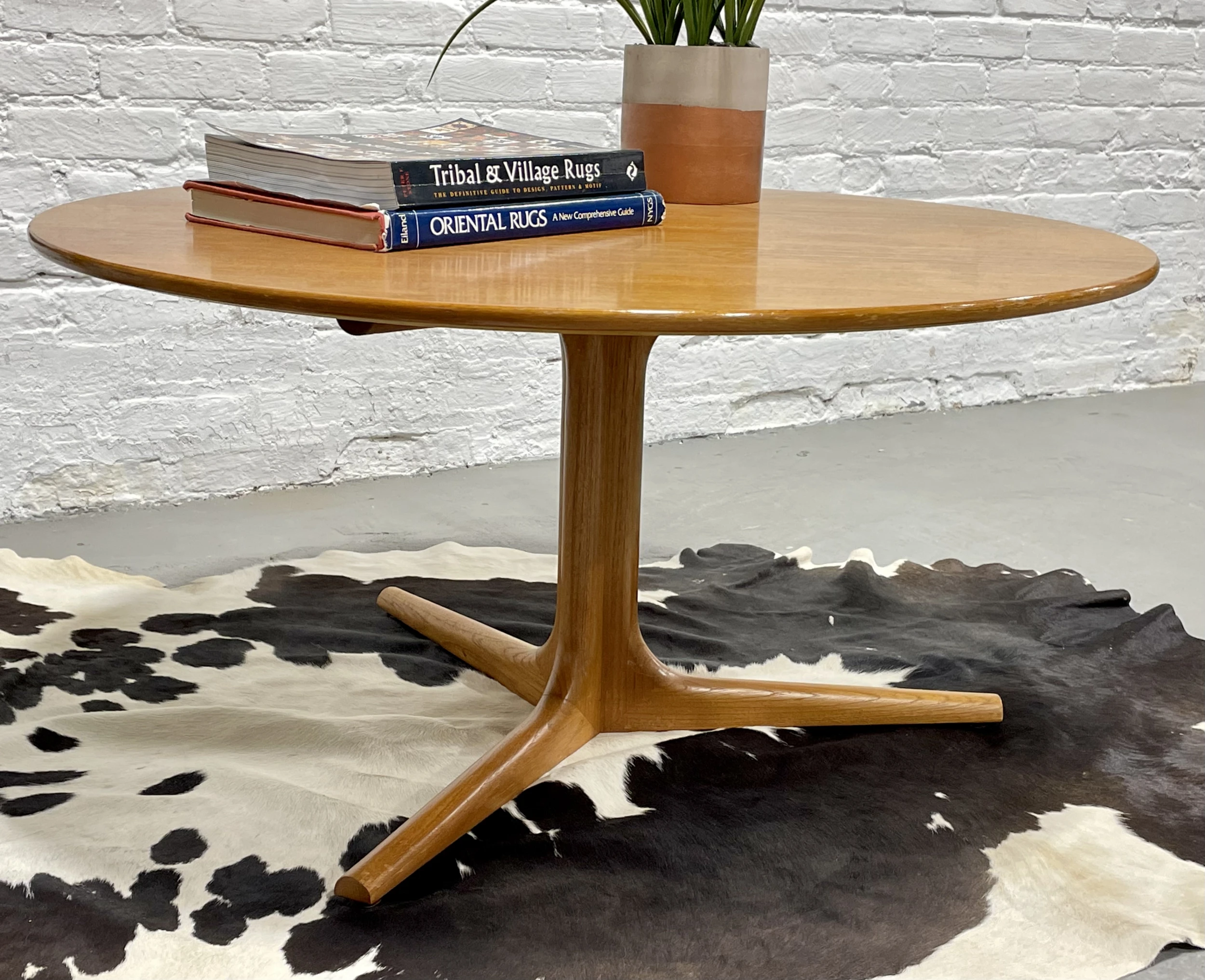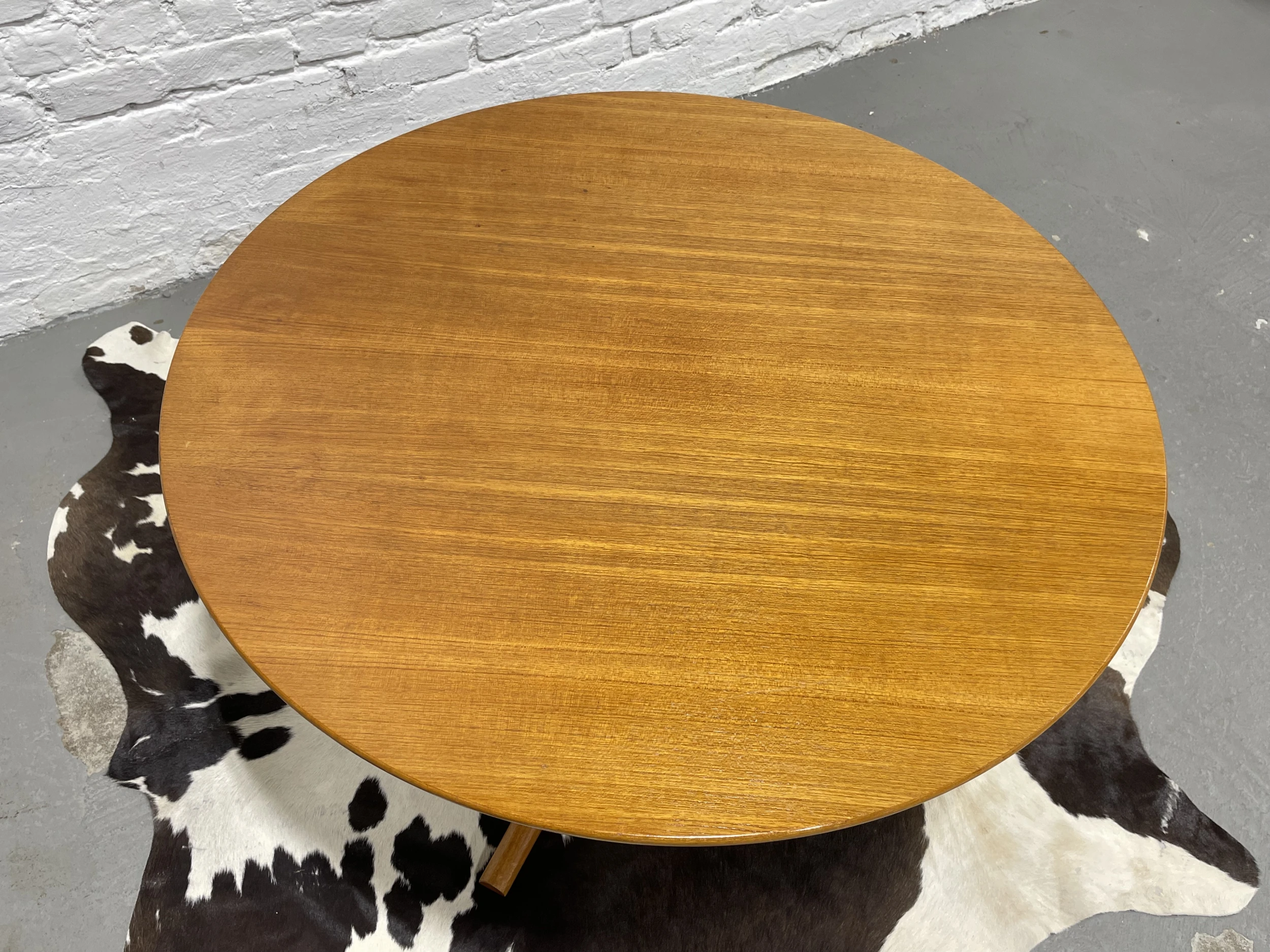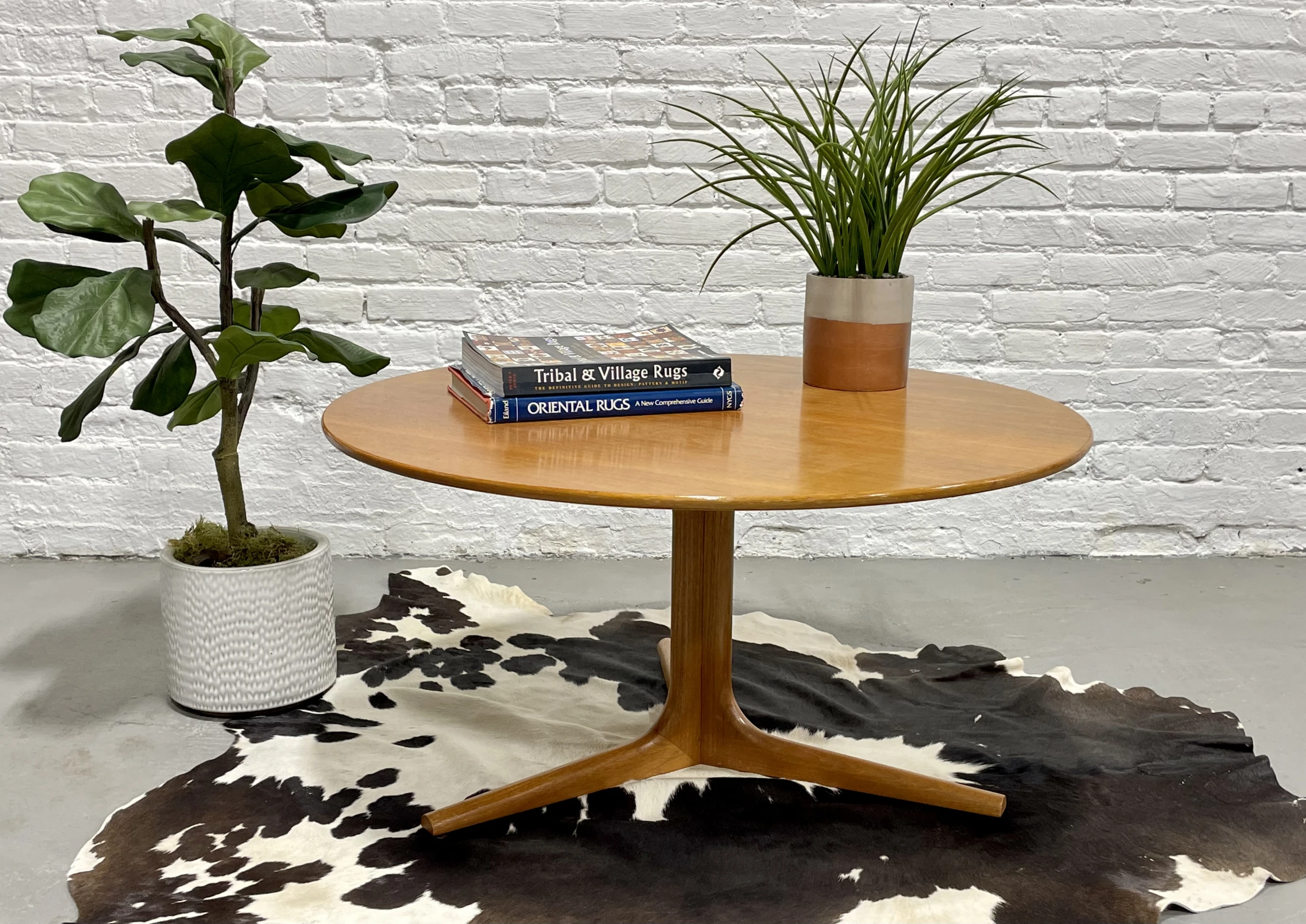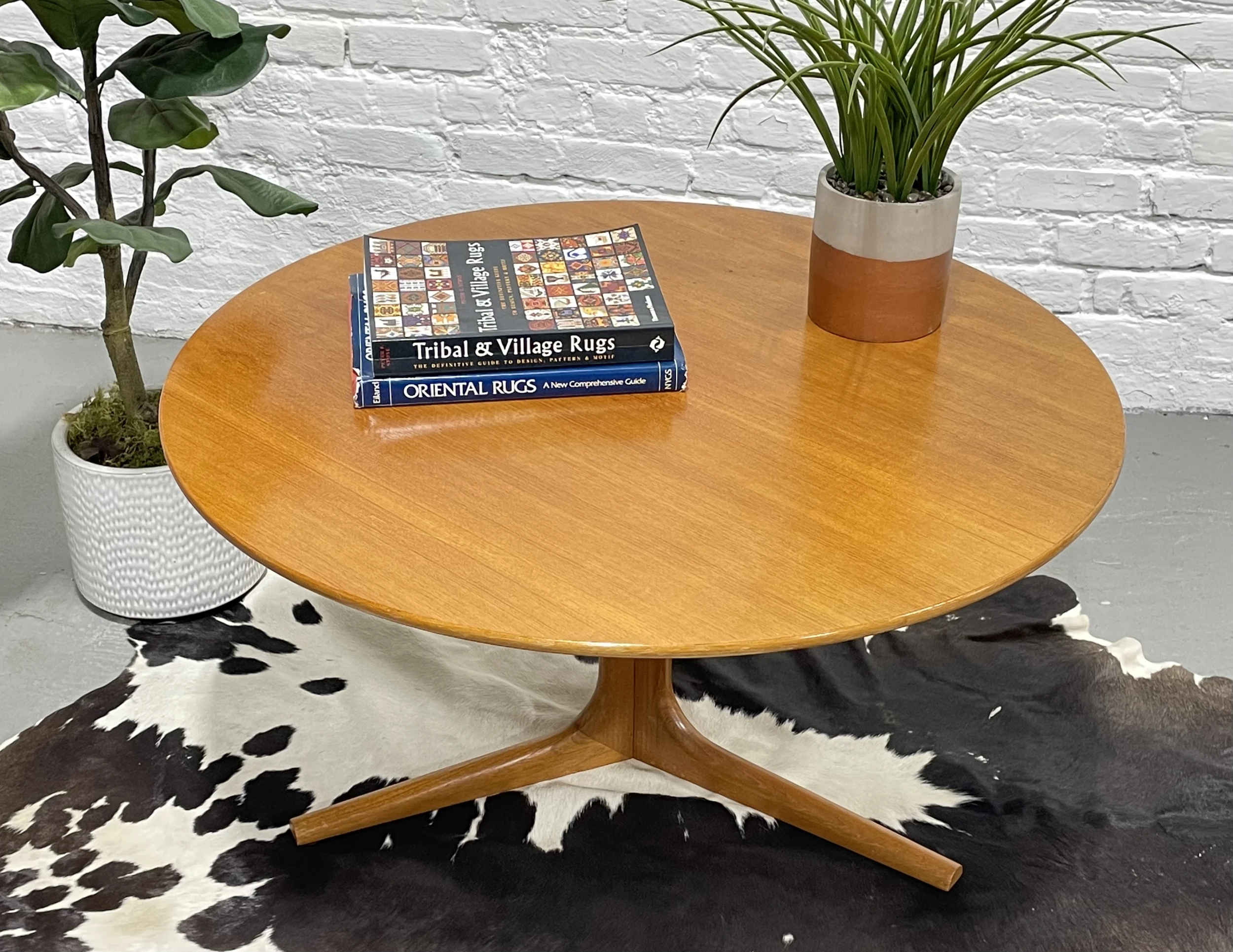 Teak Mid Century Modern Round coffee table featuring a classic + simple design. Solid + sturdy table with unique three …