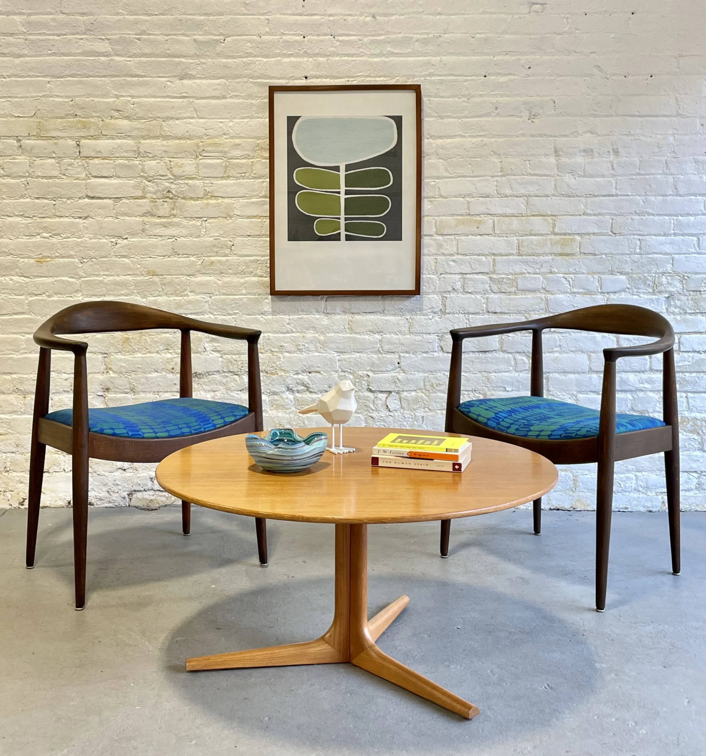 Teak Mid Century Modern Round coffee table featuring a classic + simple design. Solid + sturdy table with unique three leg design. If you’ve been searching for a round mid century coffee table, you know they are not easy to find. This stunning table will add a clean and modern element to your living room. Chairs available separately and are not included with the table.