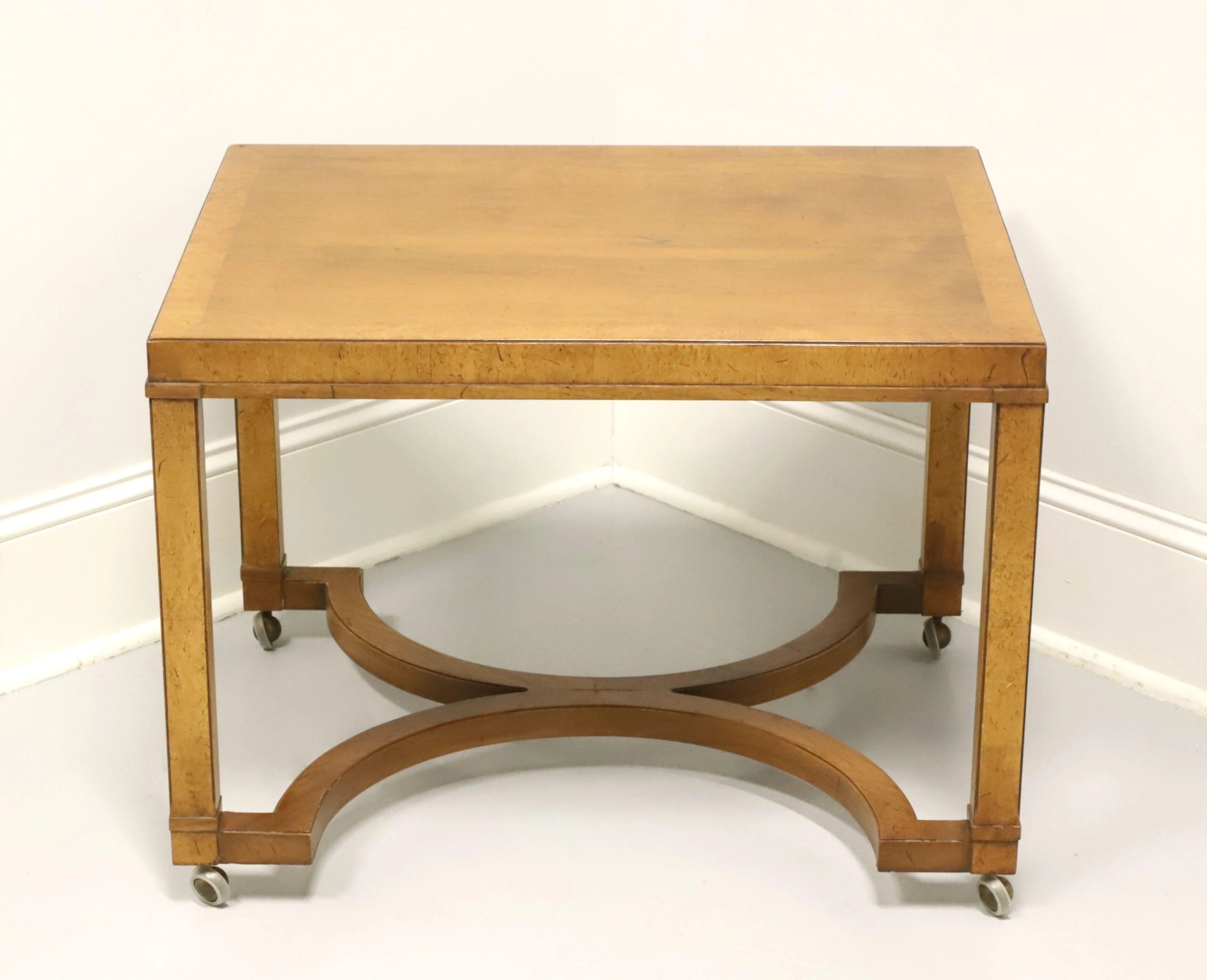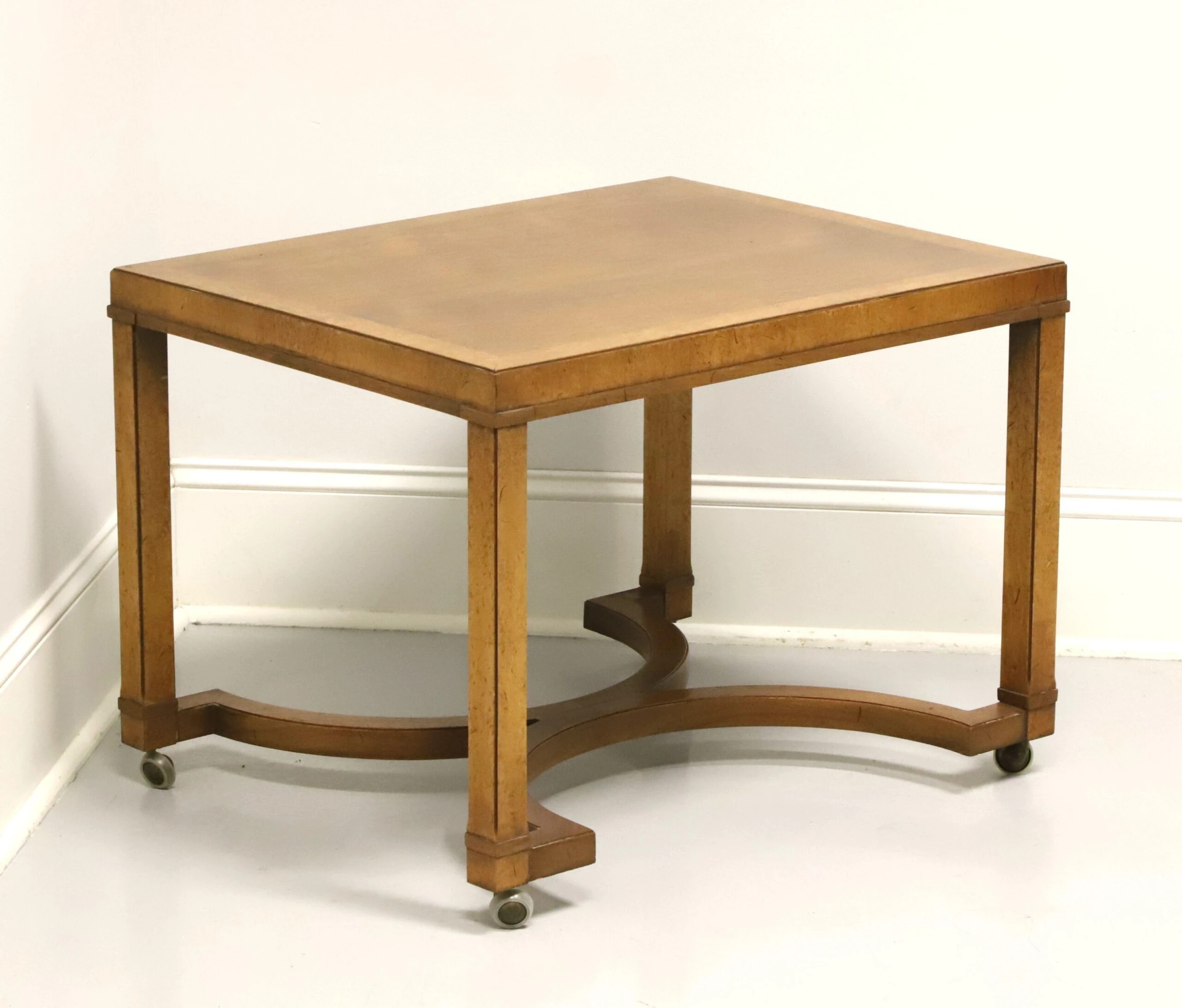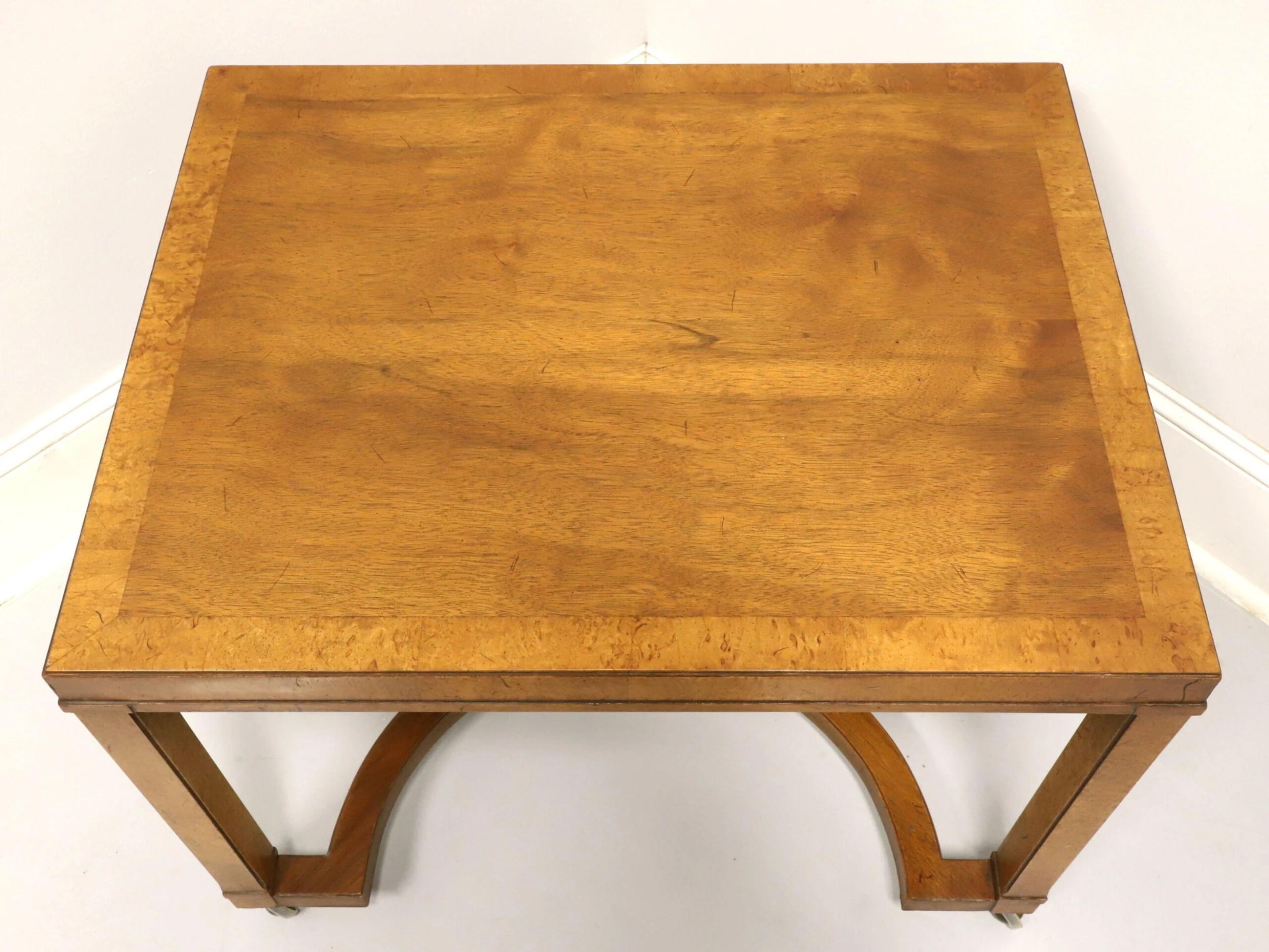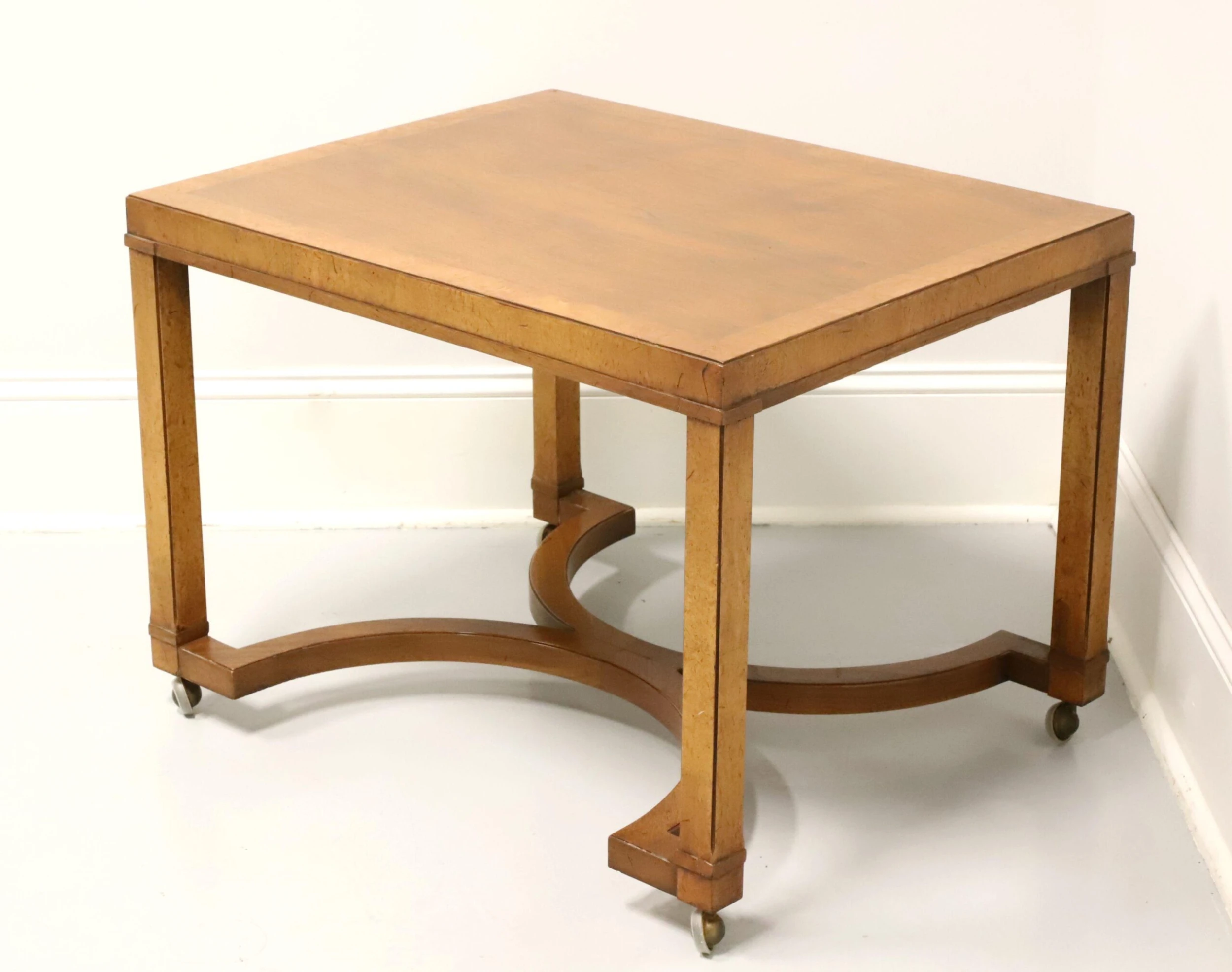 A Neoclassical style rectangular side table by Tomlinson Furniture. Walnut with burlwood banding to top, slightly distressed finish, straight square legs affixed to “U” shaped stretchers and four casters. Made in North Carolina, USA, in the mid 20th Century.