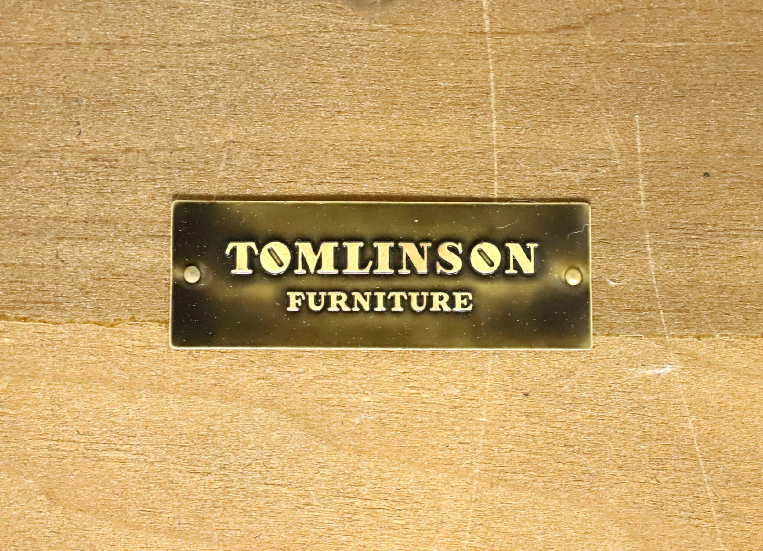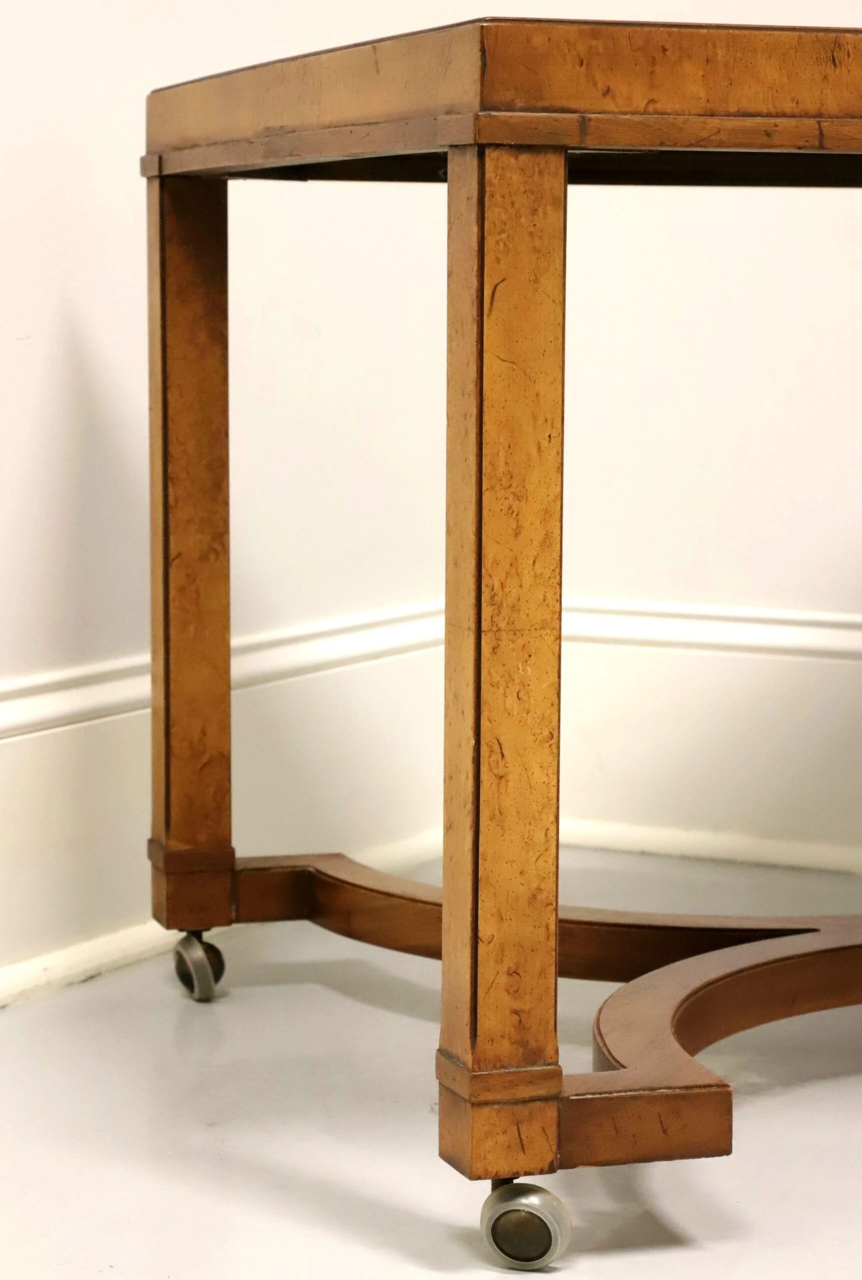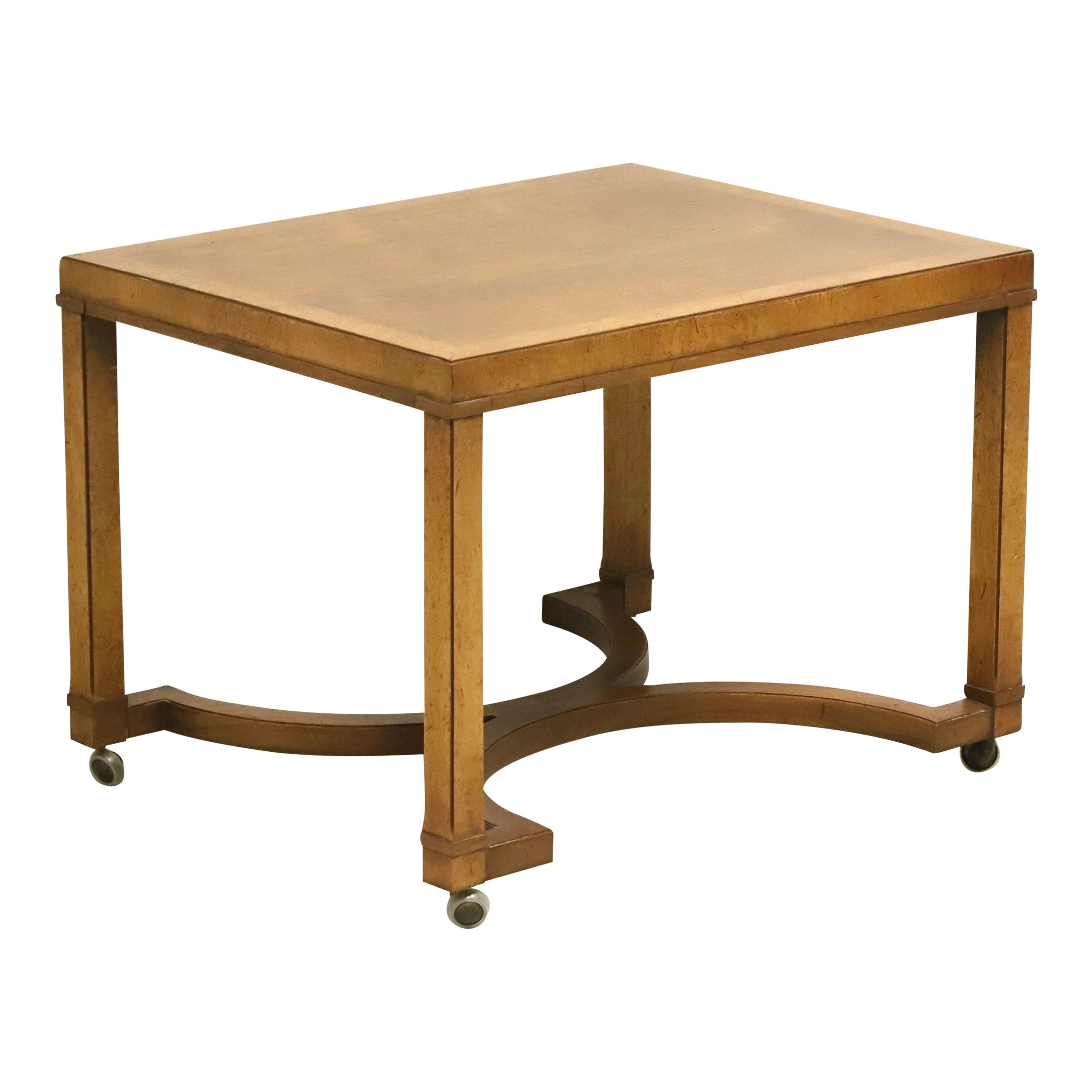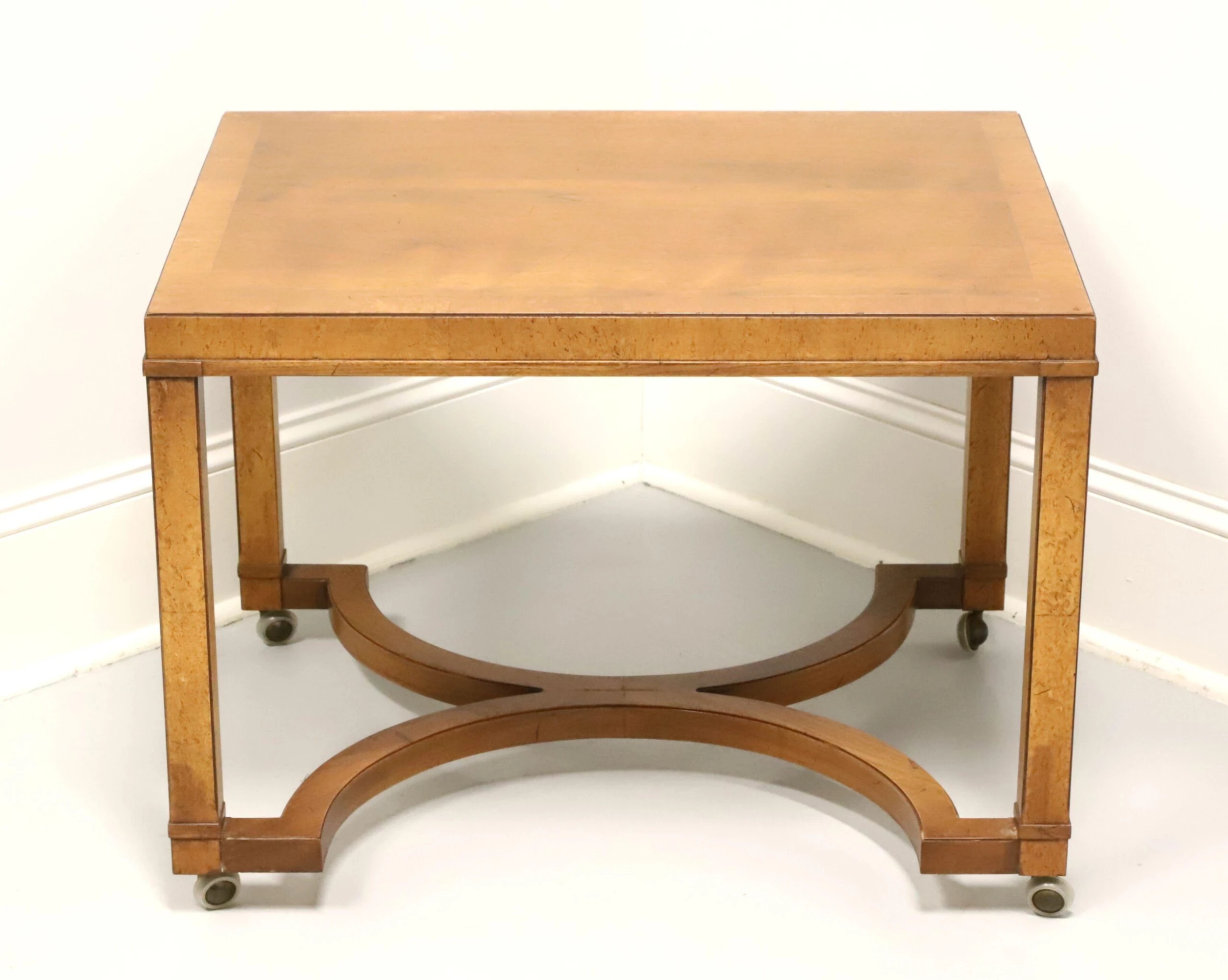 A Neoclassical style rectangular side table by Tomlinson Furniture. Walnut with burlwood banding to top, slightly distressed finish, straight square legs affixed to “U” shaped stretchers and four casters. Made in North Carolina, USA, in the mid 20th Century.