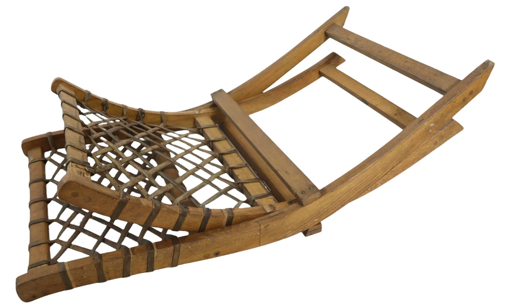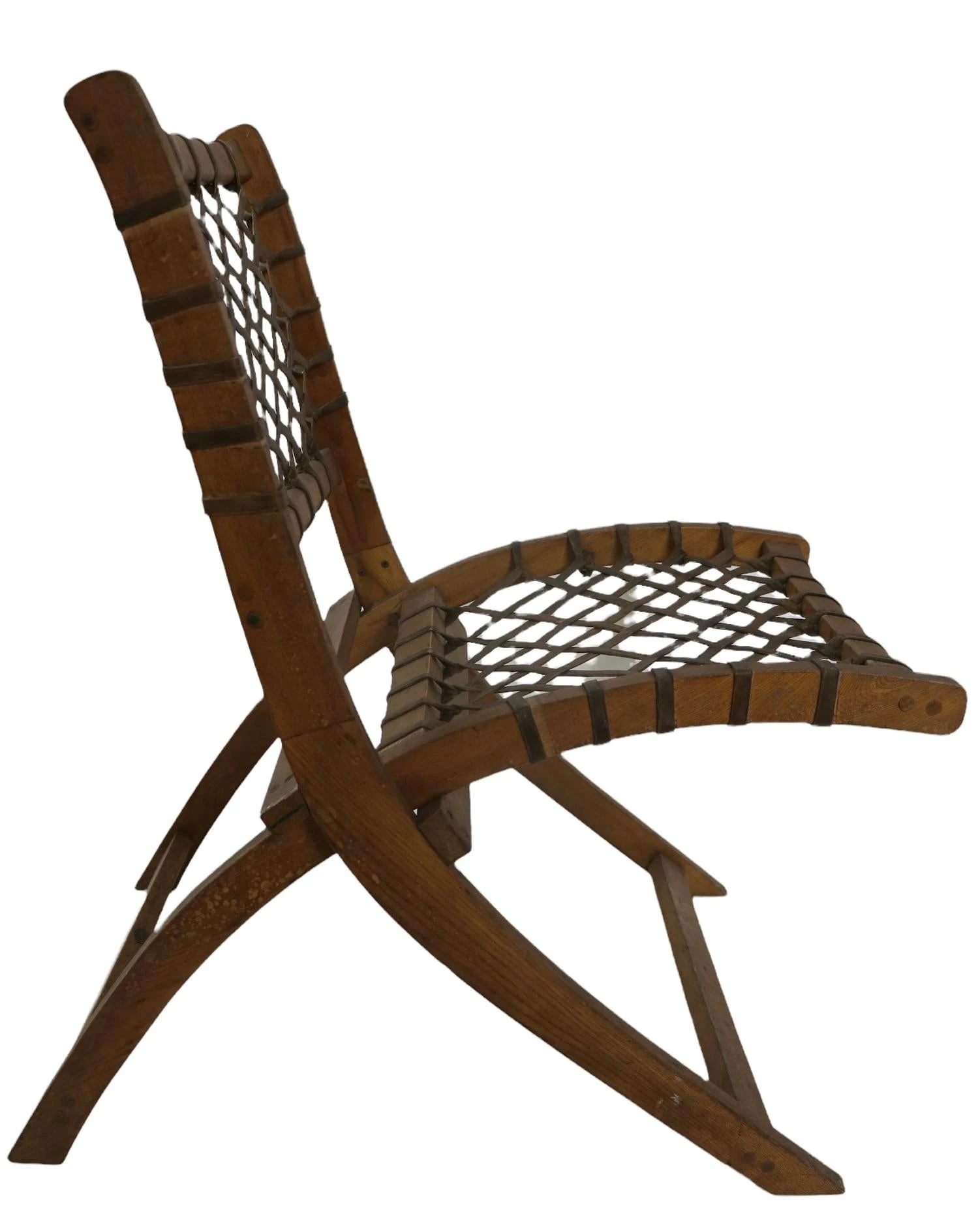 Unusual folding camp lounge chair by Snow Shu Chairs Tubbs Vt. Barcelona chair sophistication meets Adirondack rustic charm. Chair folds down to flat, for easy transport and storage. Possibly designed by Carl Koch, however I cannot document the form.