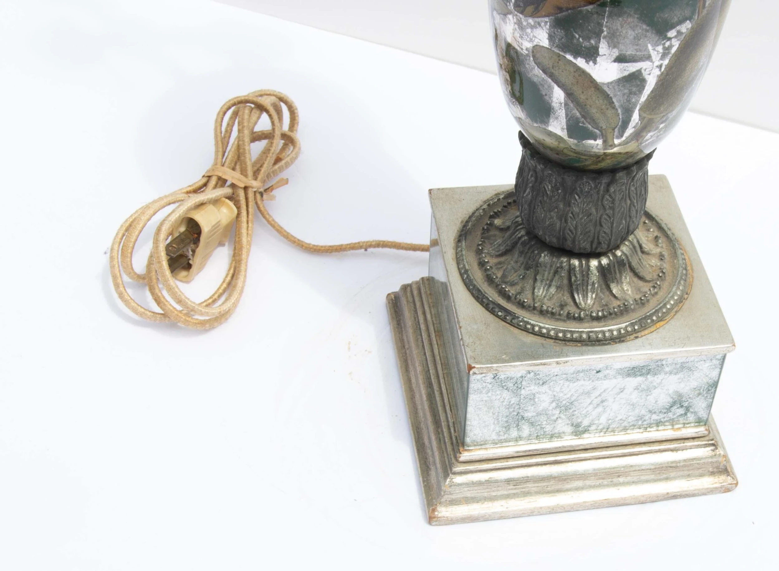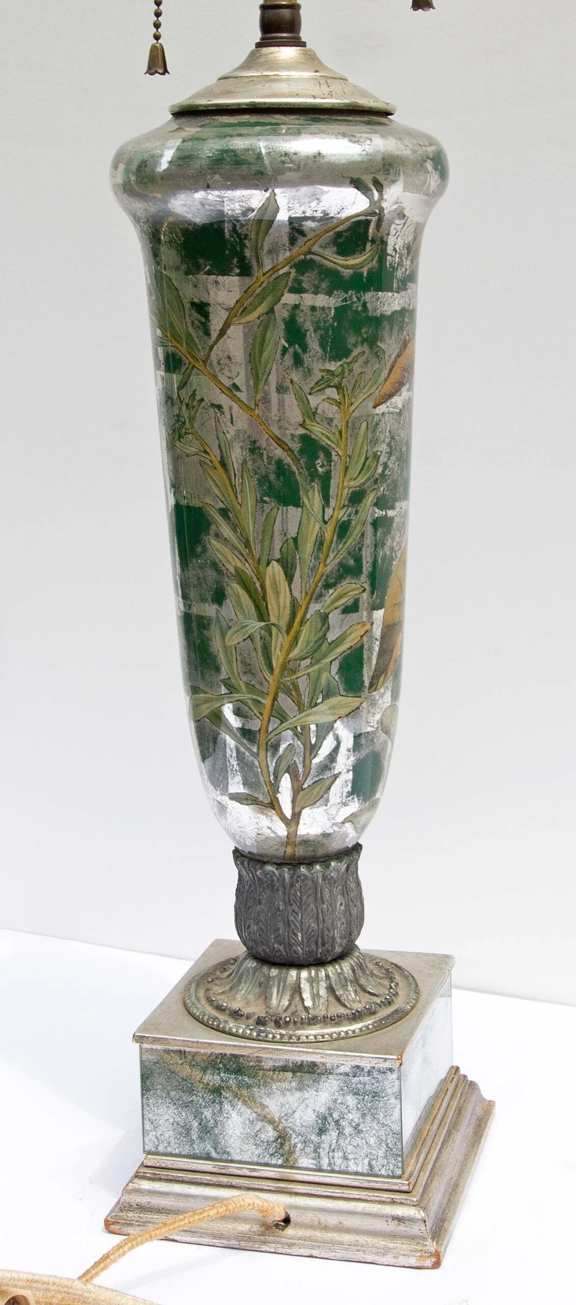 Vintage decalcomania lamp decorated with the silver leaf and botanical vines. Circa 1960’s. Crystal ball finial. Decalcomania is a decorative …