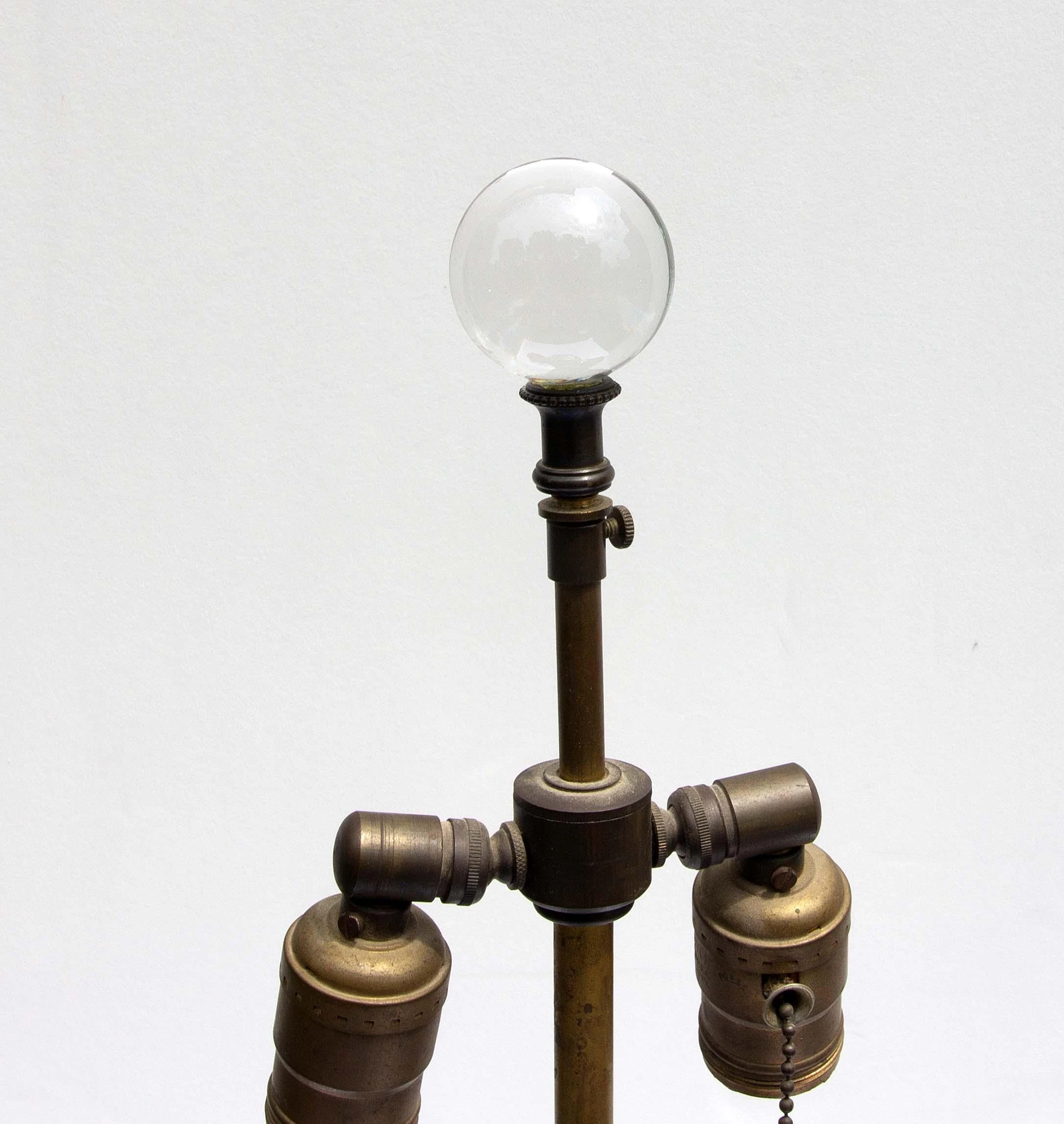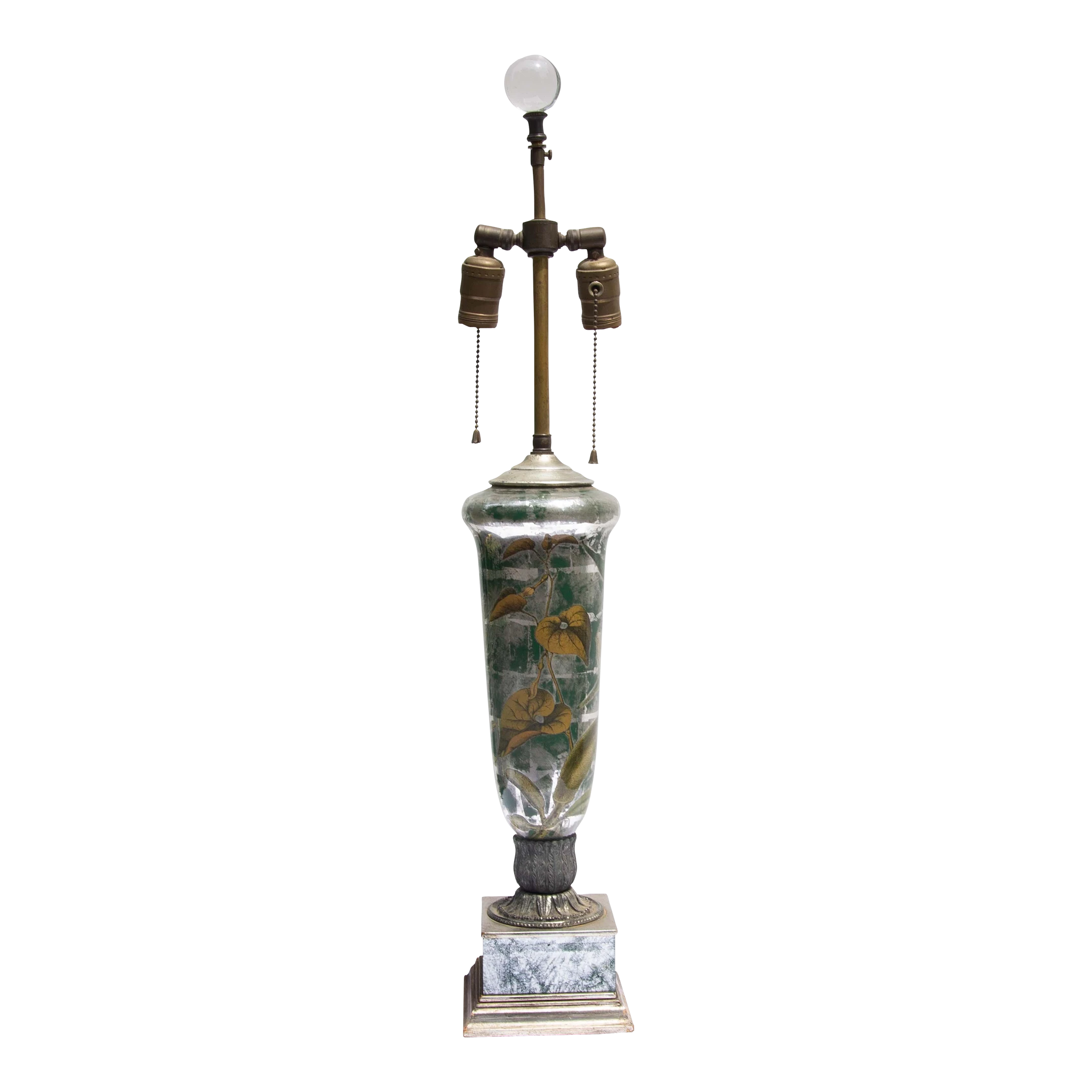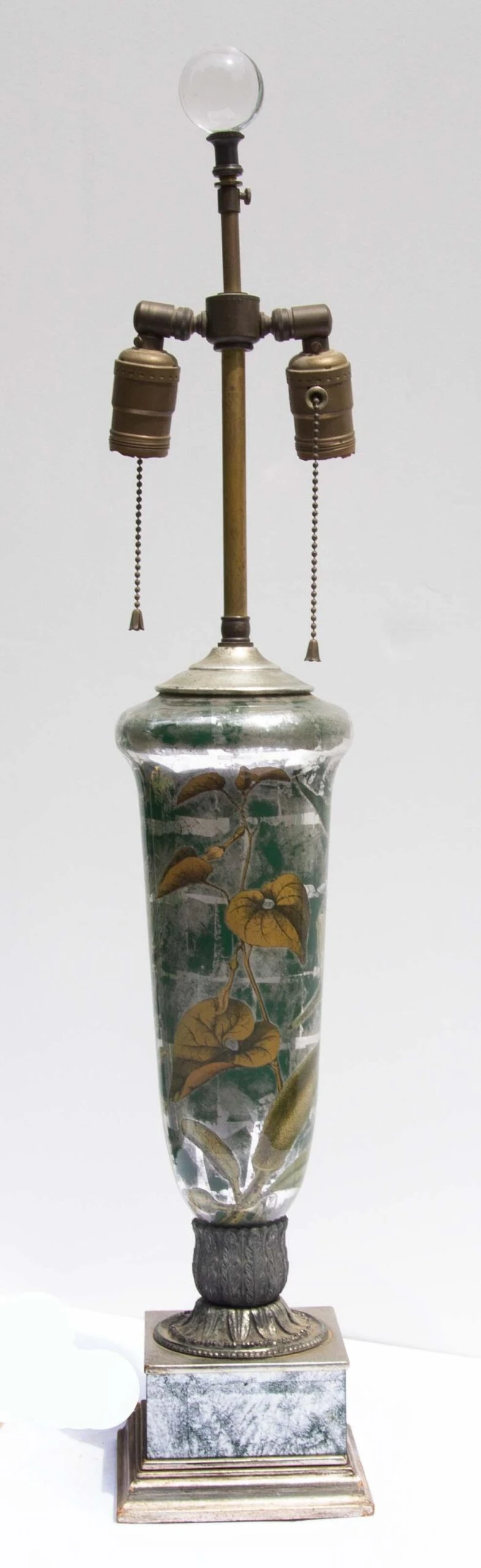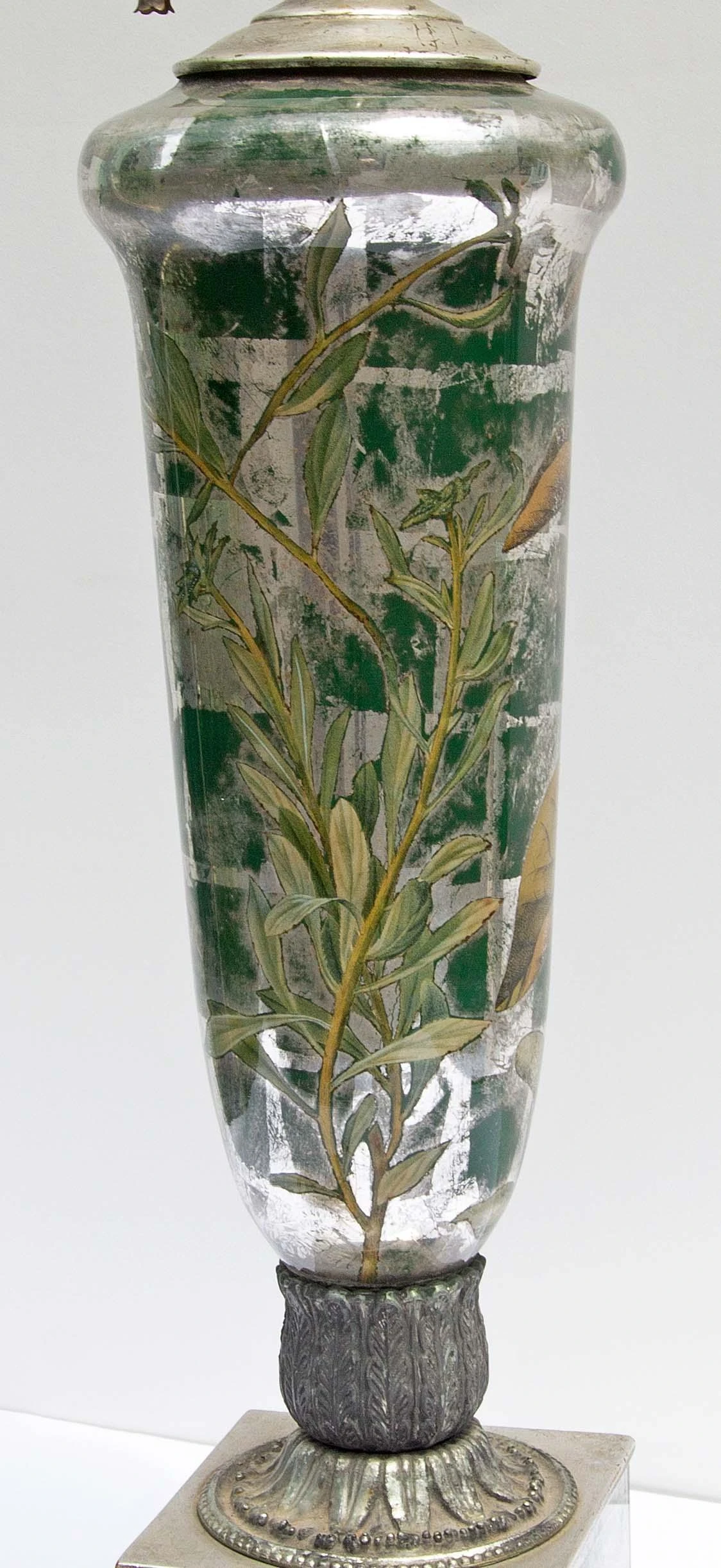 Vintage decalcomania lamp decorated with the silver leaf and botanical vines. Circa 1960’s. Crystal ball finial. Decalcomania is a decorative technique by which engravings and prints may be cut and transferred. The base is glass and decorated on the interior