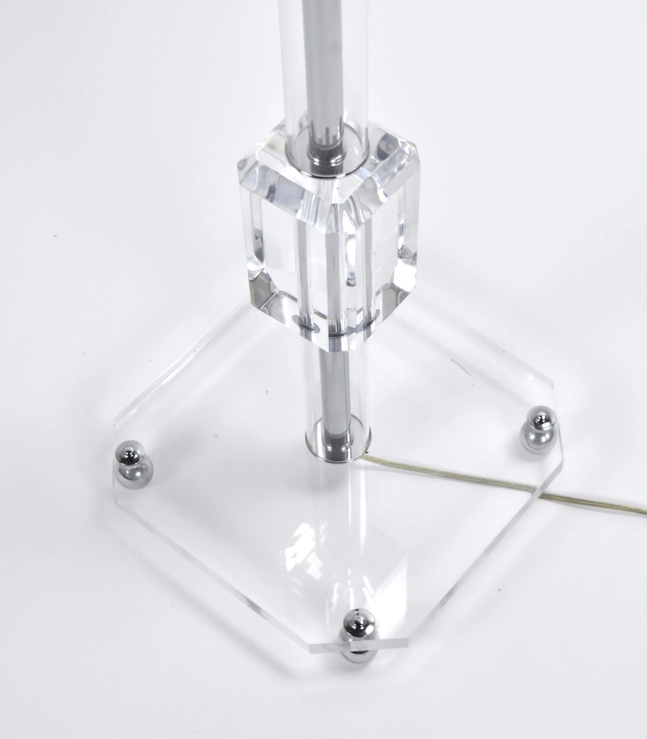 Gorgeous Ralph Gambaro for Les Prismatiques chunky acrylic block floor lamp with chrome hardware including dual swivel sockets and a telescoping neck. Stands on a lucite base with chrome ball feet. Measures 60in-63in adjustable height x 12in x 12in at base. Condition: Excellent vintage condition. Les Prismatiques was founded in New York City by Ralph Gambaro and became known for it’s creative approach to design and materials for furniture during the late 20th century. Gambaro designed and produced lines of furniture in colored acrylic, lucite and other contemporary materials. Les Prismatiques furniture and lighting remains popular with designers today.