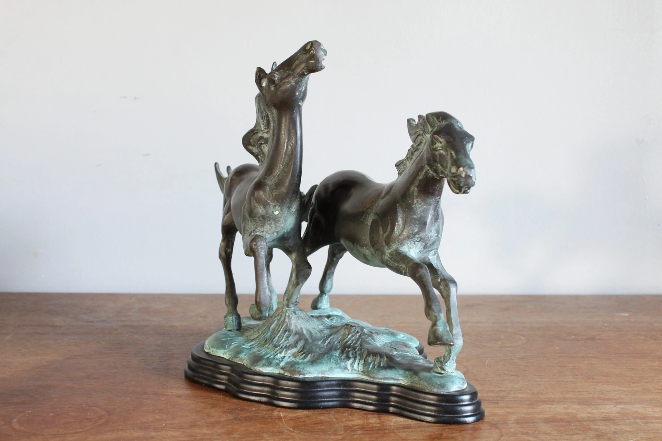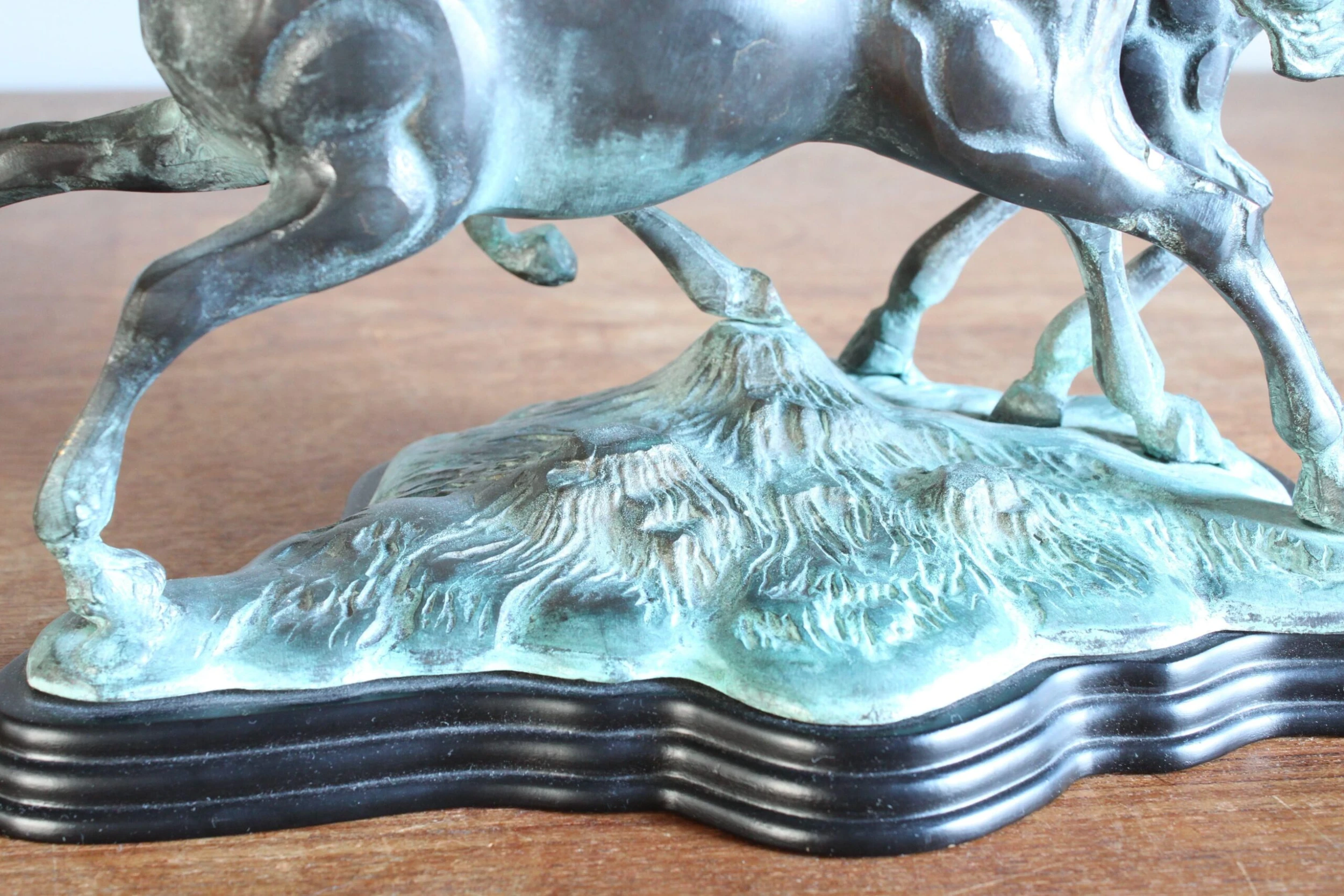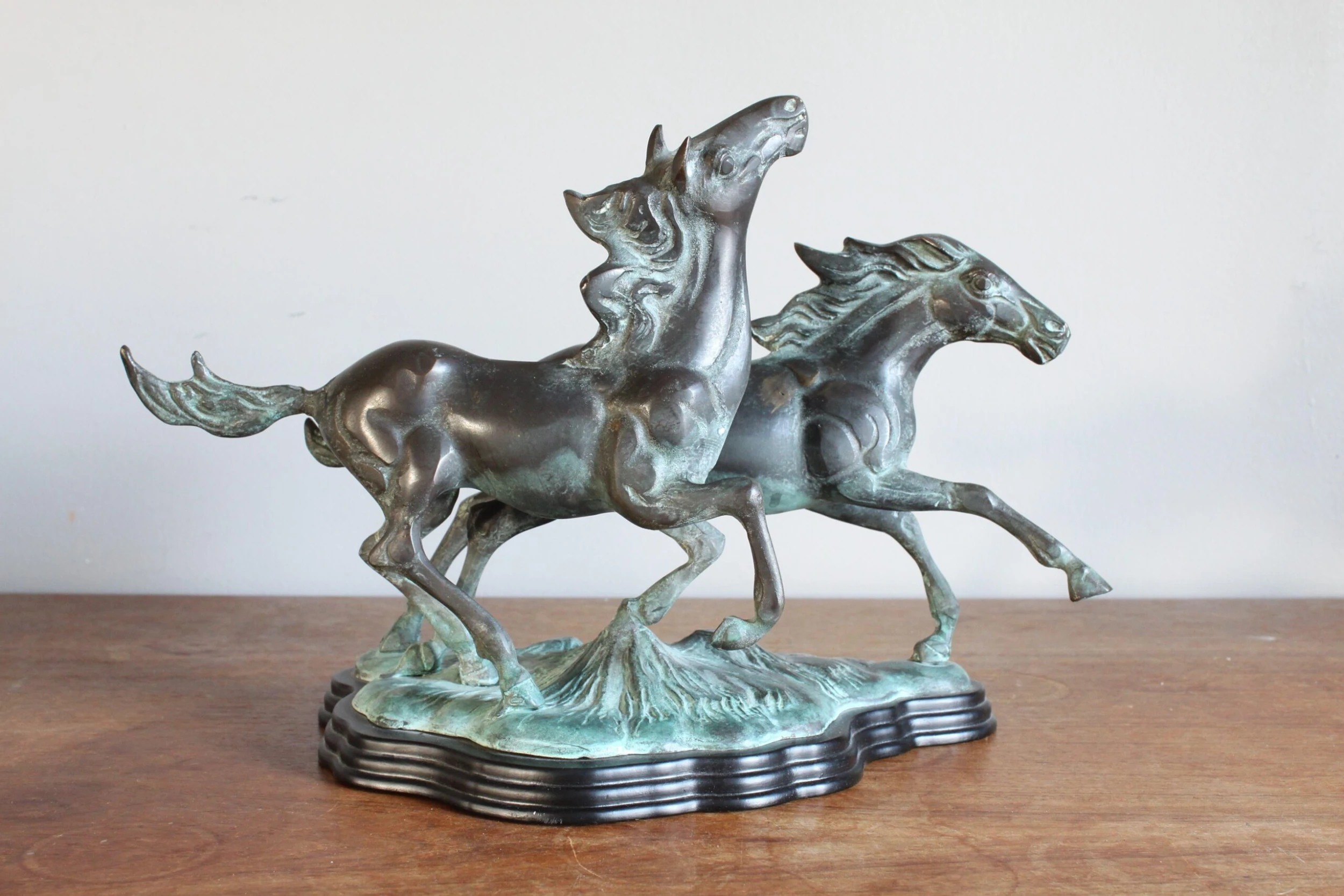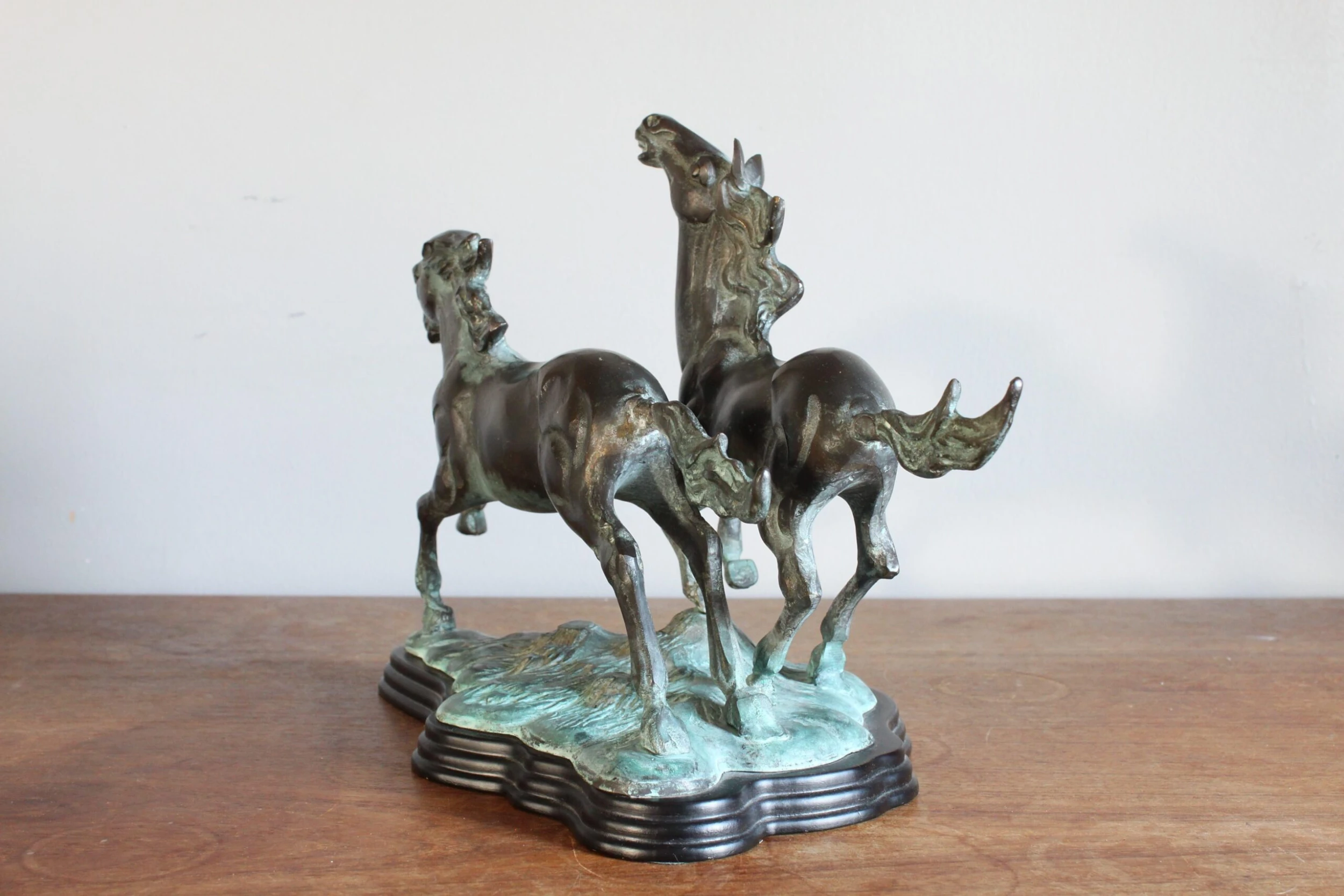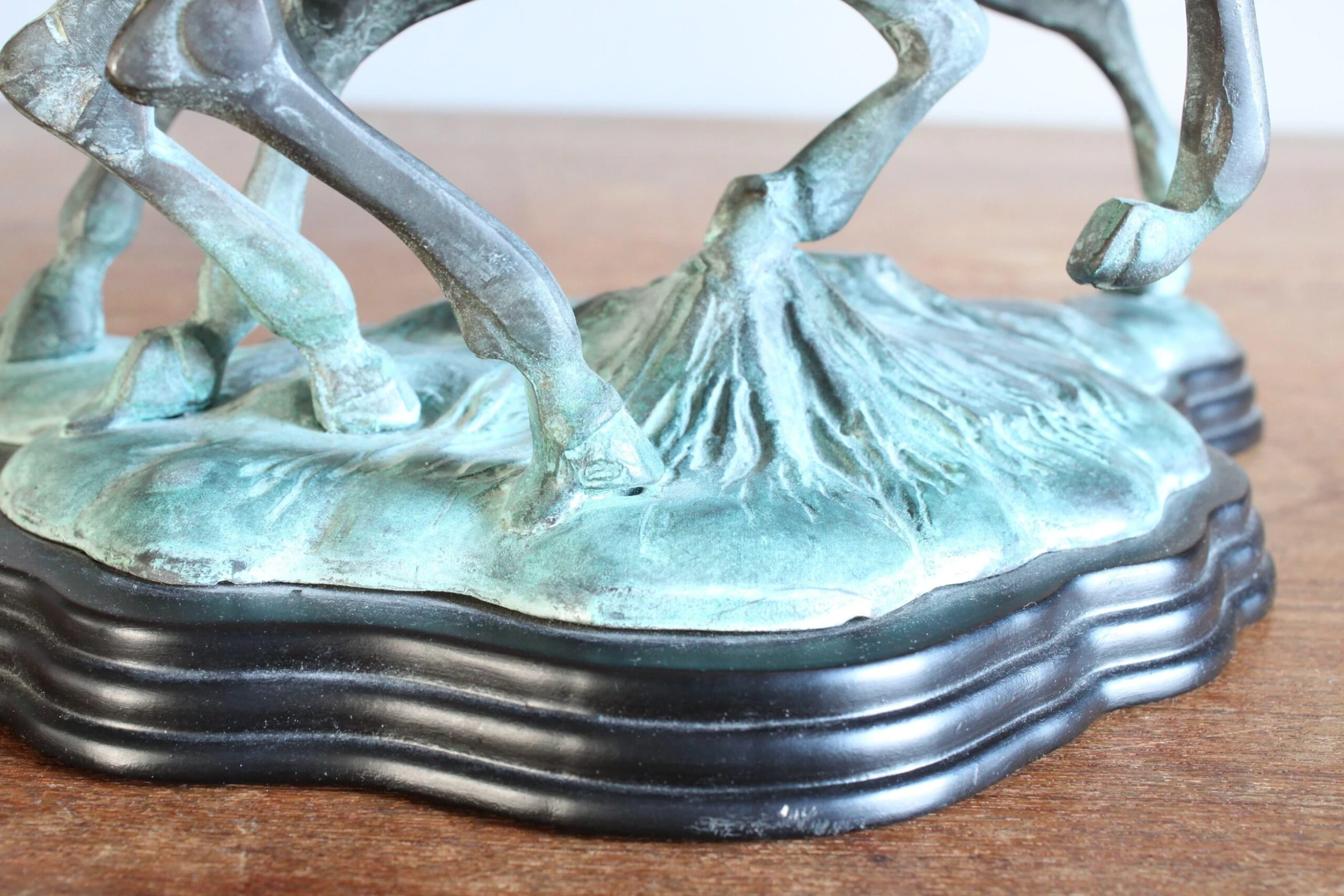 Selected for your consideration is this magnificent statue depicting two galloping horses cast in bronze and set on a black lacquered wood base. This is a very dynamic and spirited statue perfect for any who appreciate the grace and power of these majestic beasts. The statue show a gorgeous aged patina throughout. The base has felt pads to protect from surface scratching, and there is a makers sticker from Decorative Crafts Inc.