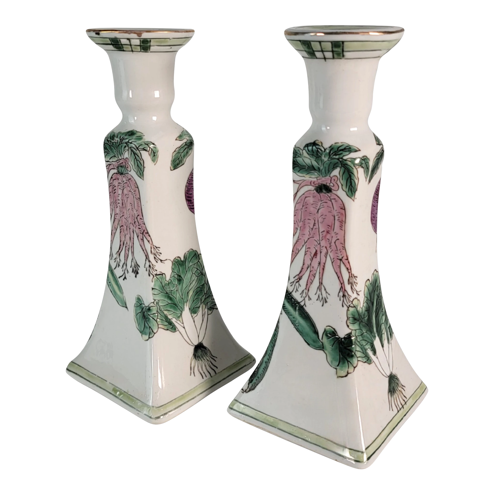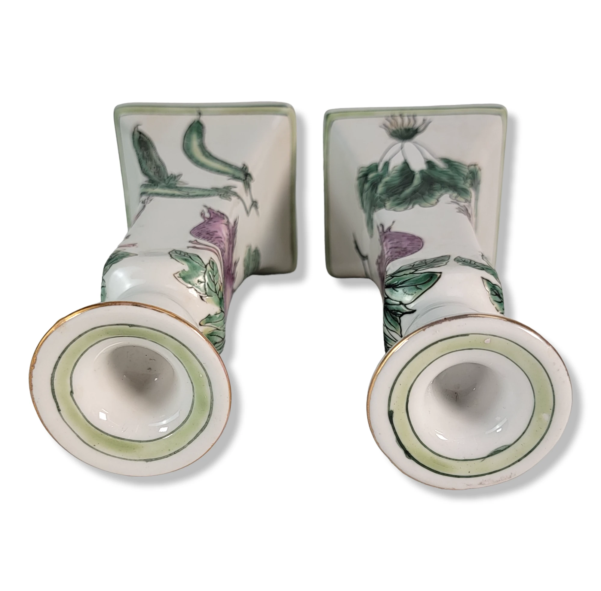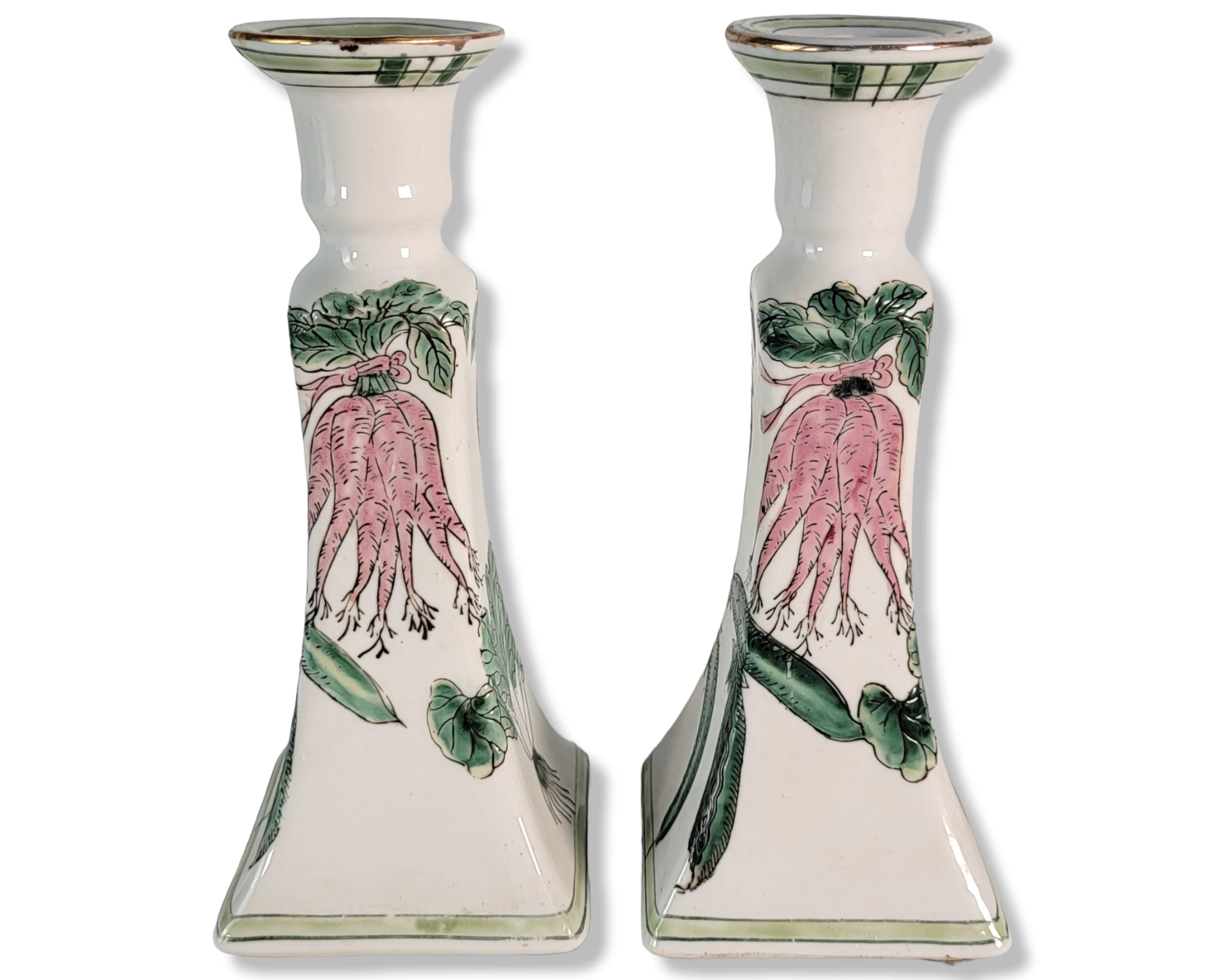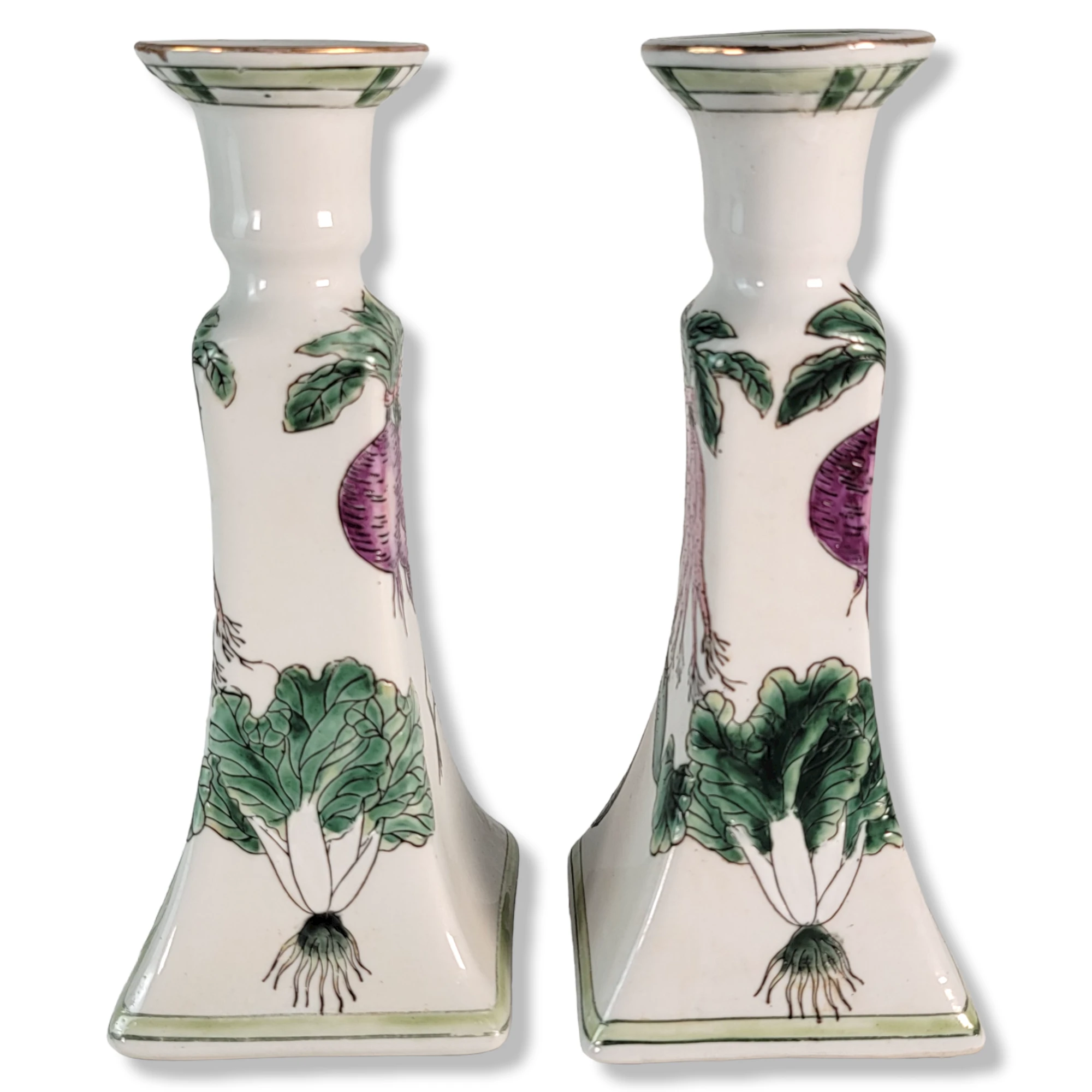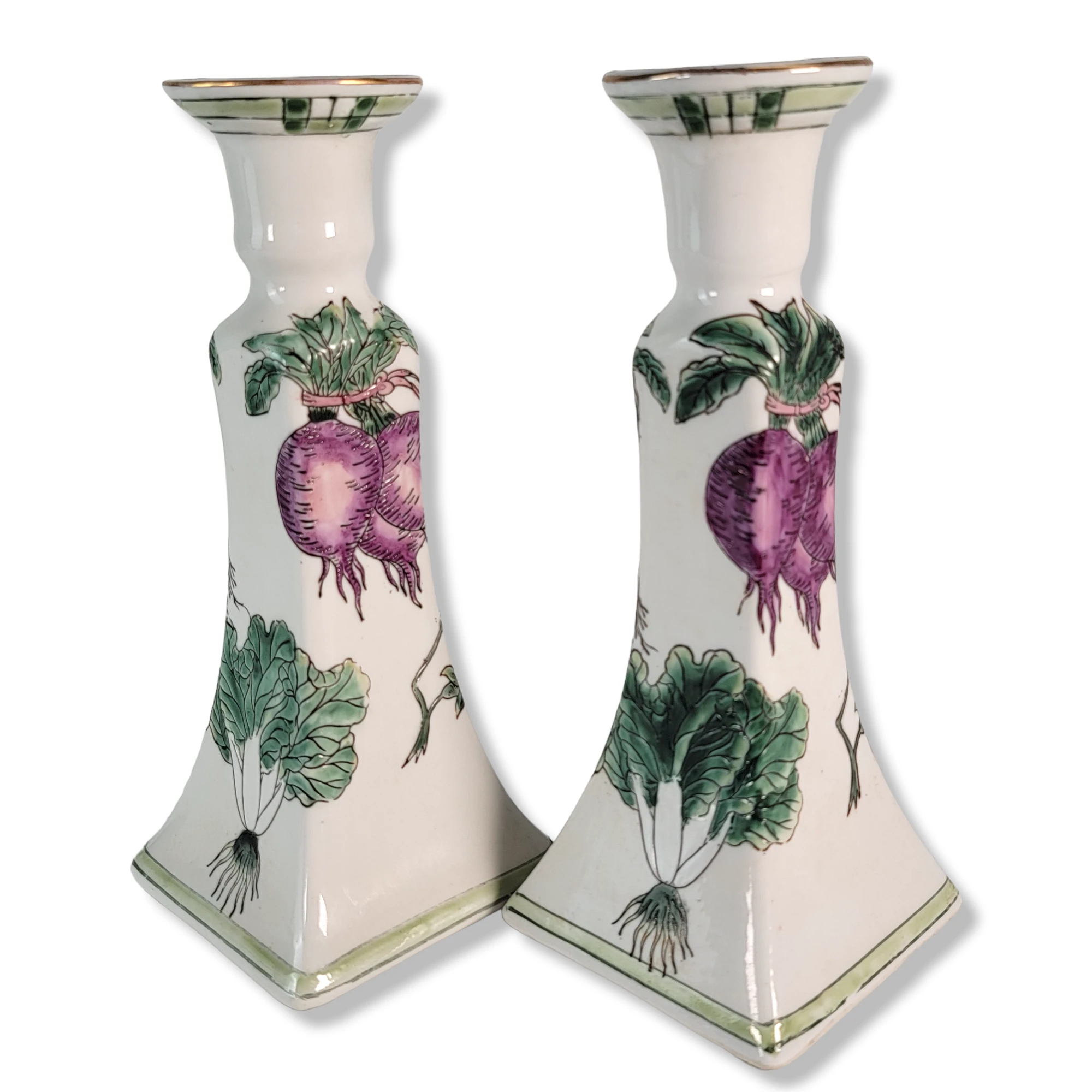 For the love of all things botanical, this gorgeous pair of Chinese candle holders are covered with garden-themed flora. This is a very rare pattern for this genre of candleholders. These porcelain candle holders are hand-painted with all manner of garden treasures to make an artisanal salad. These are stunningly perfect for your botanical garden-themed décor. They are also subtle conversation pieces. Your guests will assume the artisanal pink carrots are flowers until they take a closer look. They will smile wryly as they realize what healthy options you are offering even in your décor choices. These candle holders will make an inspired gift or wonderful addition to your personal collection. The candle holders have no maker’s mark. However…. these likely were originally purchased at Neiman Marcus.