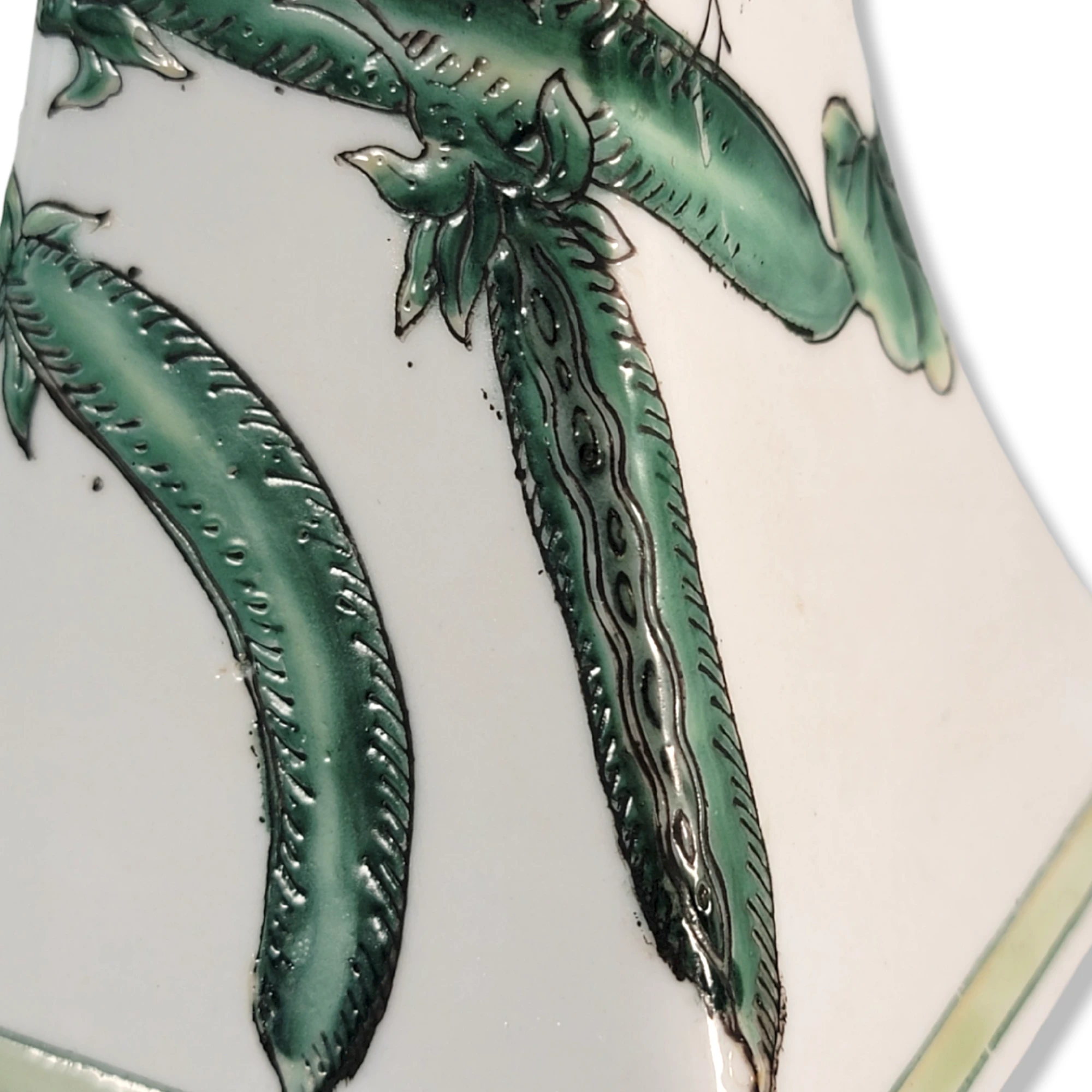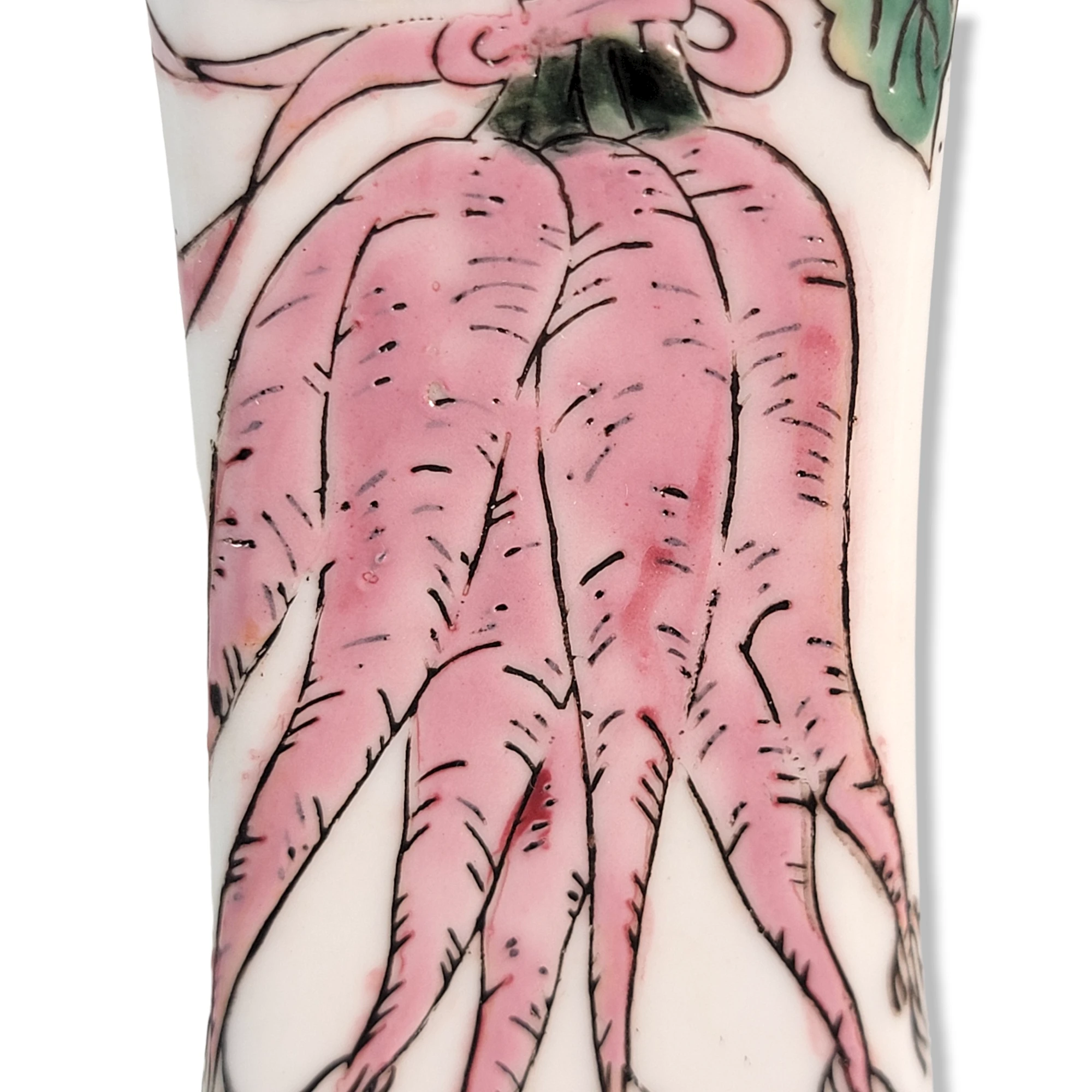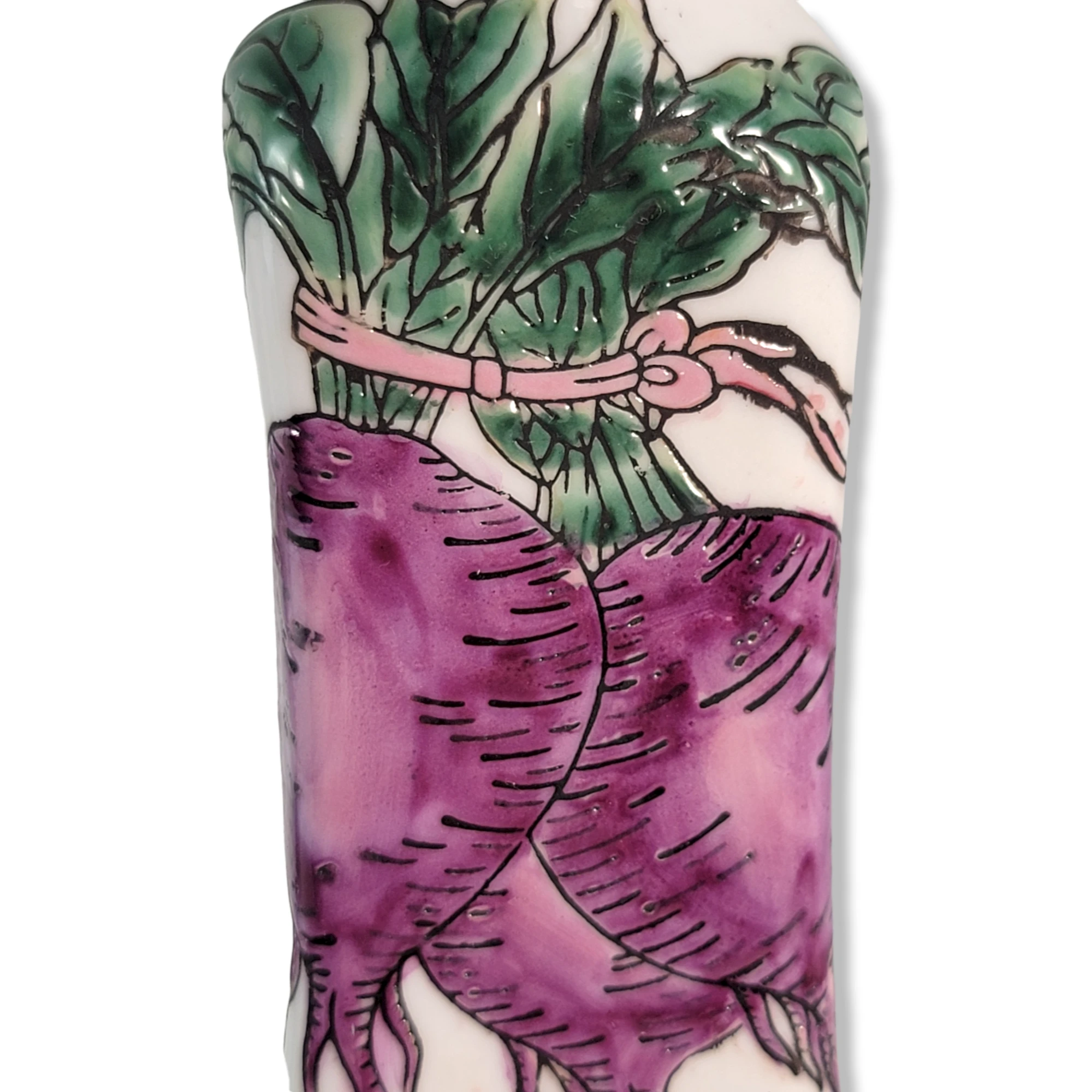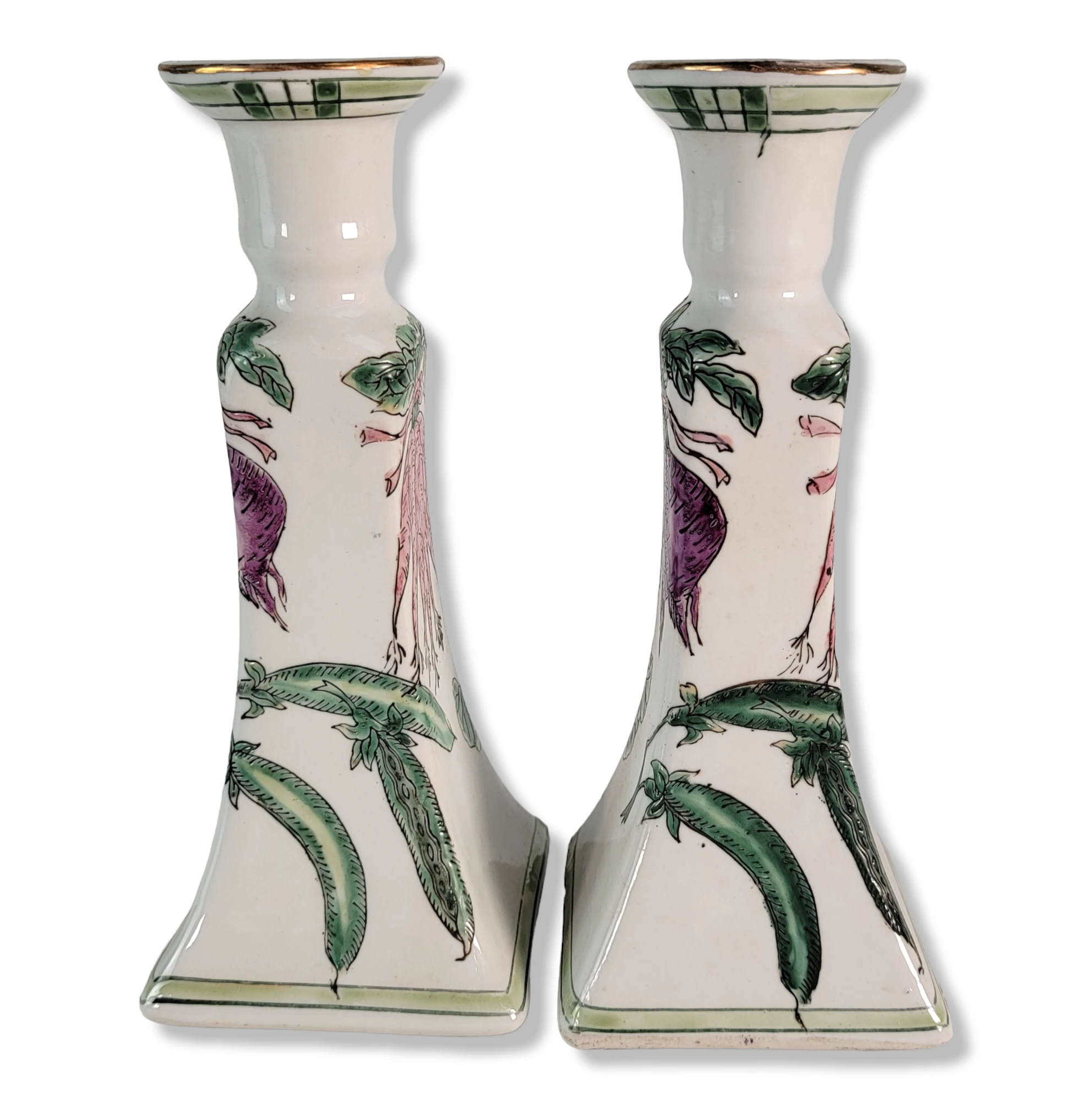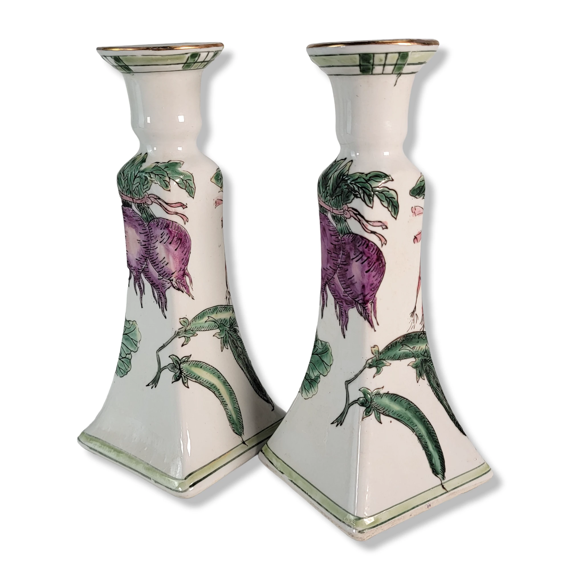 For the love of all things botanical, this gorgeous pair of Chinese candle holders are covered with garden-themed flora. This is a very rare pattern for this genre of candleholders. These porcelain candle holders are hand-painted with all manner of garden treasures to make an artisanal salad. These are stunningly perfect for your botanical garden-themed décor. They are also subtle conversation pieces. Your guests will assume the artisanal pink carrots are flowers until they take a closer look. They will smile wryly as they realize what healthy options you are offering even in your décor choices. These candle holders will make an inspired gift or wonderful addition to your personal collection. The candle holders have no maker’s mark. However…. these likely were originally purchased at Neiman Marcus.