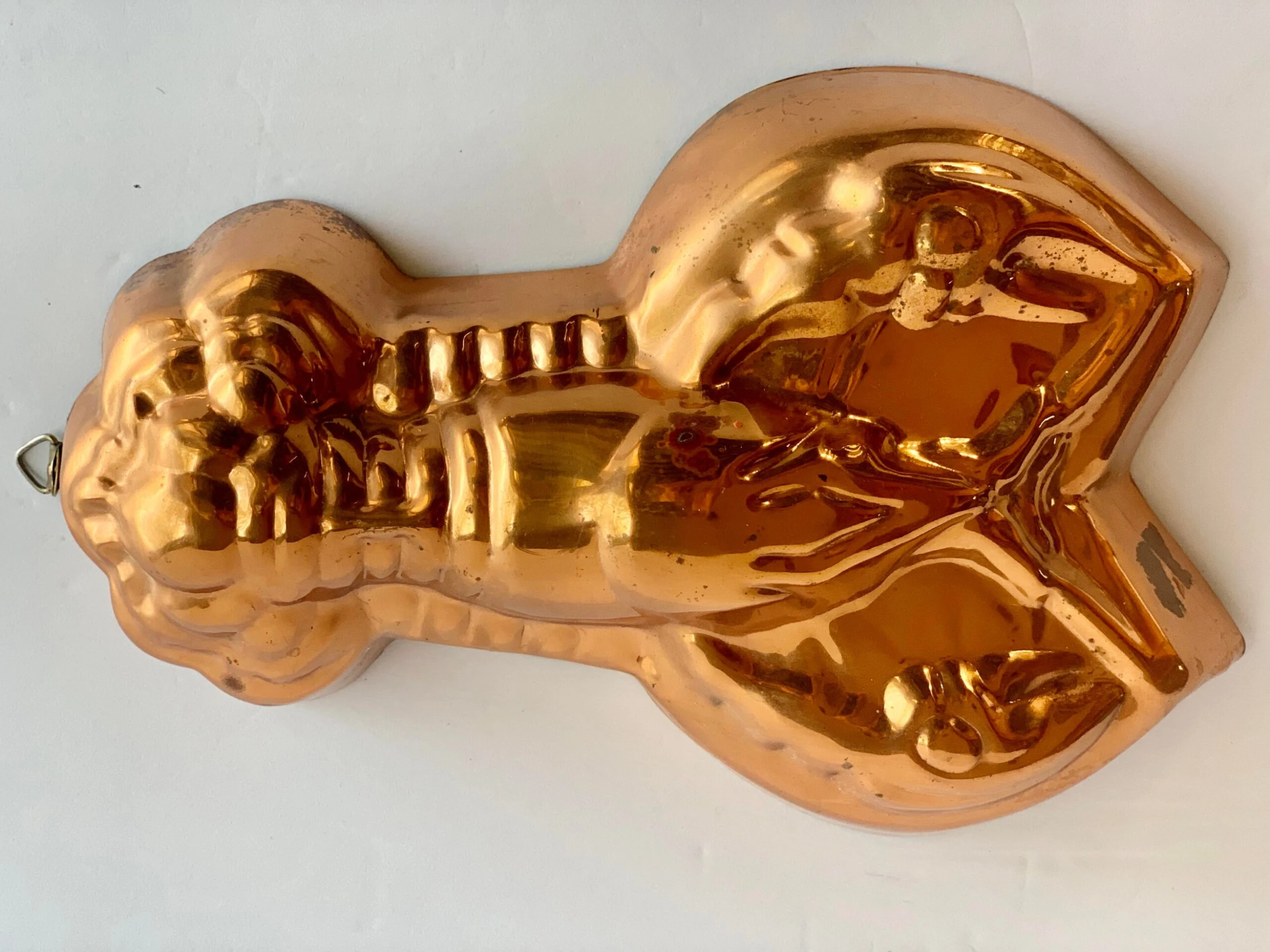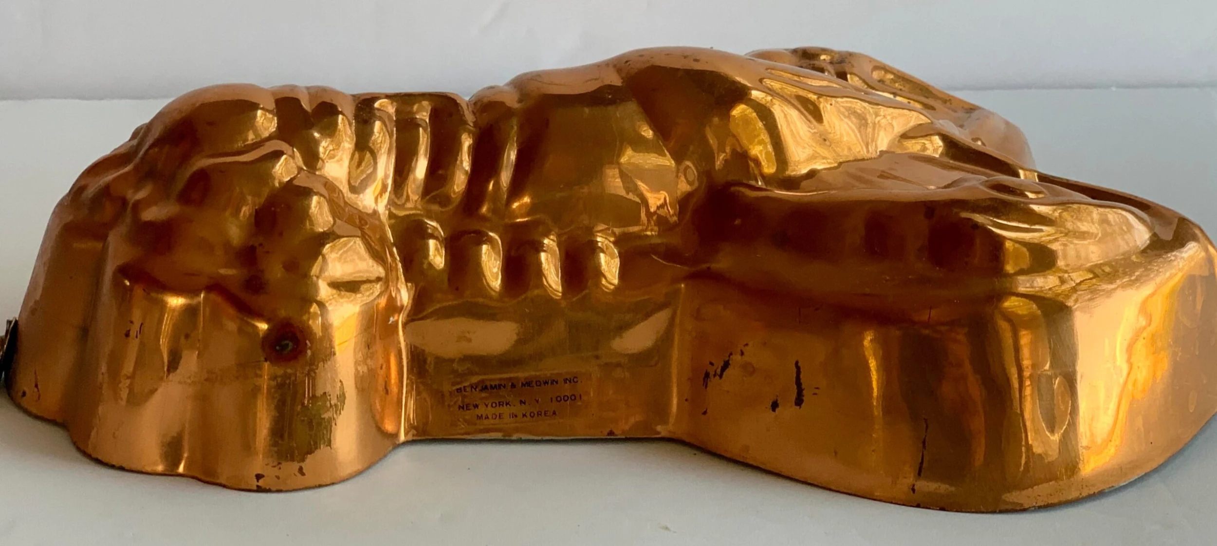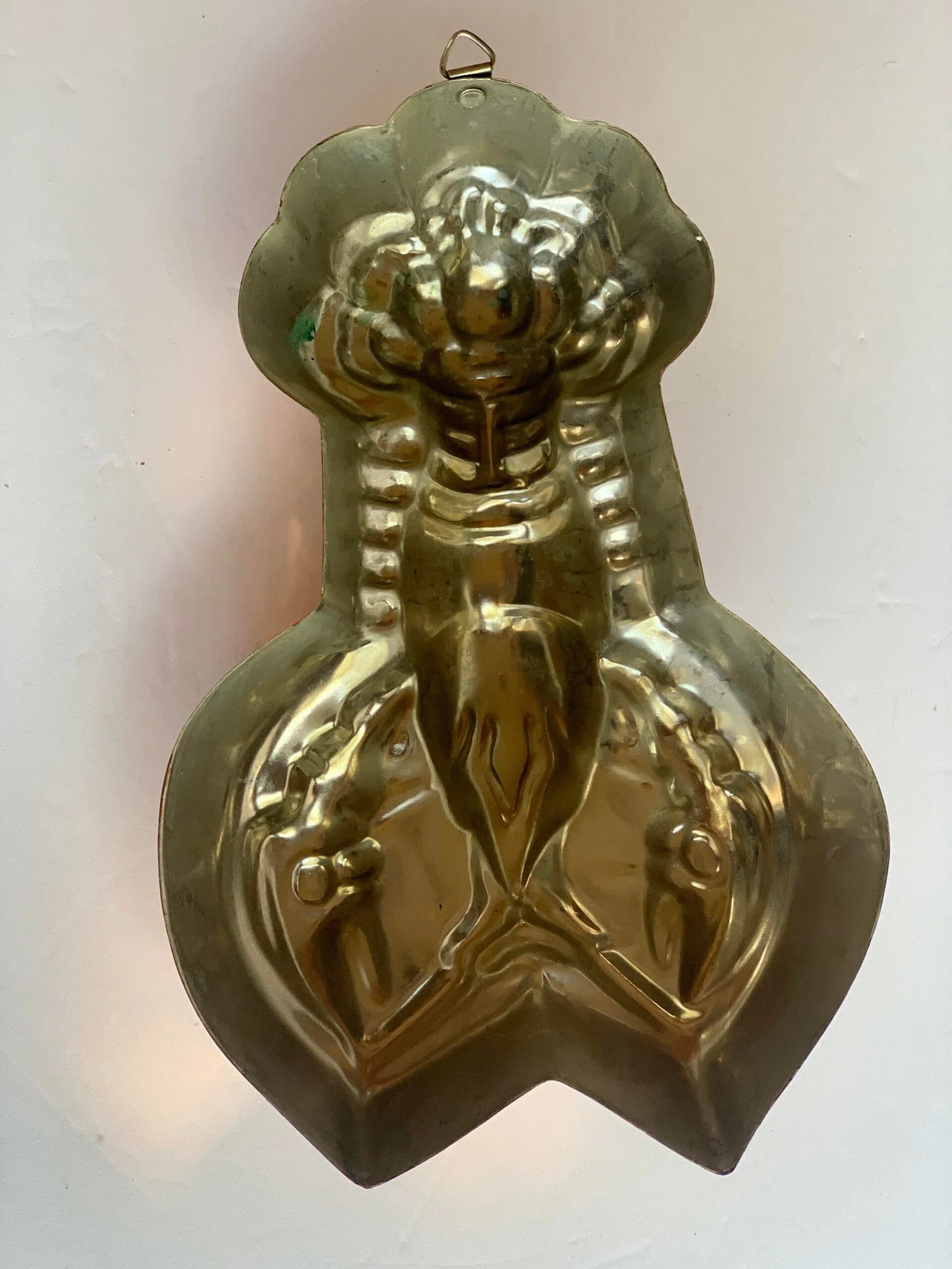 Vintage 1980’s lobster kitchen mold made by Benjamin & Medwin Inc. The highly detailed copper over tin mold has a rich, aged patina and a brass hook for hanging. There is a makers mark on the side and reads, Benjamin & Medwin Inc, New York. This piece would be a wonderful addition to any kitchen, especially in a coastal setting.