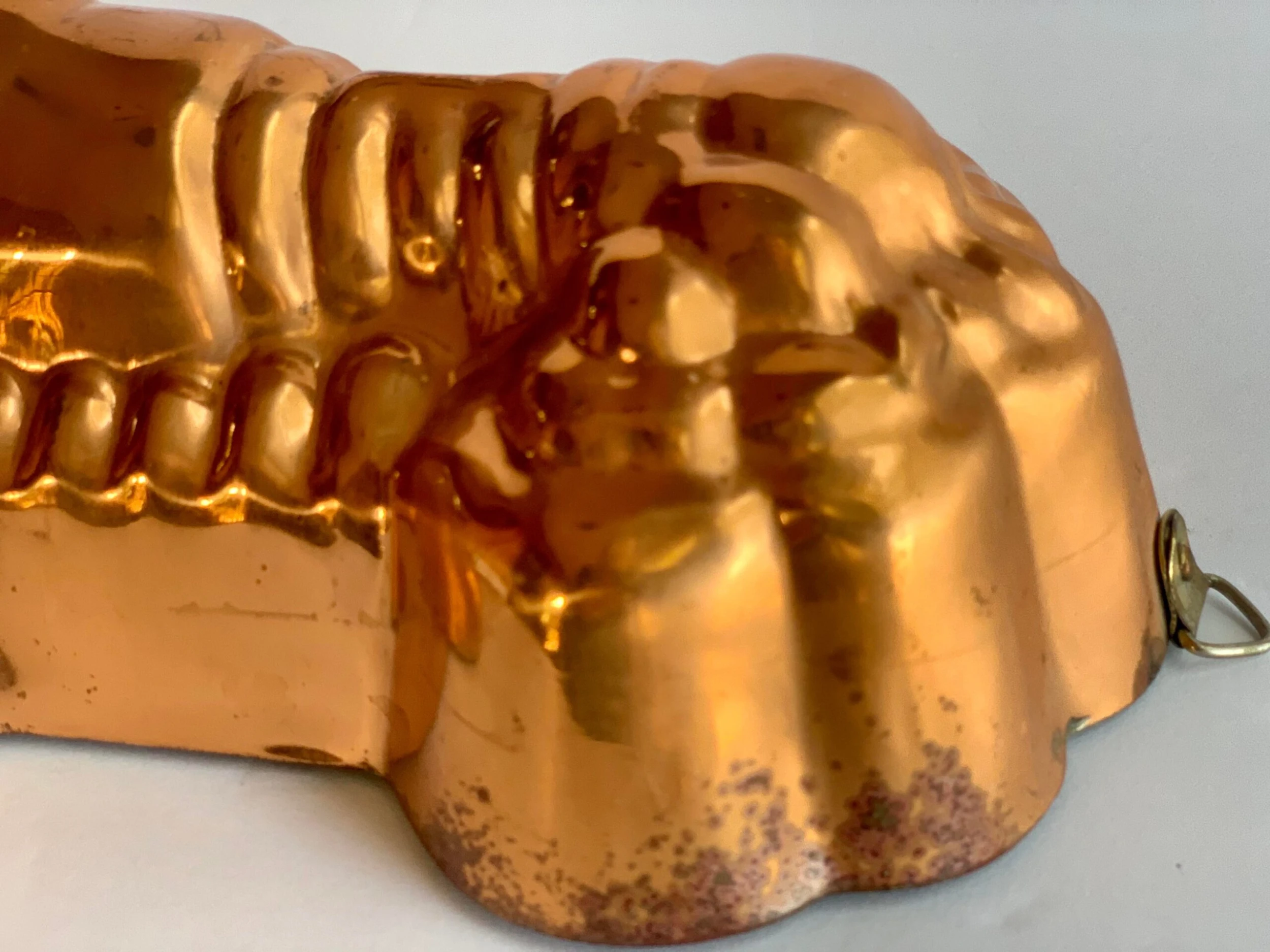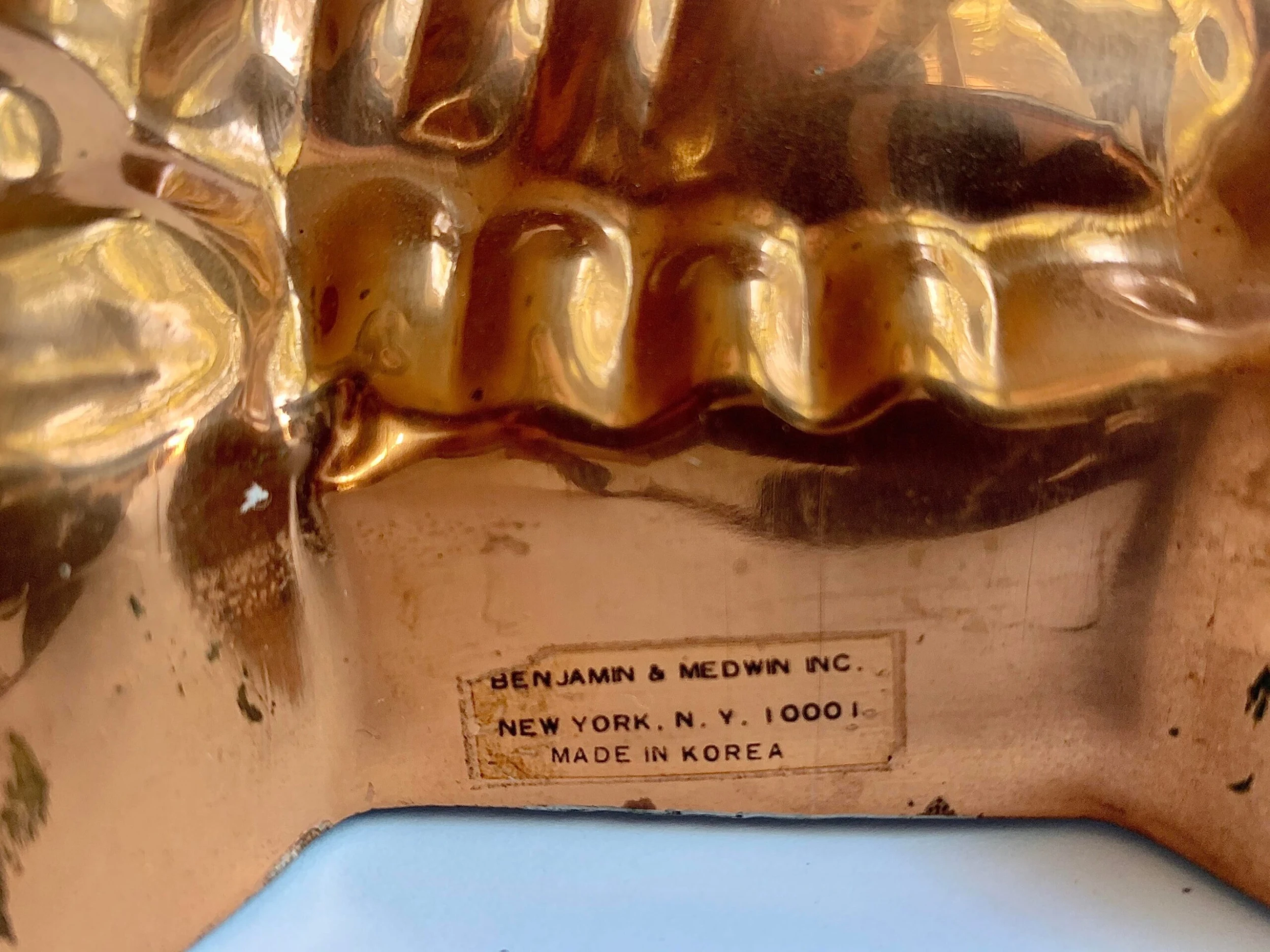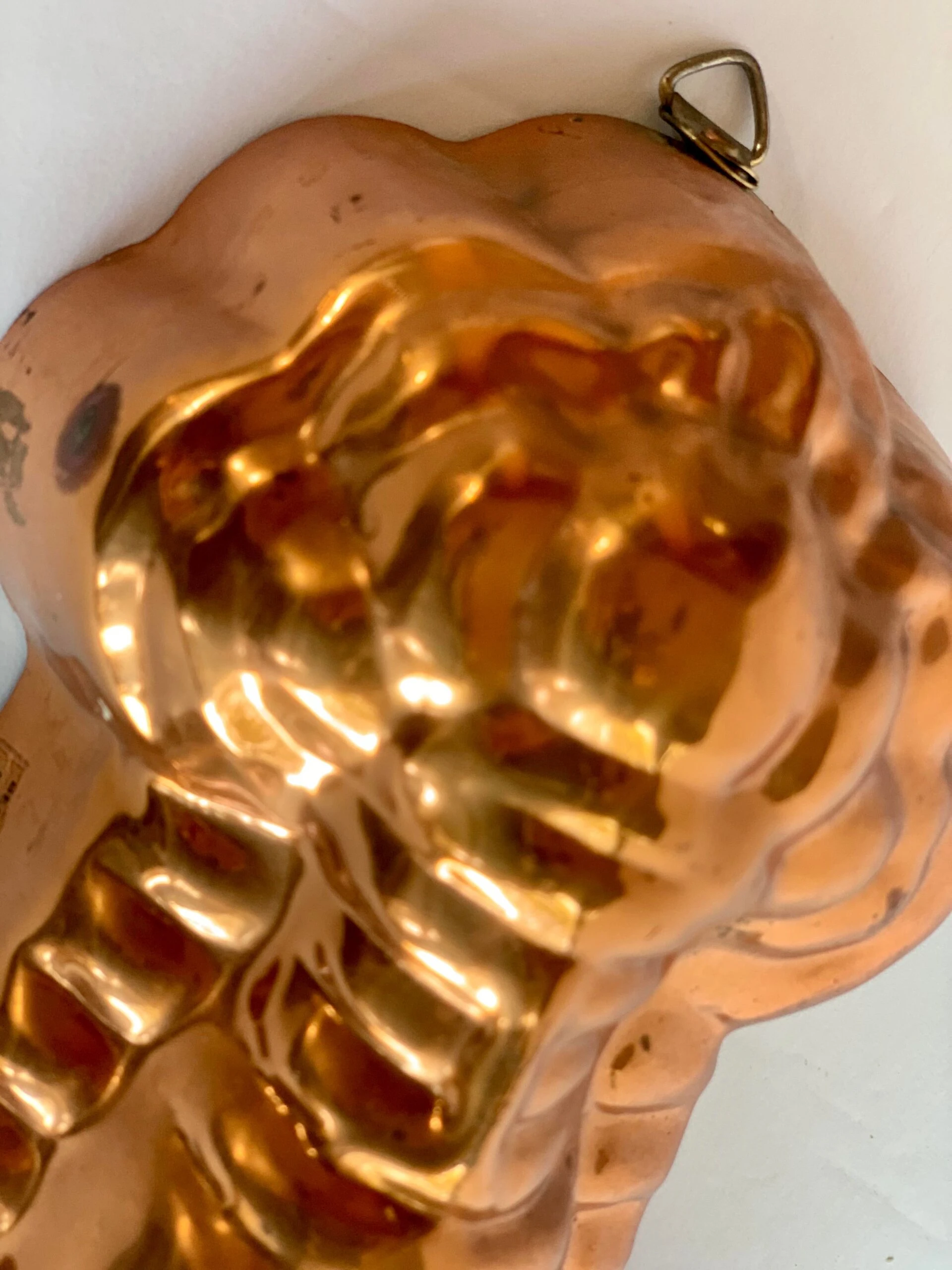 Vintage 1980’s lobster kitchen mold made by Benjamin & Medwin Inc. The highly detailed copper over tin mold has a rich, aged patina and a brass hook for hanging. There is a makers mark on the side and reads, Benjamin & Medwin Inc, New York. This piece would be a wonderful addition to any kitchen, especially in a coastal setting.