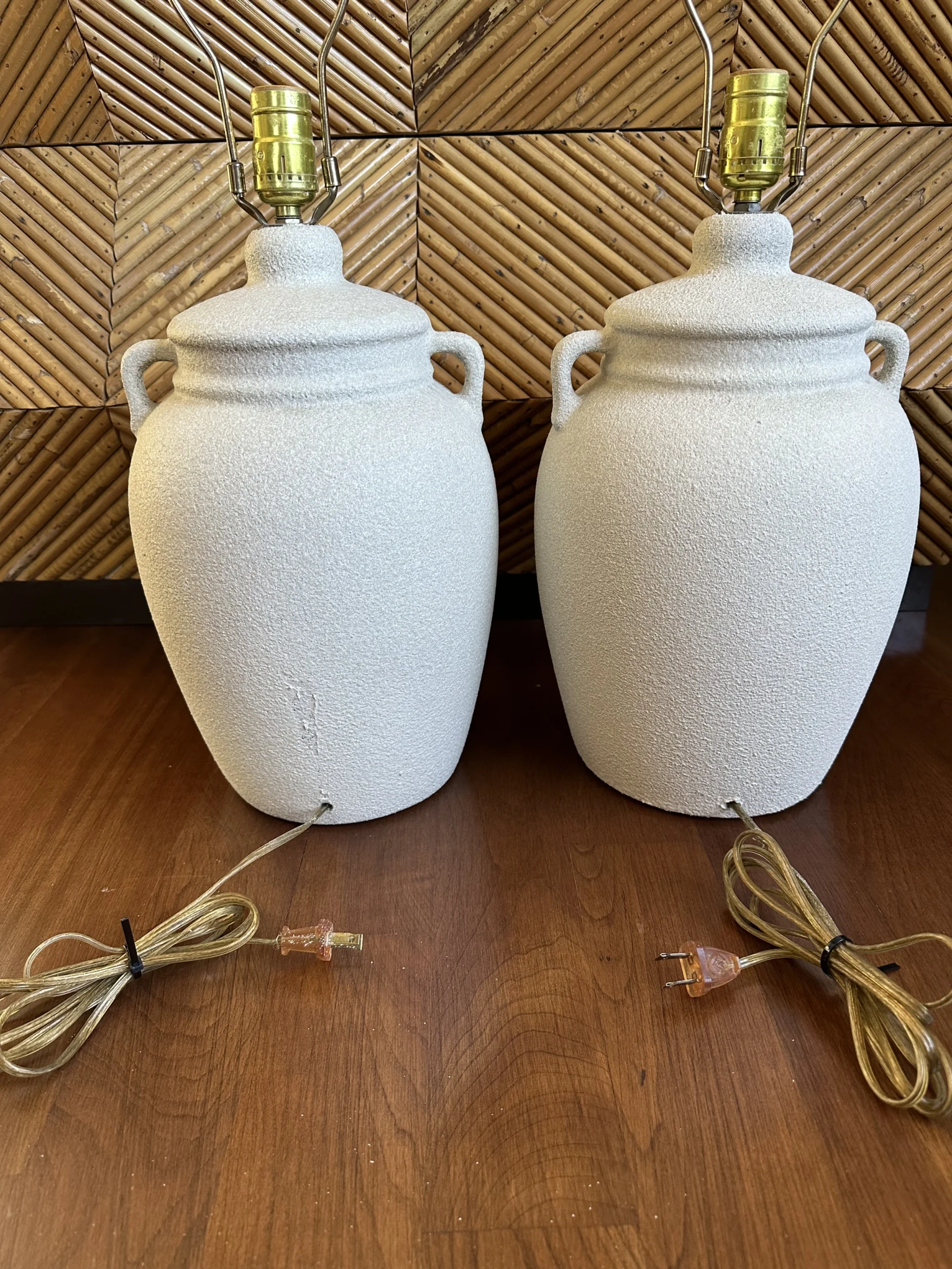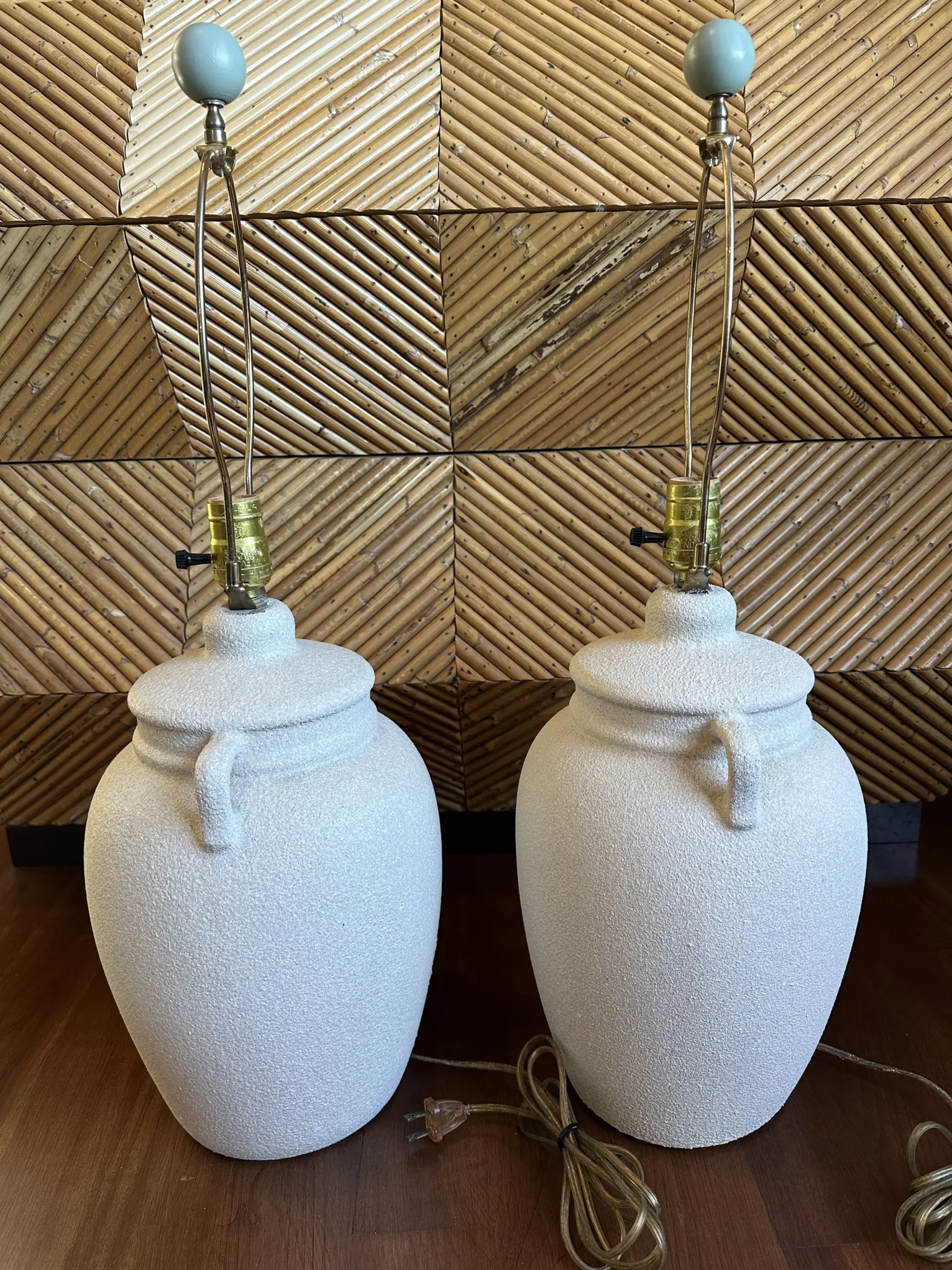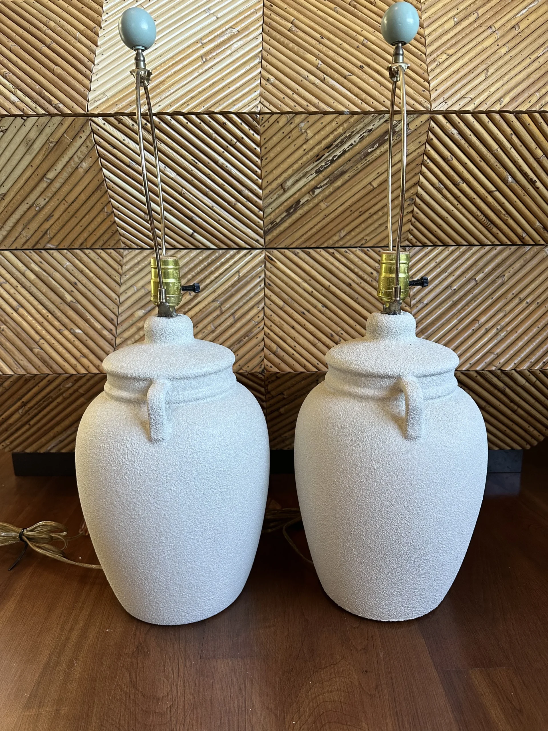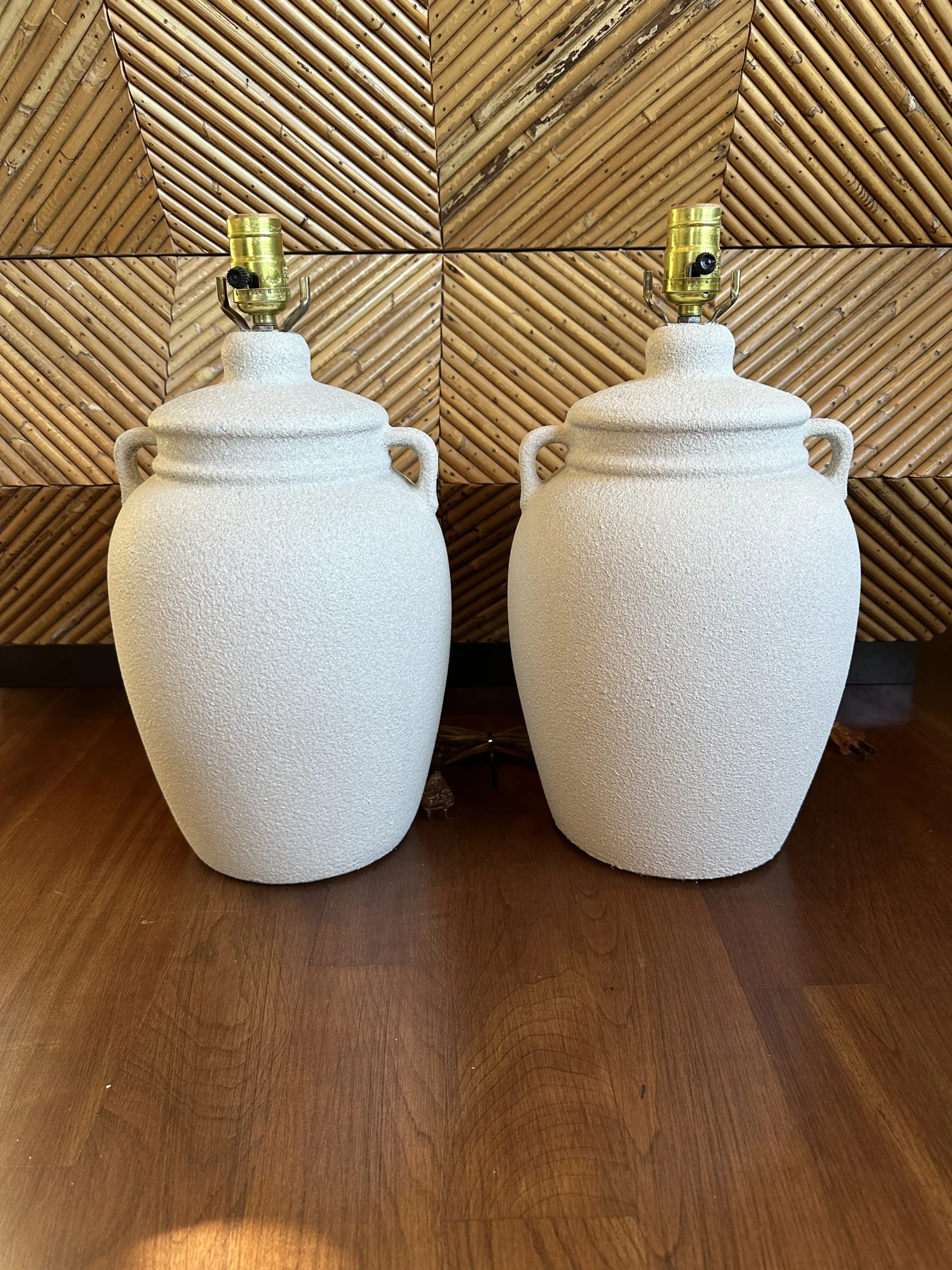 Terrific pair of 1980’s textured plaster table lamps in a great ivory/taupe/ light oatmeal shade.
