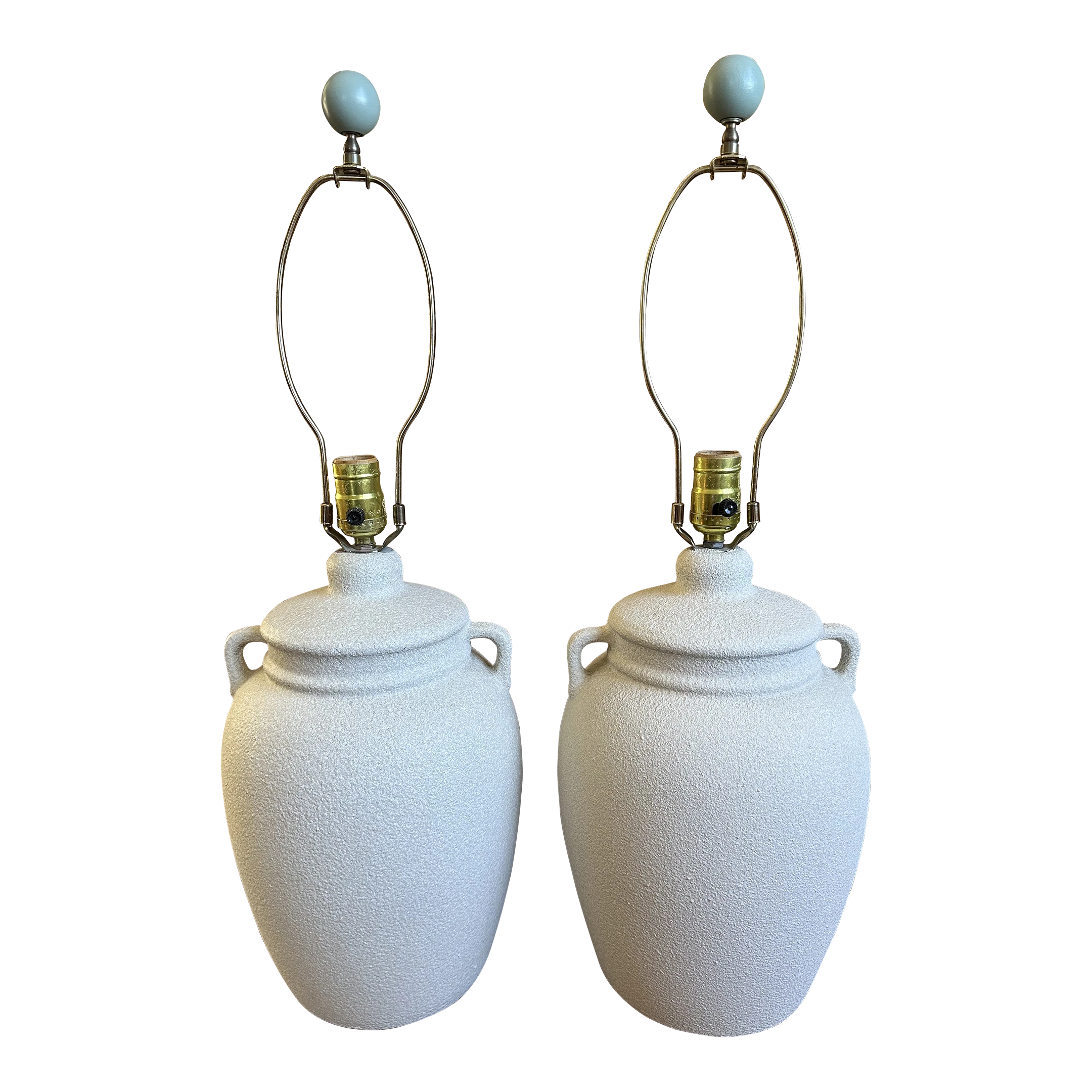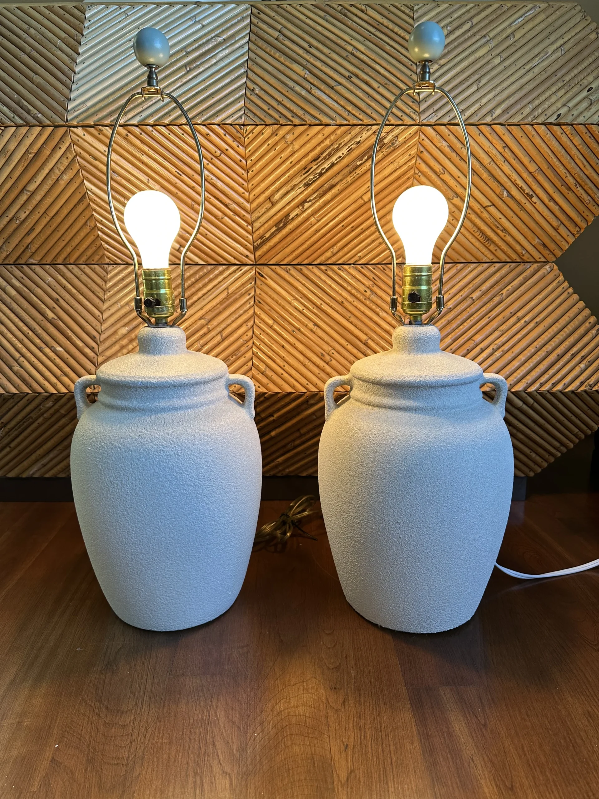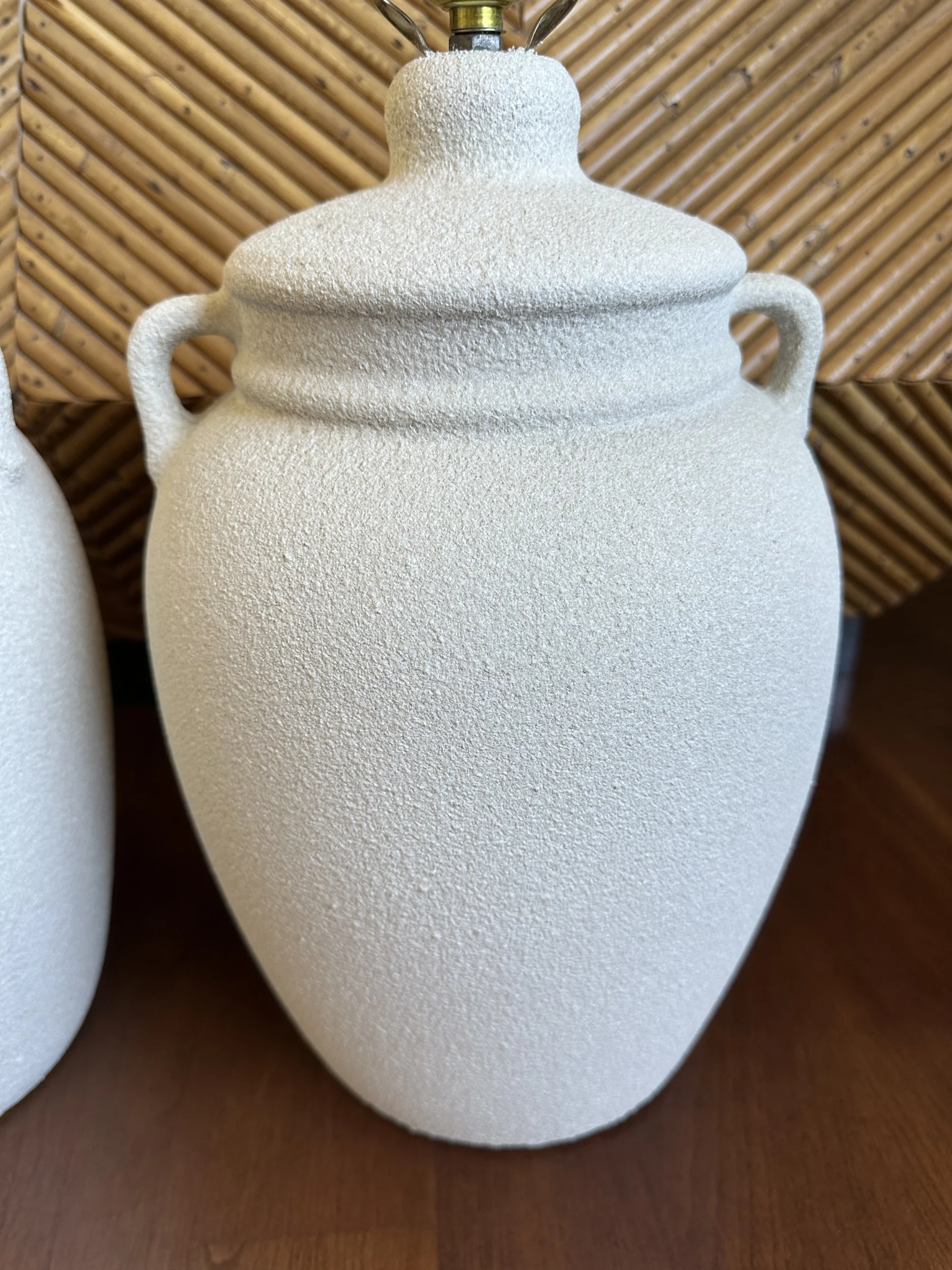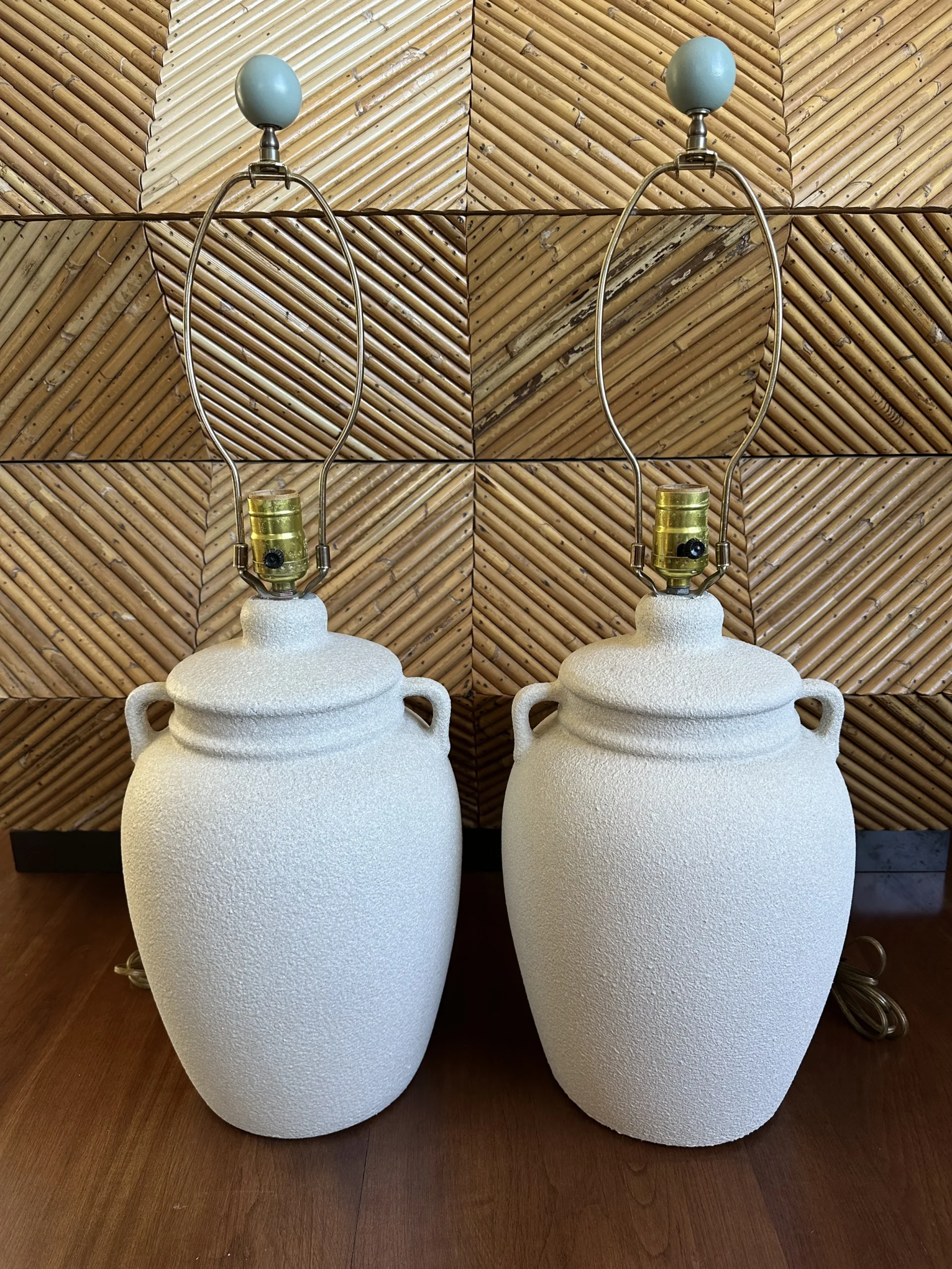 Terrific pair of 1980’s textured plaster table lamps in a great ivory/taupe/ light oatmeal shade.