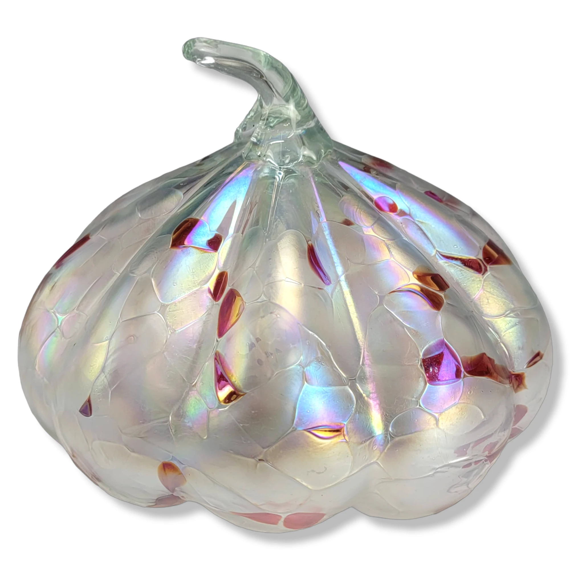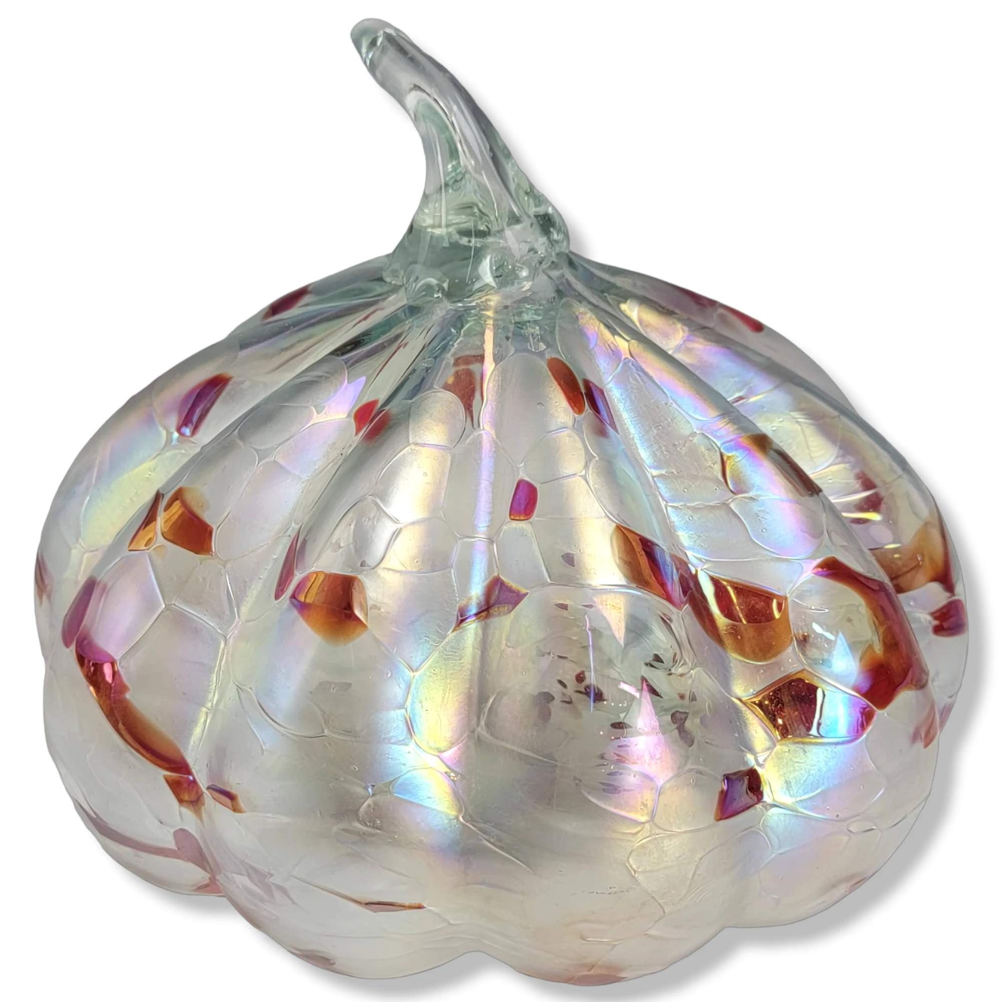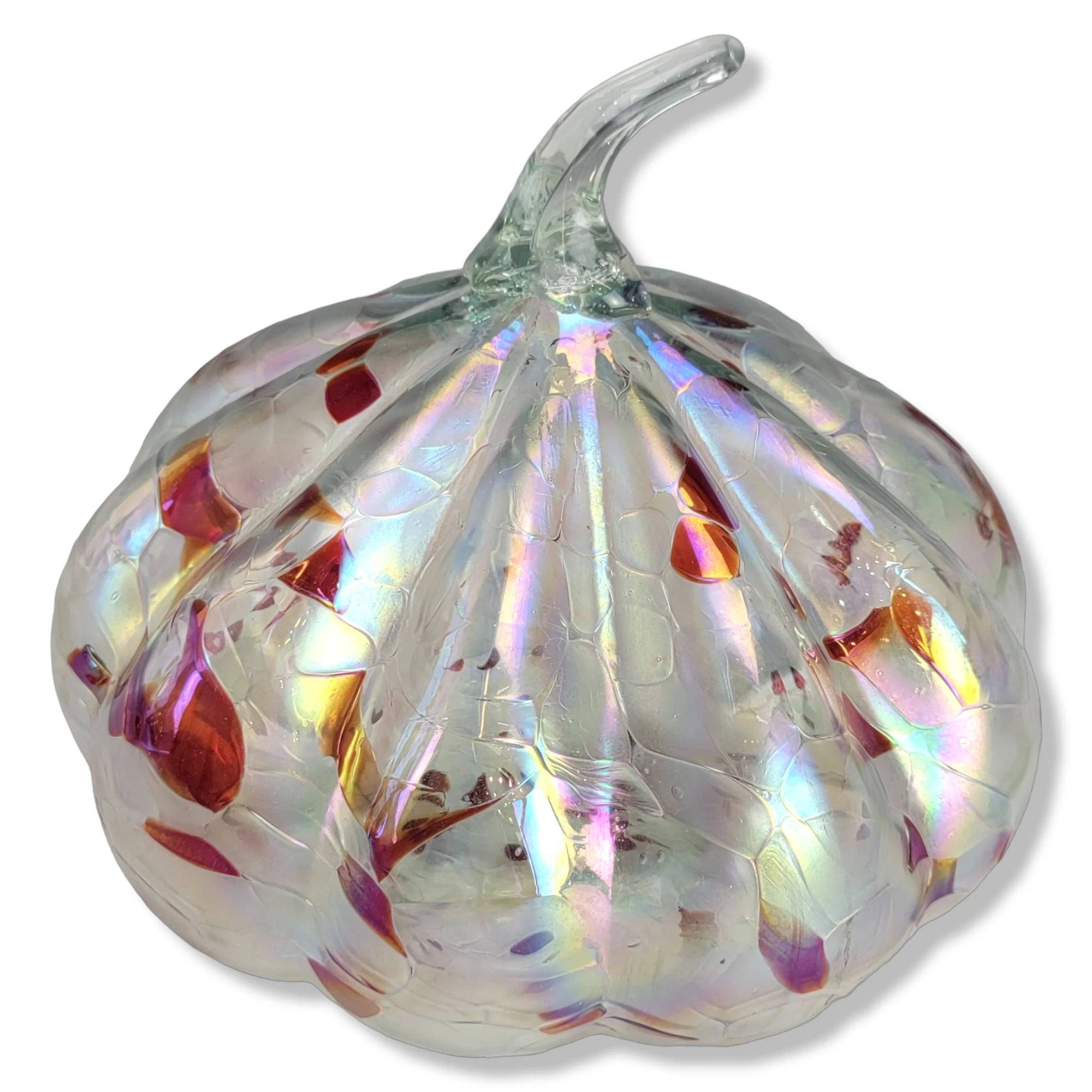 This is a gorgeous iridescent white and red glass pumpkin figurine. The item features an iridescent hand blown glass pumpkin/gourd …