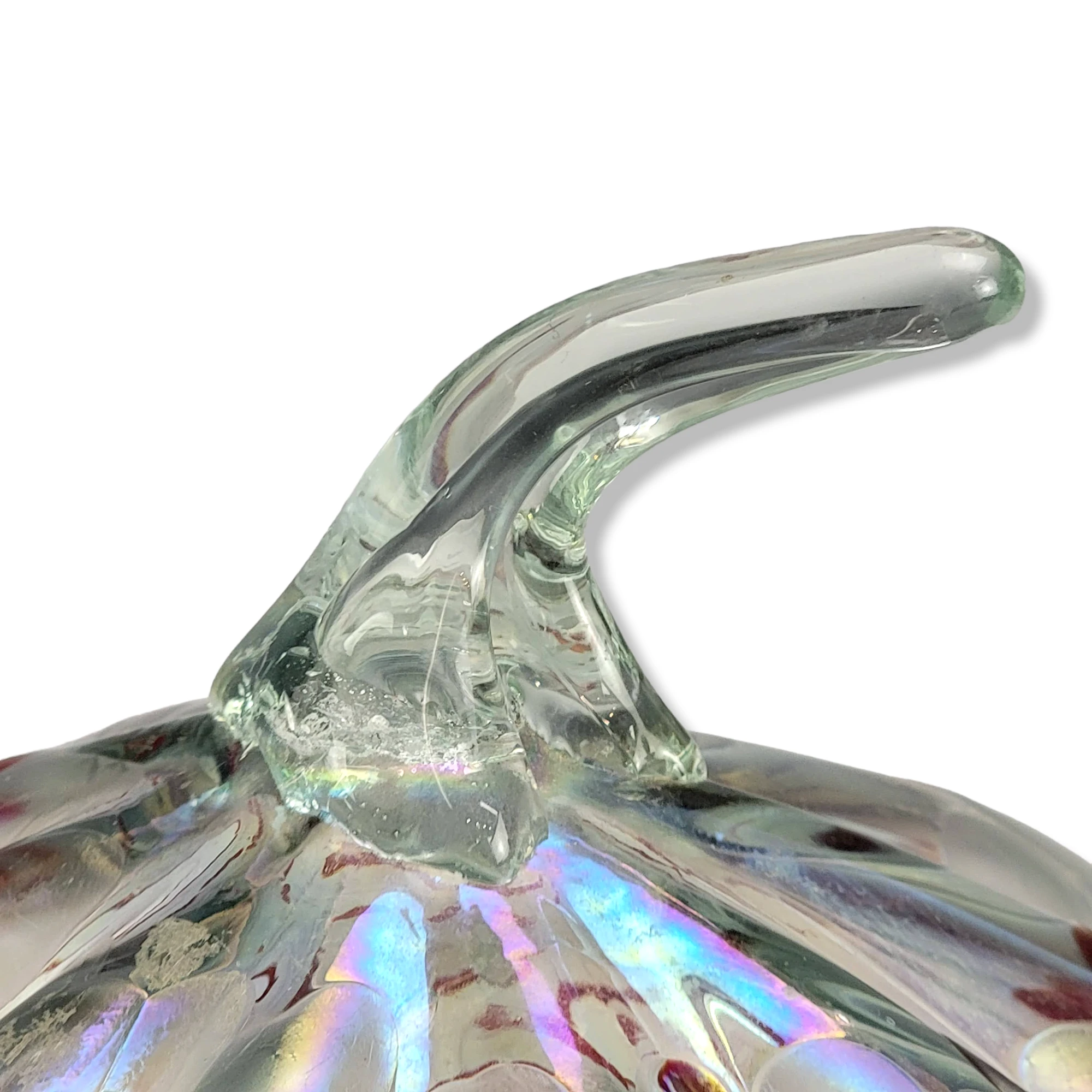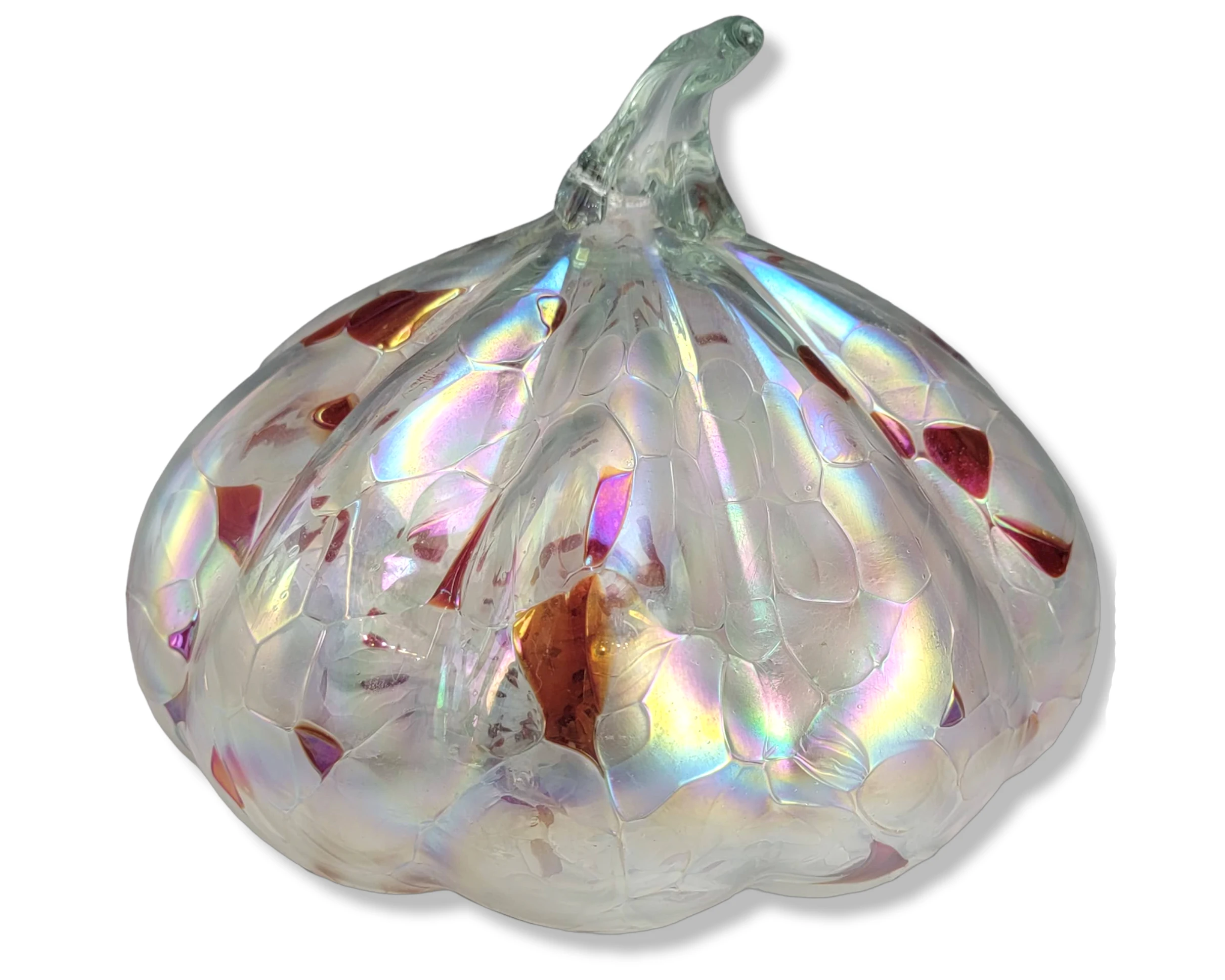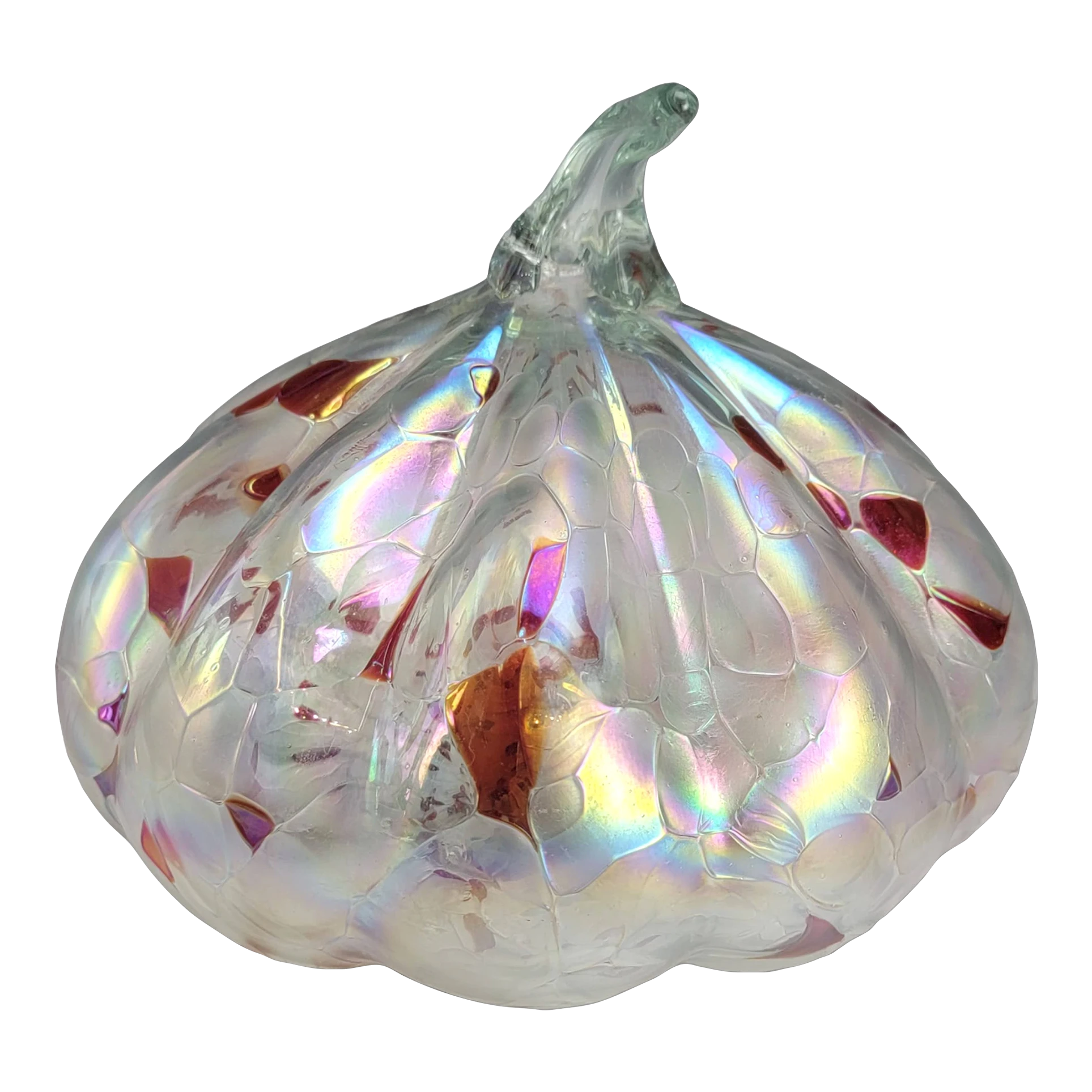 This is a gorgeous iridescent white and red glass pumpkin figurine. The item features an iridescent hand blown glass pumpkin/gourd …
