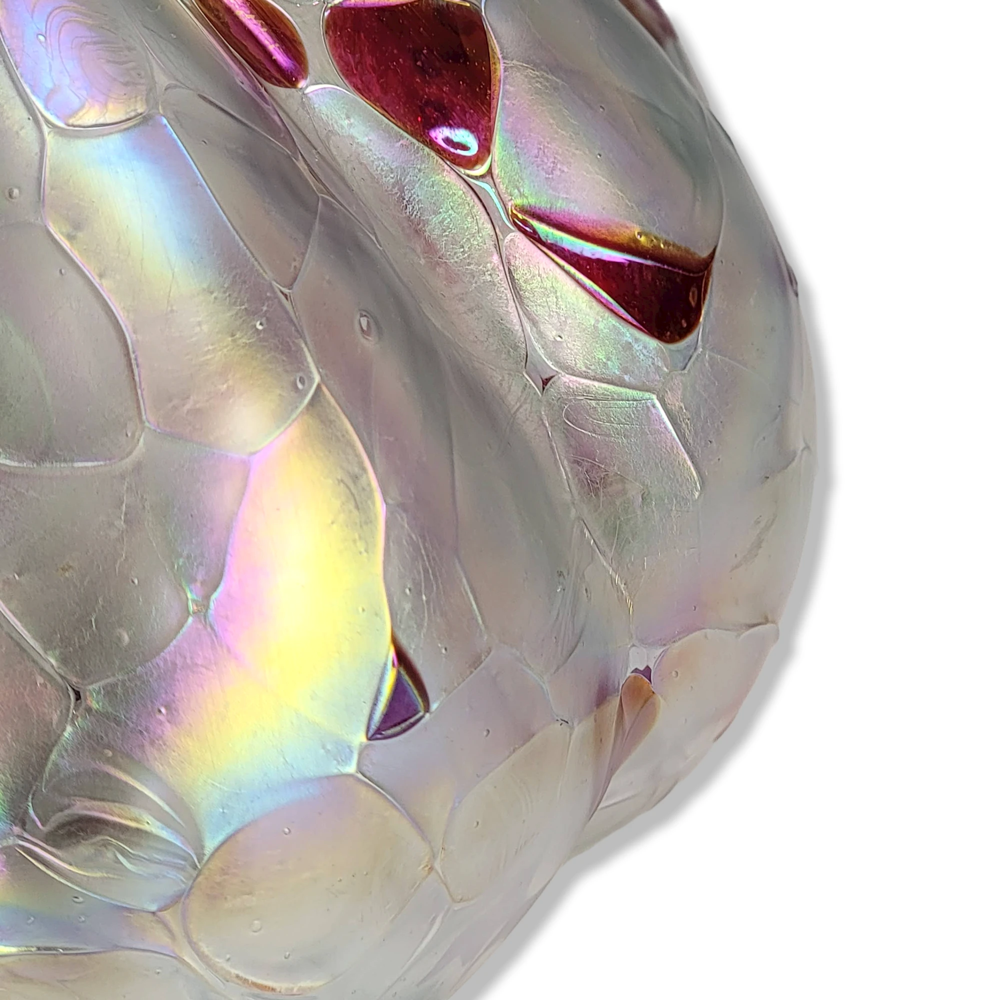 This is a gorgeous iridescent white and red glass pumpkin figurine. The item features an iridescent hand blown glass pumpkin/gourd in white and red color. This pumpkin will make an inspired gift or wonderful addition to your personal collection. The pumpkin has no maker’s mark.