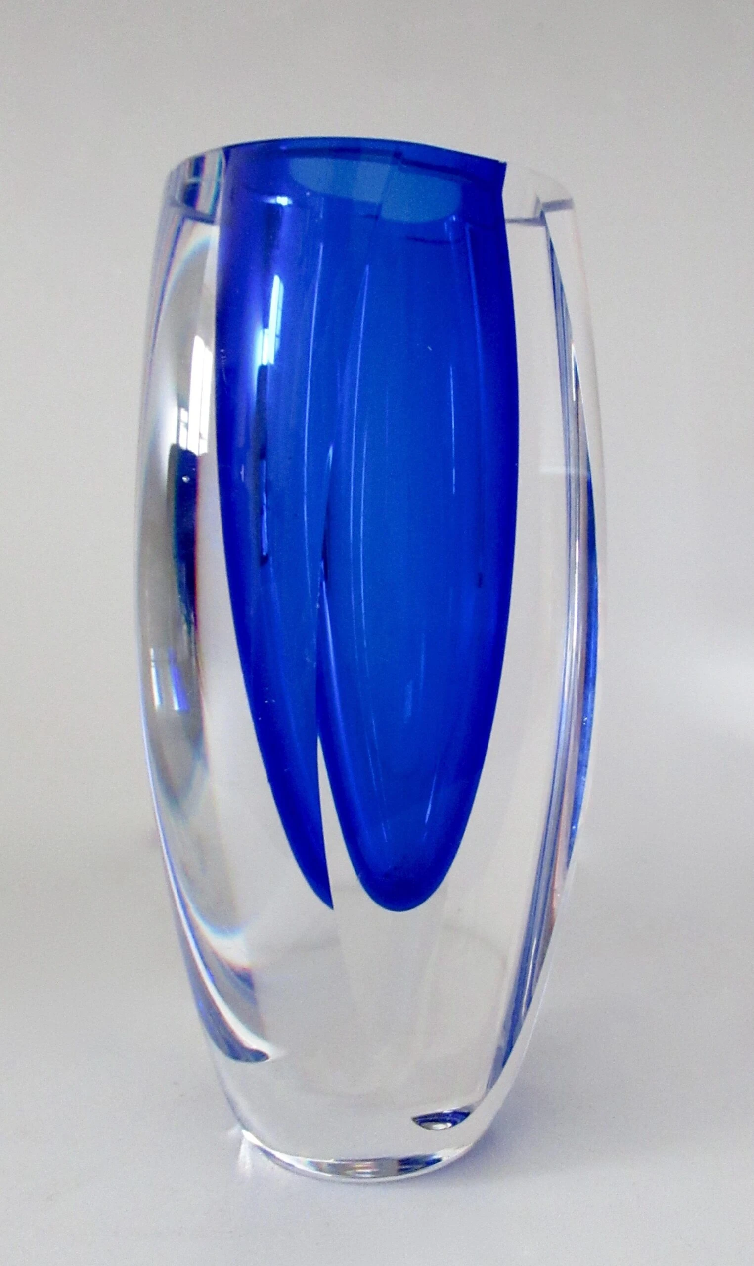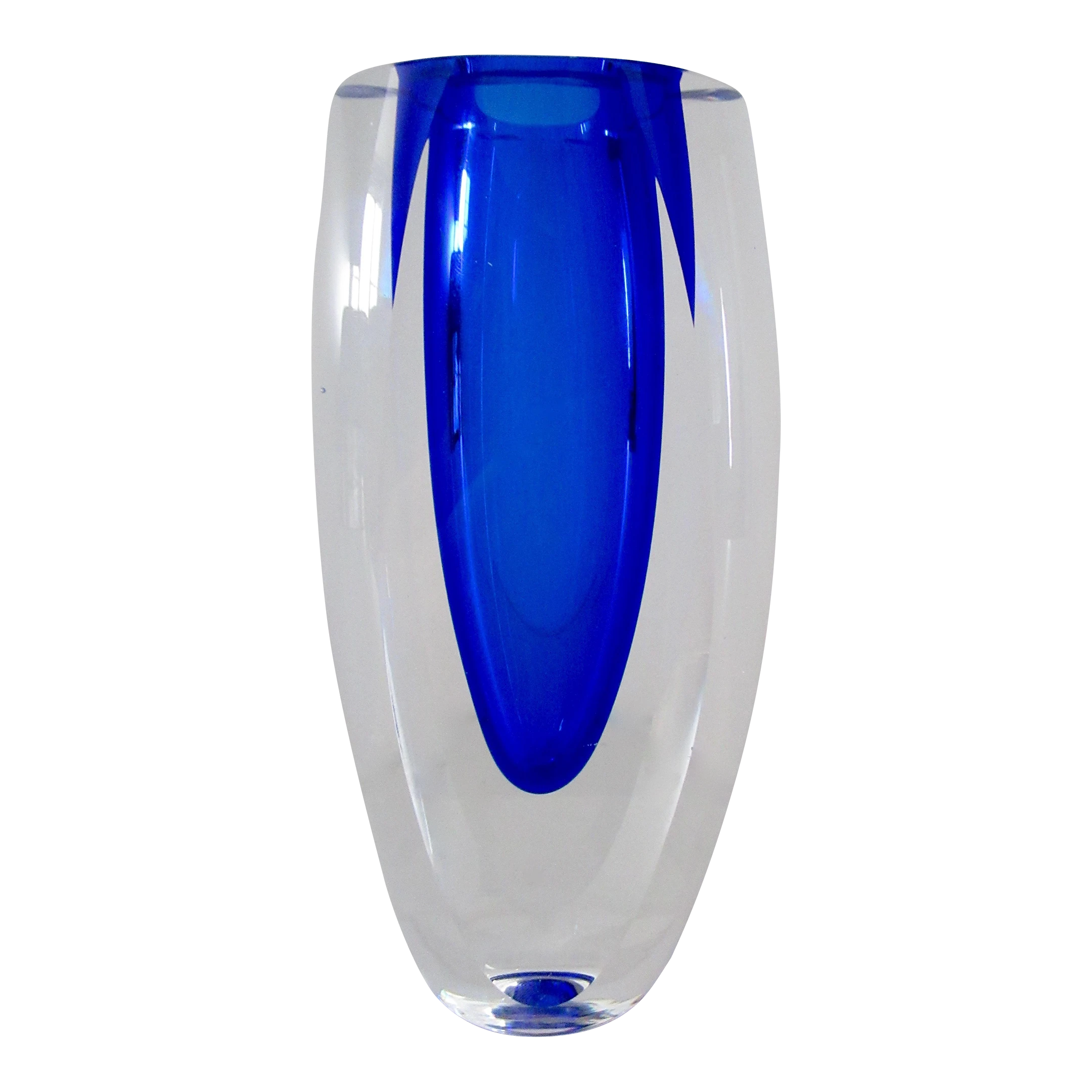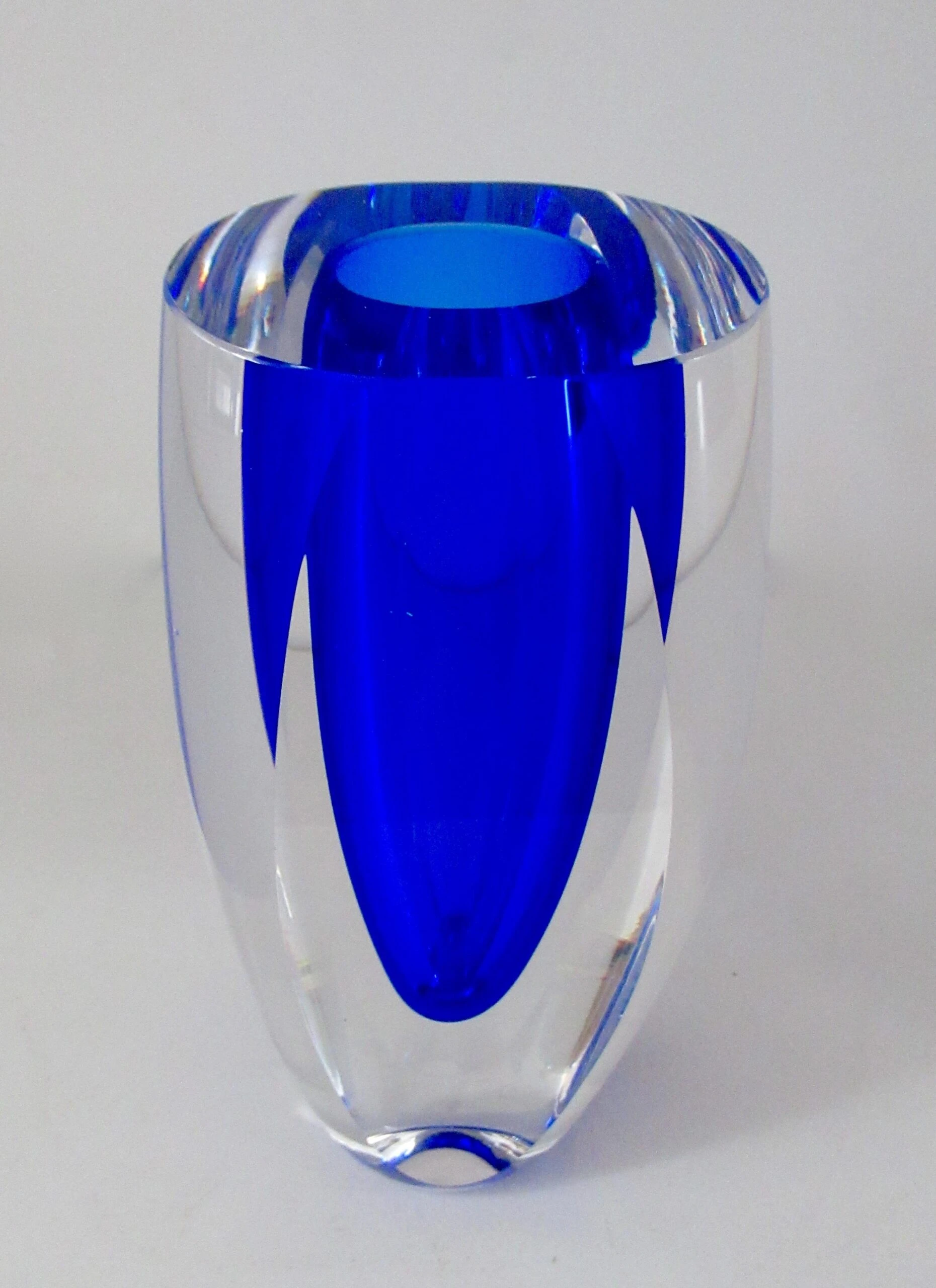 Vintage; C.1970’s Italian, hand-blown Alessandro Mandruzato, ovoid-shaped body and into a flat topped highly polished Murano, in a cobalt to Ultramarine blue depth of coronation with an outer clear/transparent layering, with 2-sided flat, polished side. Depending upon positioning and/or display, the nuanced facets will take on more depth perception, and crisp, nuanced facets project either more or less given all the aforementioned, including natural and unnatural light refracting upon such a full-bodied and solidly heavy piece of Murano. Alessandro Mandruzzato is one of the permanent, Murano glass blowers, with a much coveted following, given the period from the 1930’s- and into the late 1970’s spawned one of the most prolific, generation of Venetian Murano Glass blowers, including passing the artisan creative process from family member(s), in sustaining, growing, and art of Murano Glass blowing with such following, amongst collectors, tourists, and the likes. In excellent condition. No chips, nor flea bites. From an Upstate, NY Estate.