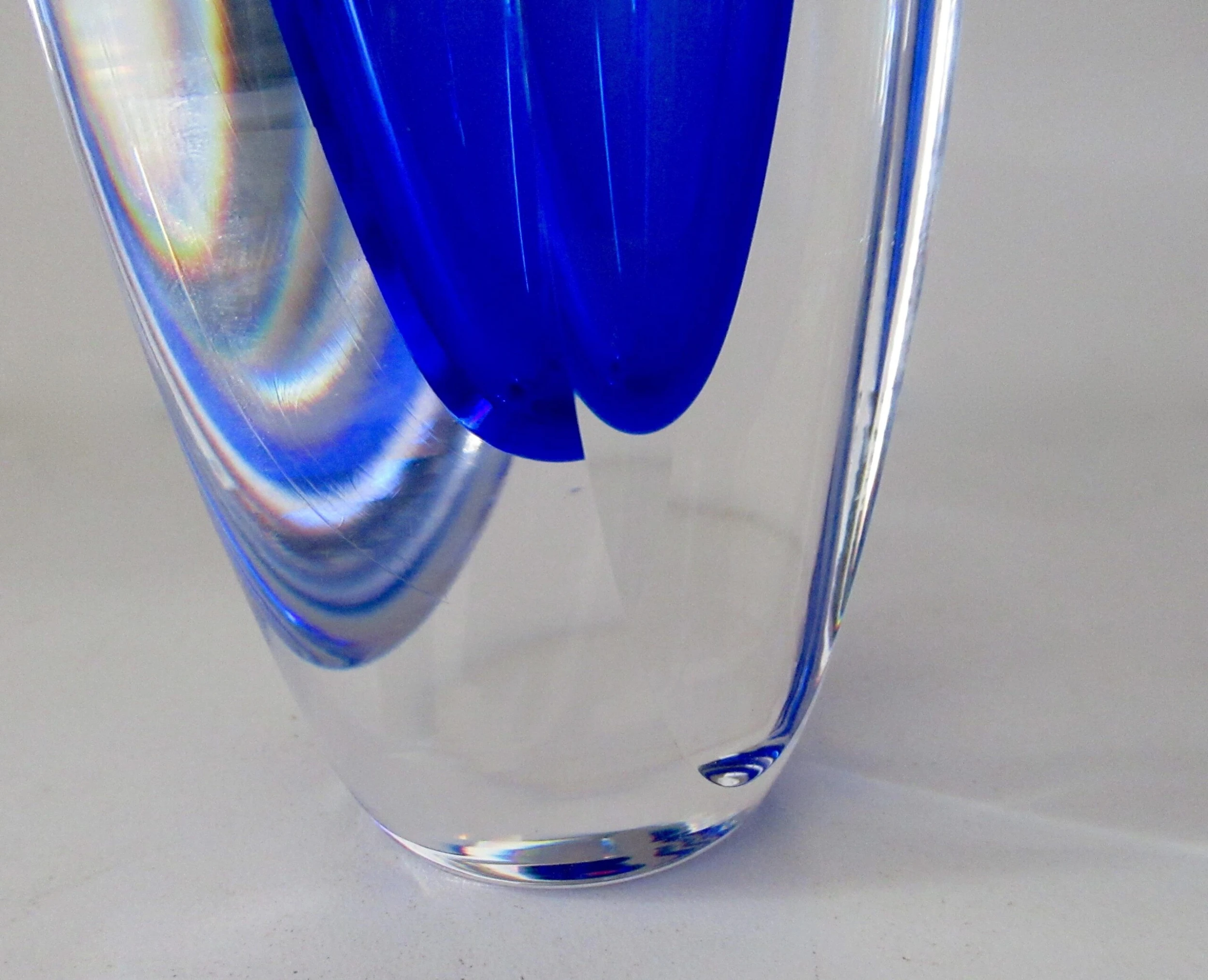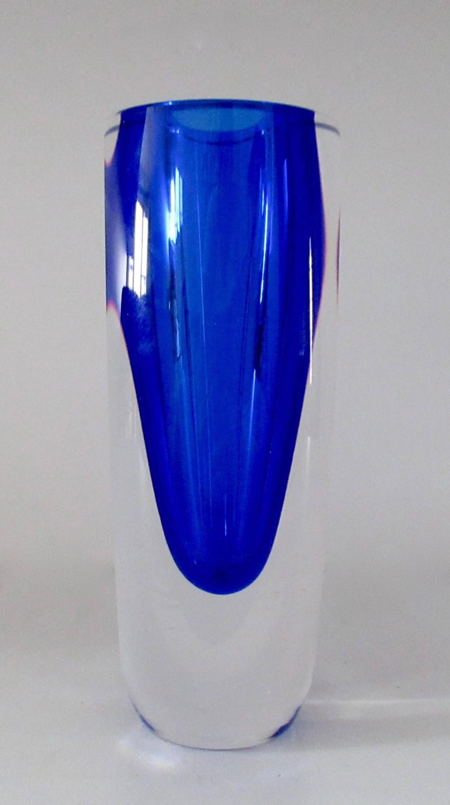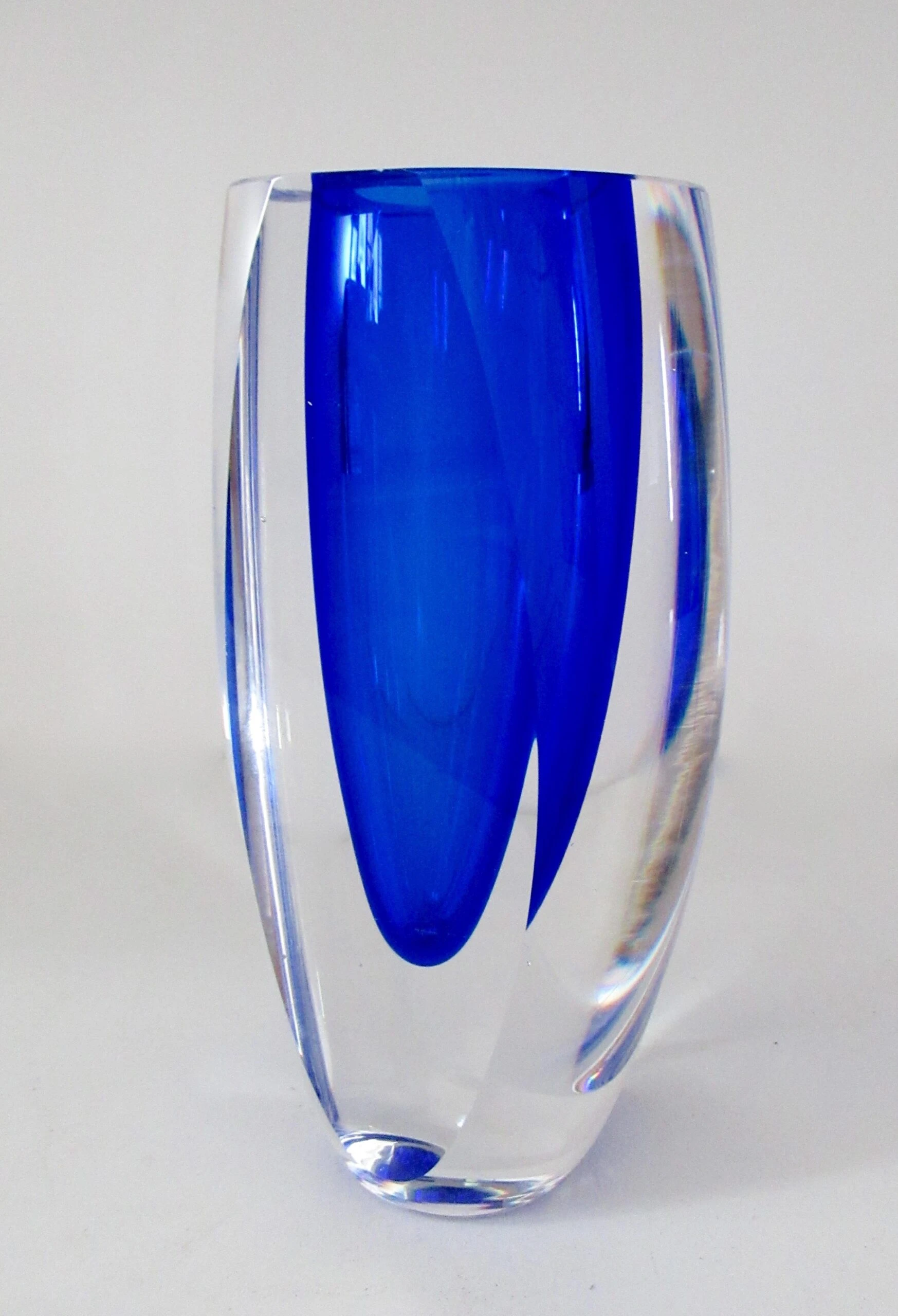 Vintage; C.1970’s Italian, hand-blown Alessandro Mandruzato, ovoid-shaped body and into a flat topped highly polished Murano, in a cobalt to Ultramarine blue depth of coronation with an outer clear/transparent layering, with 2-sided flat, polished side. Depending upon positioning and/or display, the nuanced facets will take on more depth perception, and crisp, nuanced facets project either more or less given all the aforementioned, including natural and unnatural light refracting upon such a full-bodied and solidly heavy piece of Murano. Alessandro Mandruzzato is one of the permanent, Murano glass blowers, with a much coveted following, given the period from the 1930’s- and into the late 1970’s spawned one of the most prolific, generation of Venetian Murano Glass blowers, including passing the artisan creative process from family member(s), in sustaining, growing, and art of Murano Glass blowing with such following, amongst collectors, tourists, and the likes. In excellent condition. No chips, nor flea bites. From an Upstate, NY Estate.