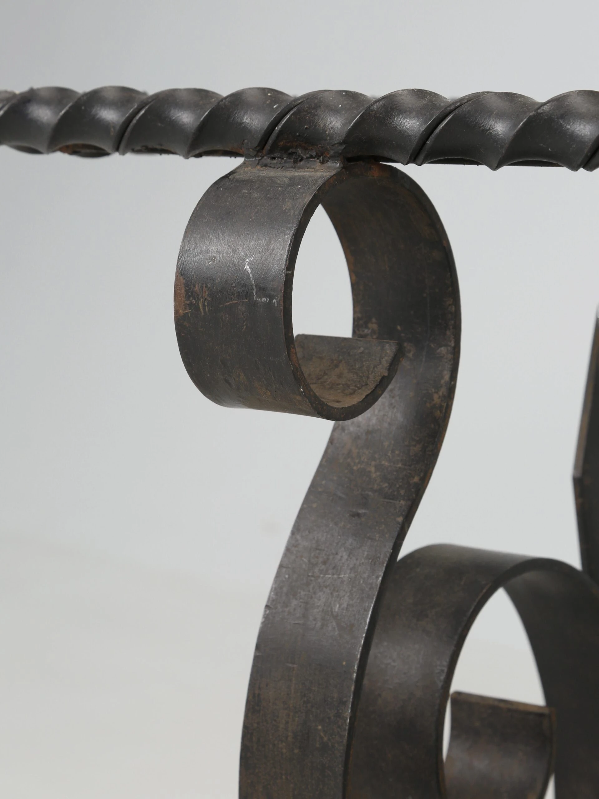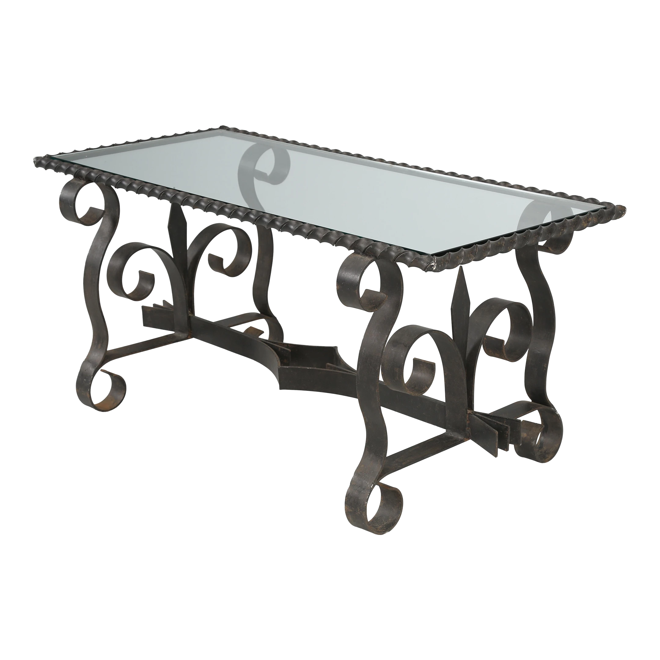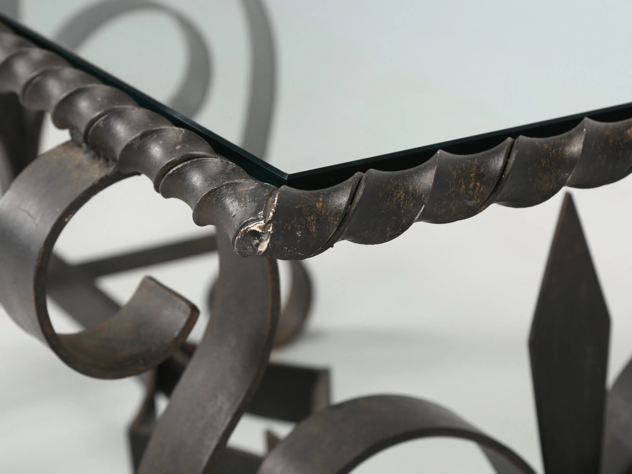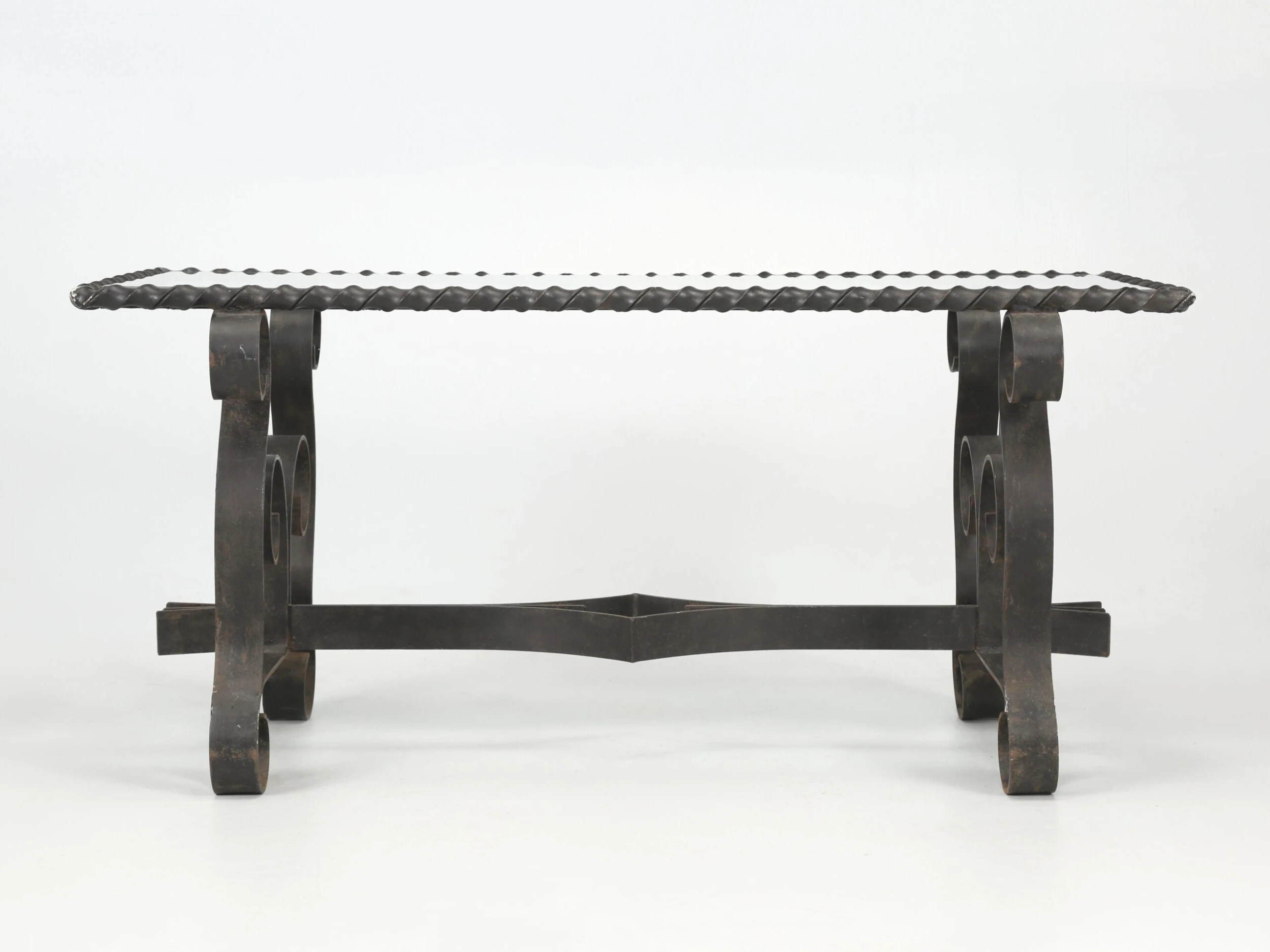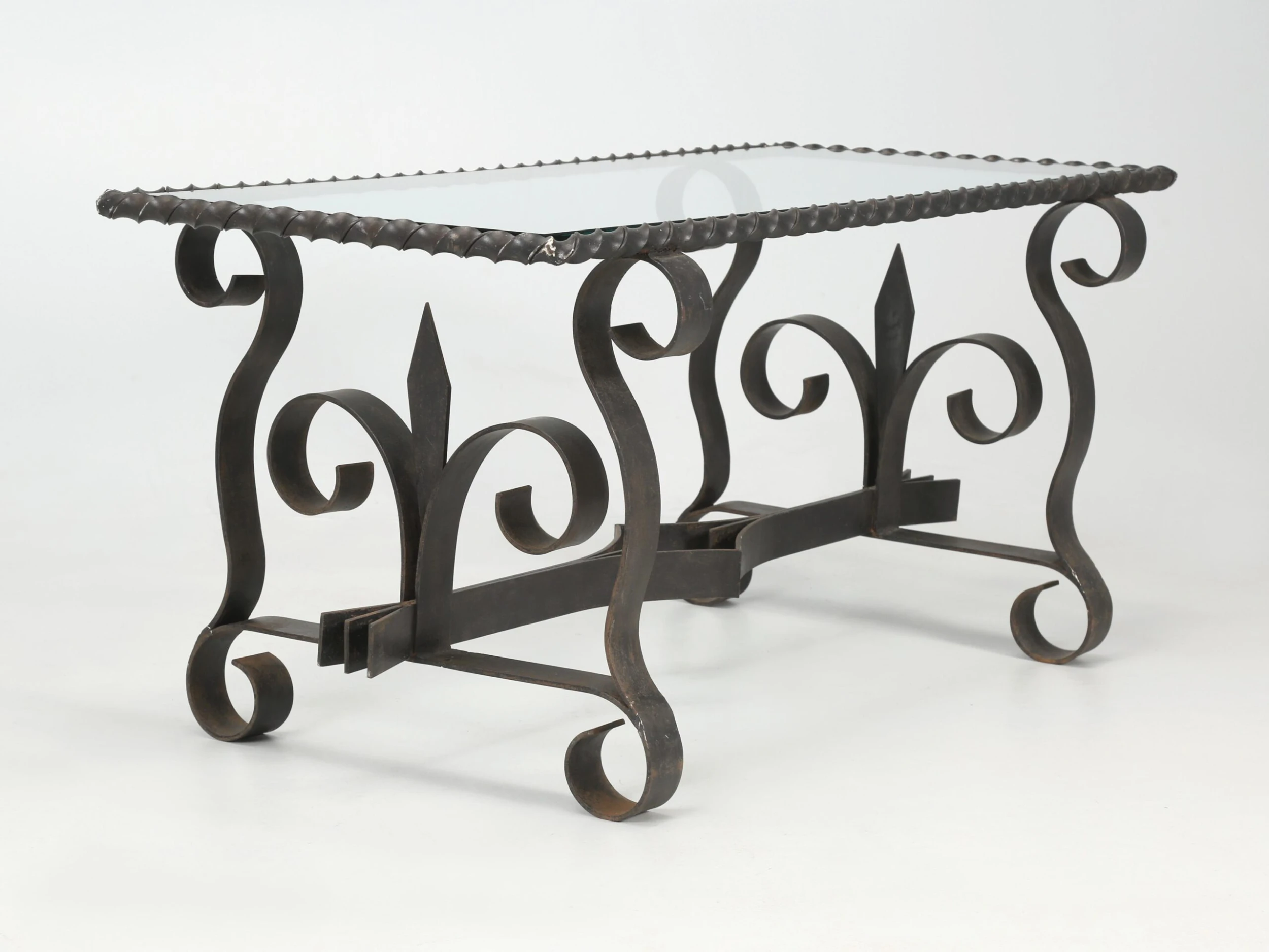Vintage French wrought iron coffee table probably made in the 1950’s or 1960’s and what is especially nice, is the finish. The natural aged patina of the black finish is exactly what you’d hope to see and rarely do. When looking close up, the color is not an absolute pitch black, but rather a bit warmer with very faint hints of other colors showing through. Well-constructed and certainly would hold a stone top if you choose to replace the glass.