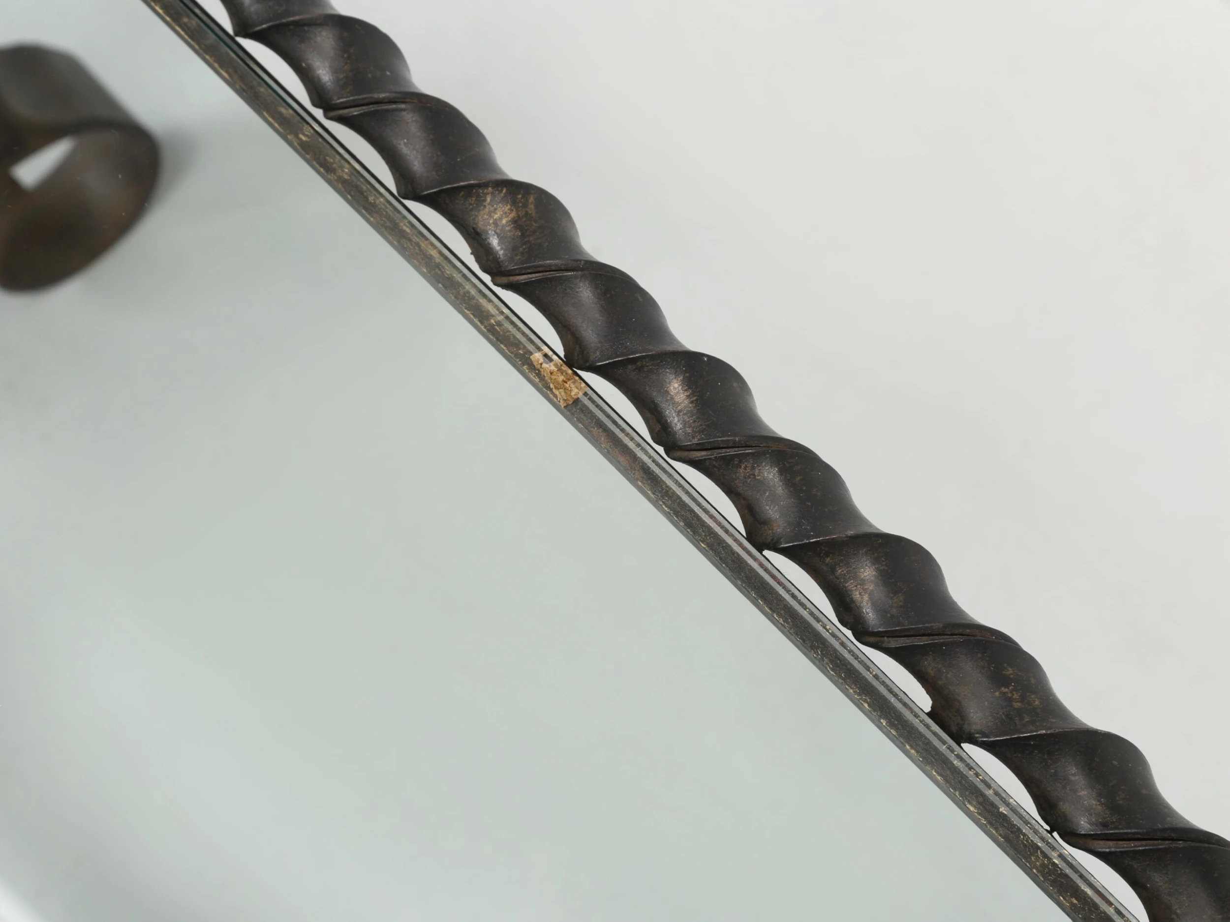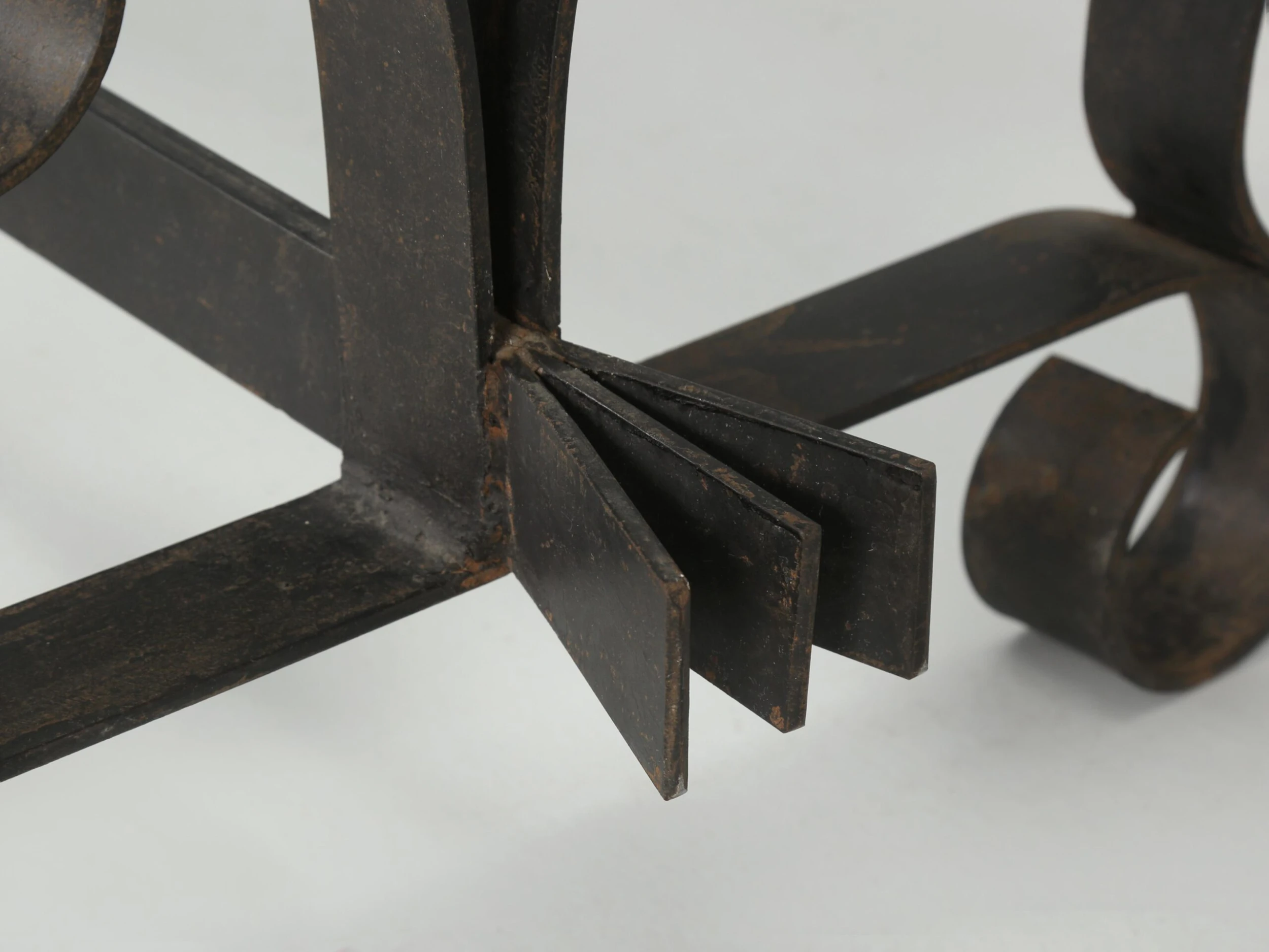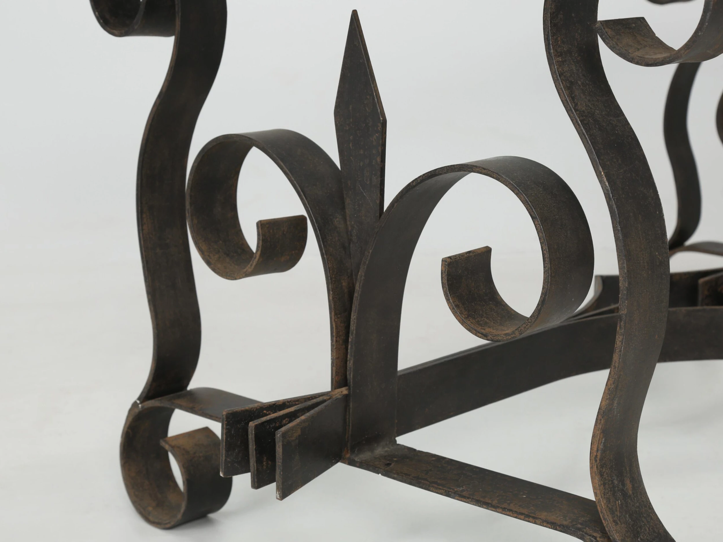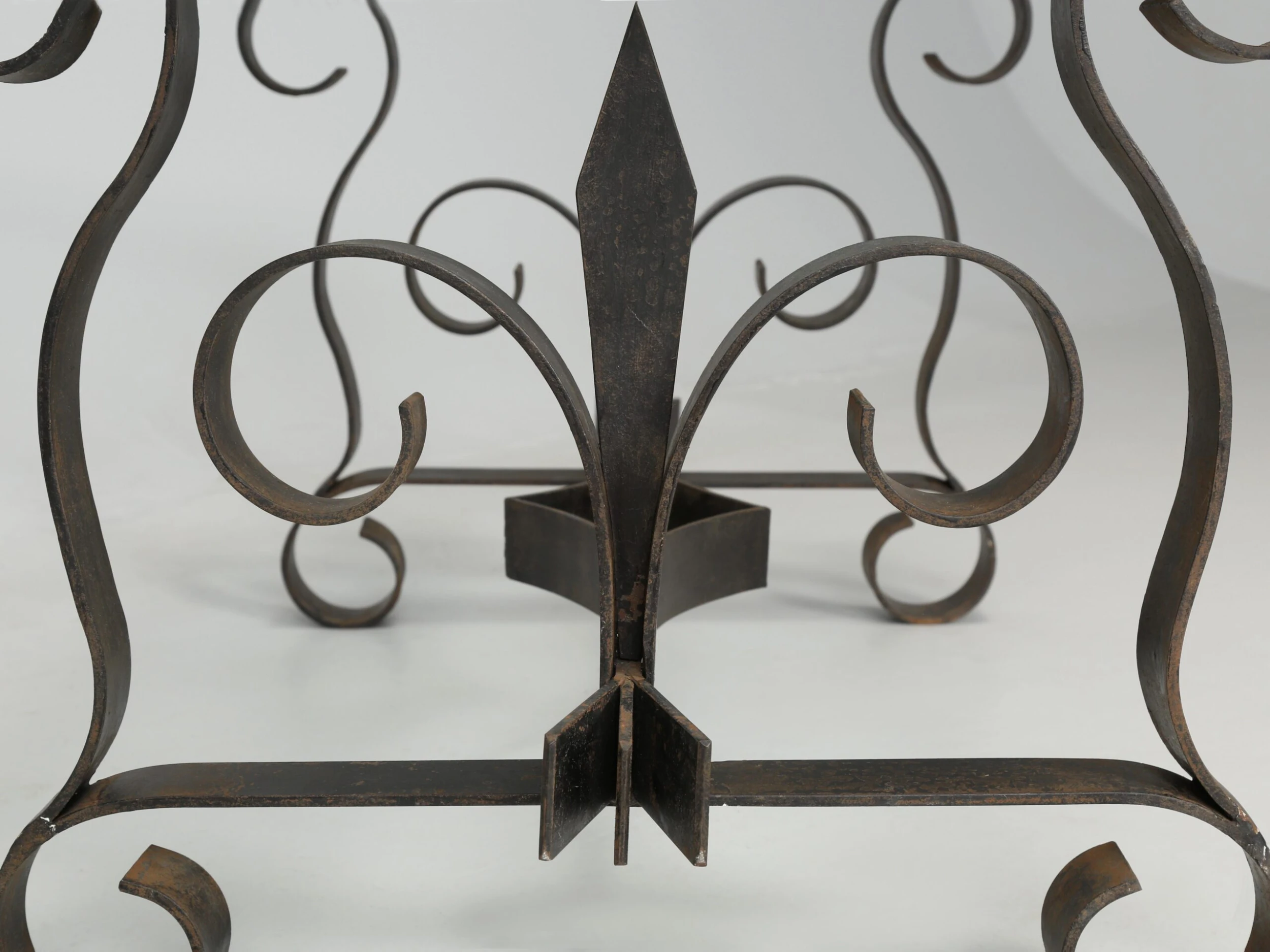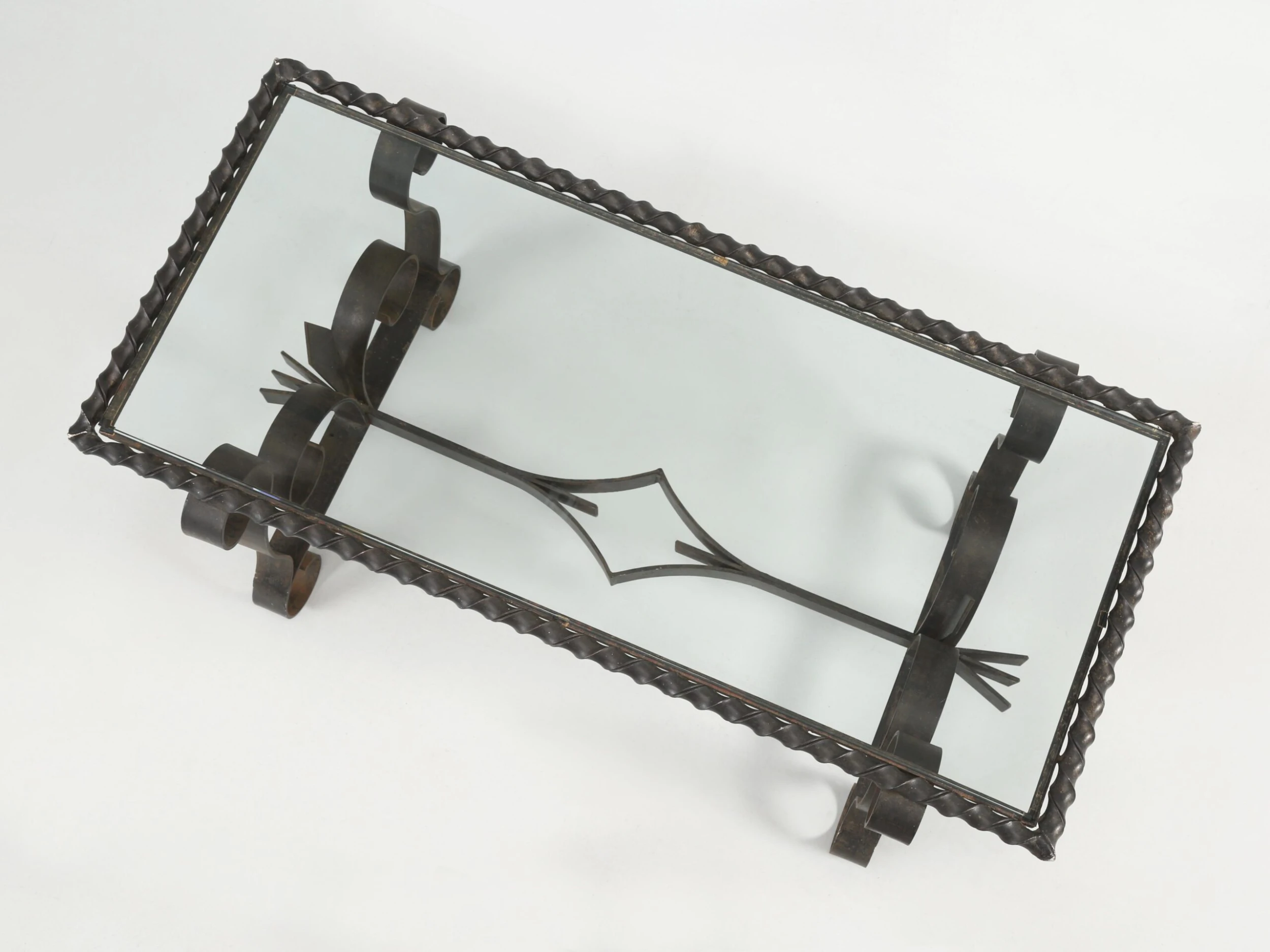 Vintage French wrought iron coffee table probably made in the 1950’s or 1960’s and what is especially nice, is the finish. The natural aged patina of the black finish is exactly what you’d hope to see and rarely do. When looking close up, the color is not an absolute pitch black, but rather a bit warmer with very faint hints of other colors showing through. Well-constructed and certainly would hold a stone top if you choose to replace the glass.
