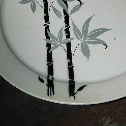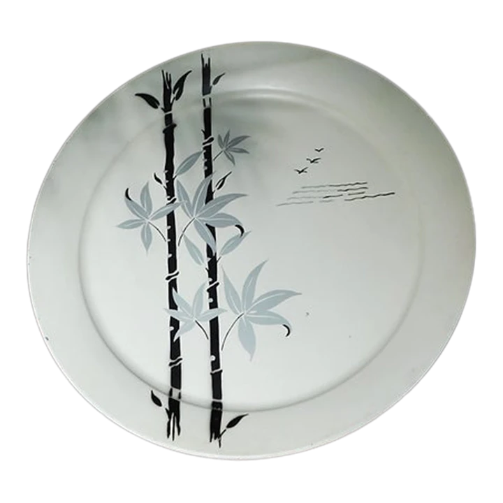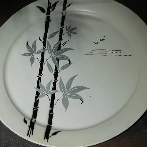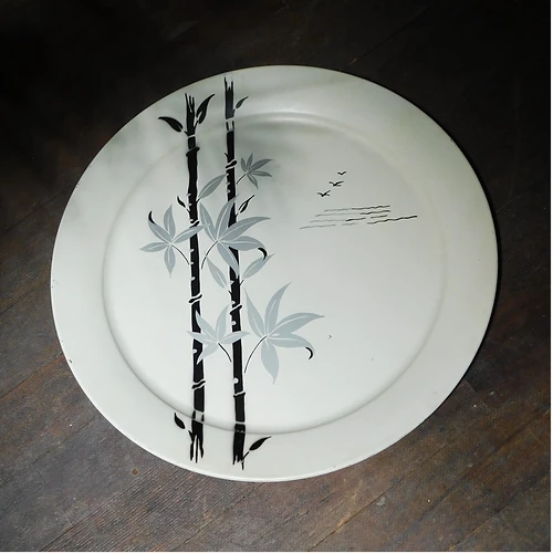 This vintage metal tray features a nice botanical bamboo stalks with seagulls flying in the distance. Great hung as wall art or use for serving!