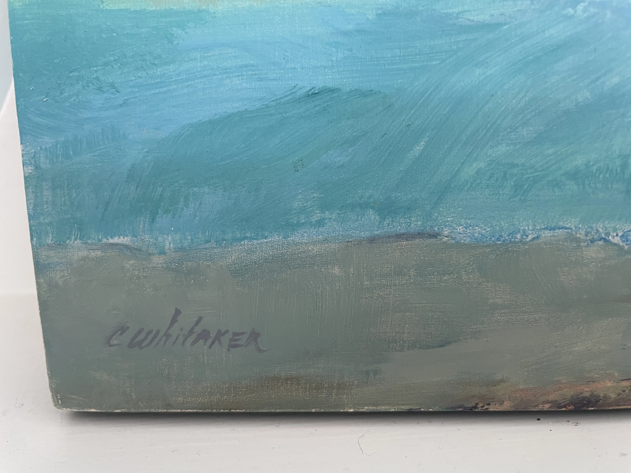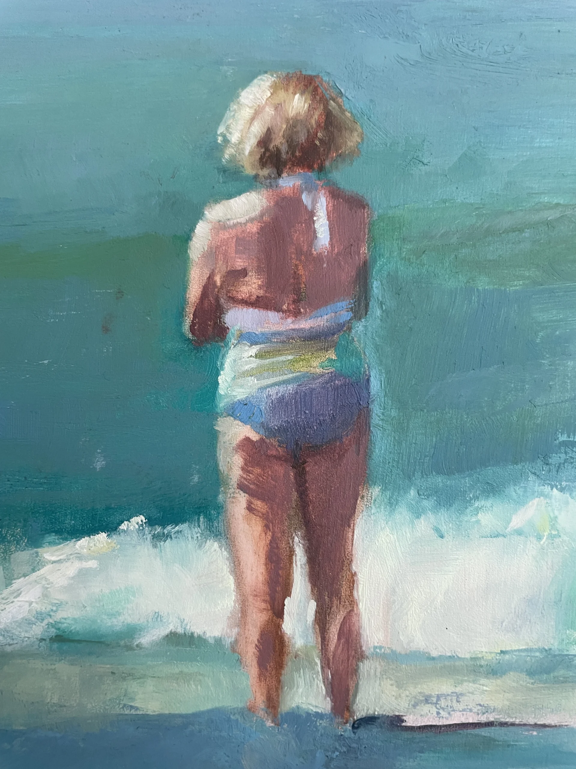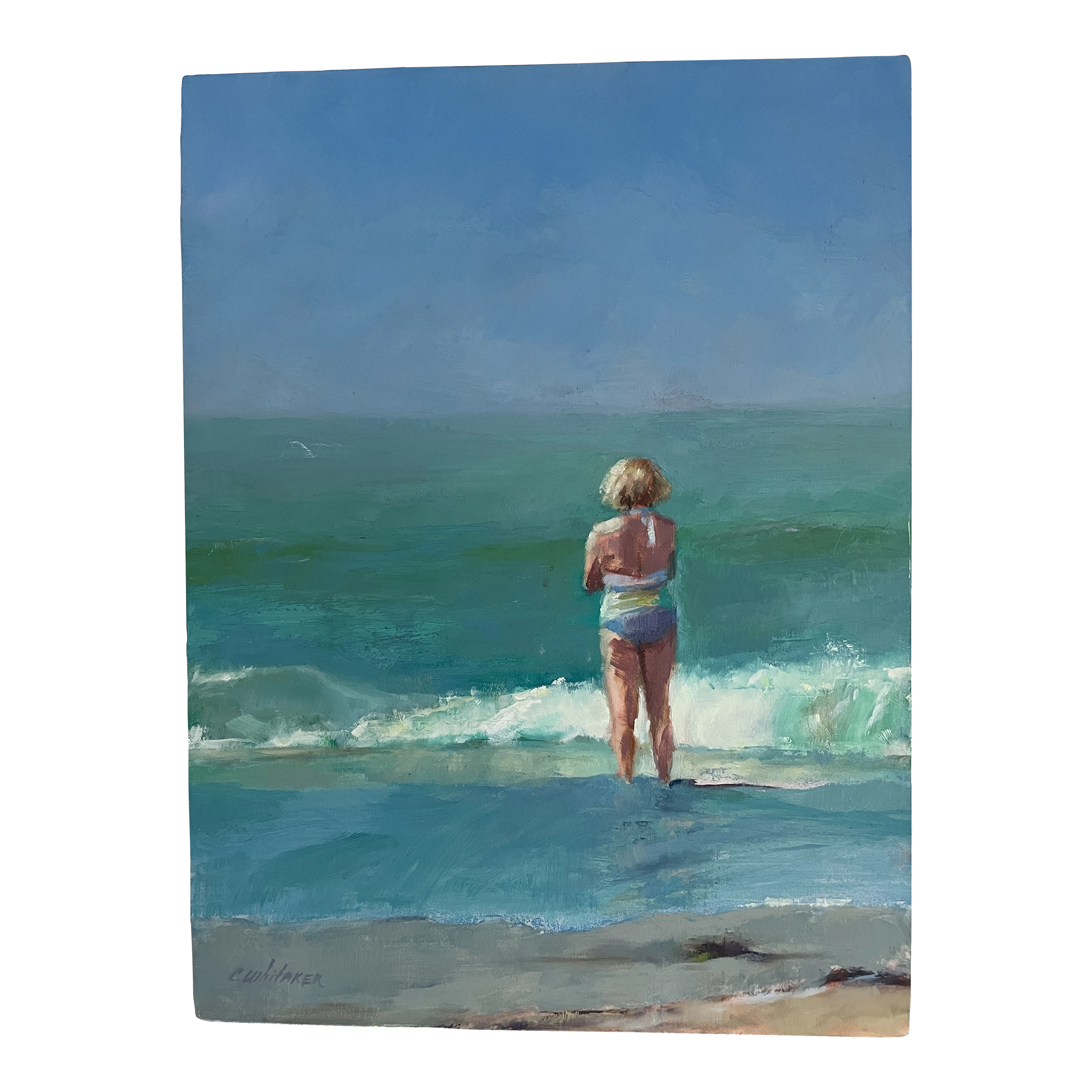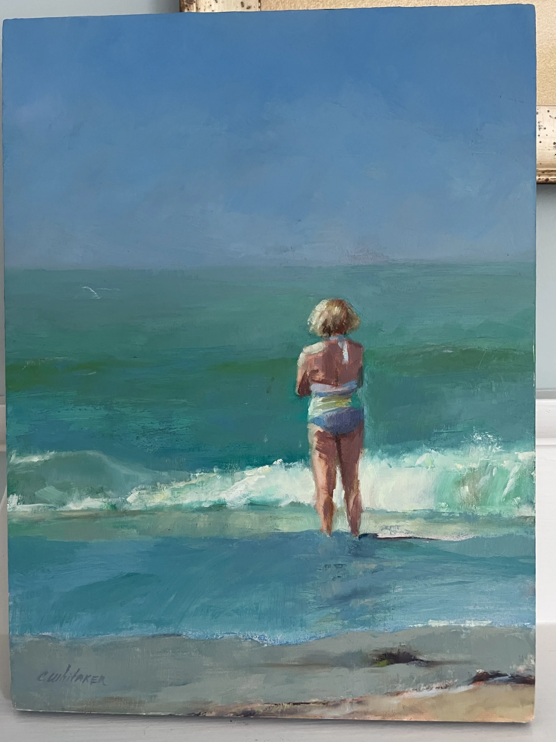 Lovely painting on board of young girl on the beach, looking out at the horizon, and standing in a couple inches of water as the waves wash by. Maine Artist Carolyn S. Whitaker. Ready for framing; sides are painted black so can be hung unframed.