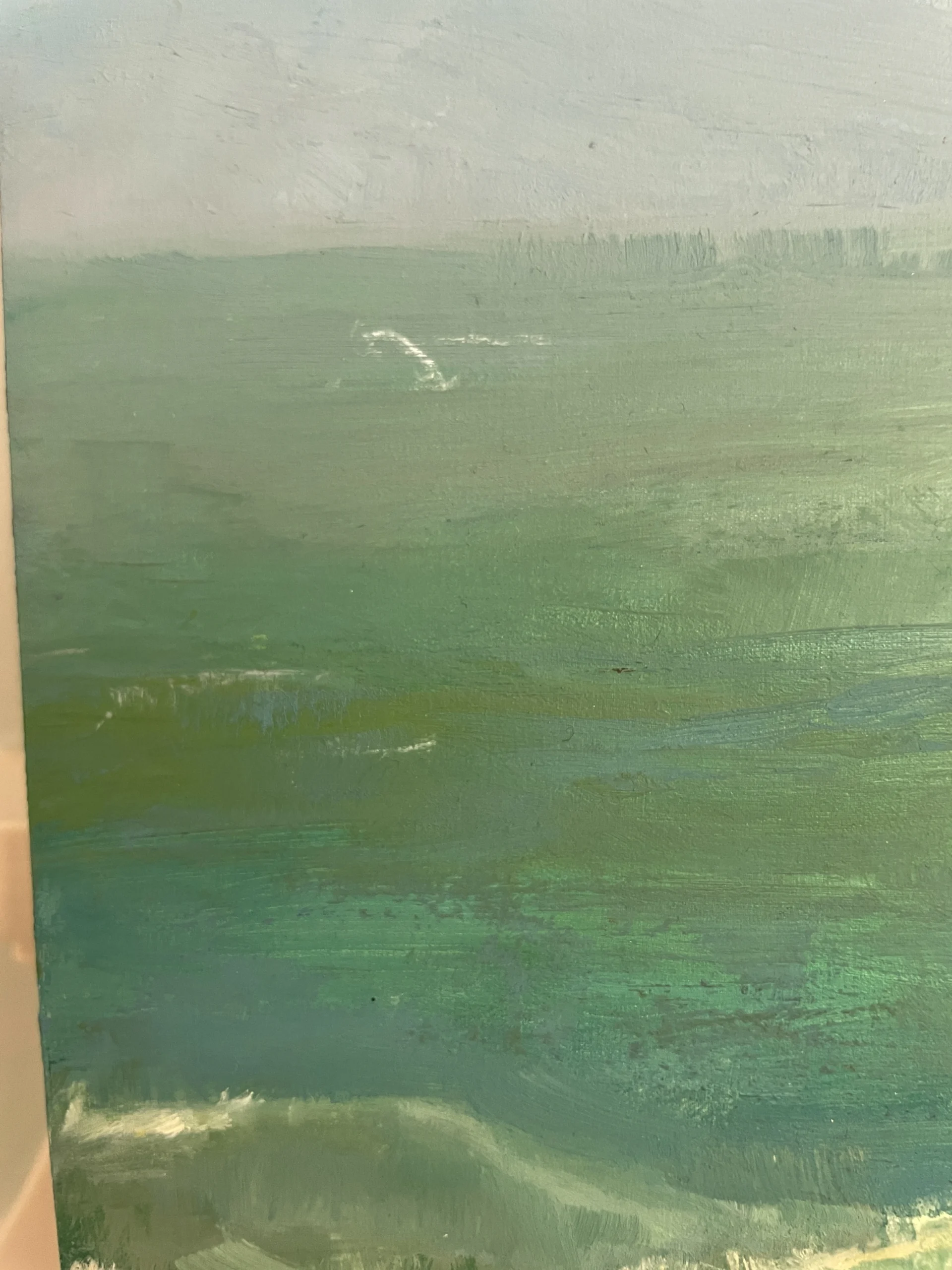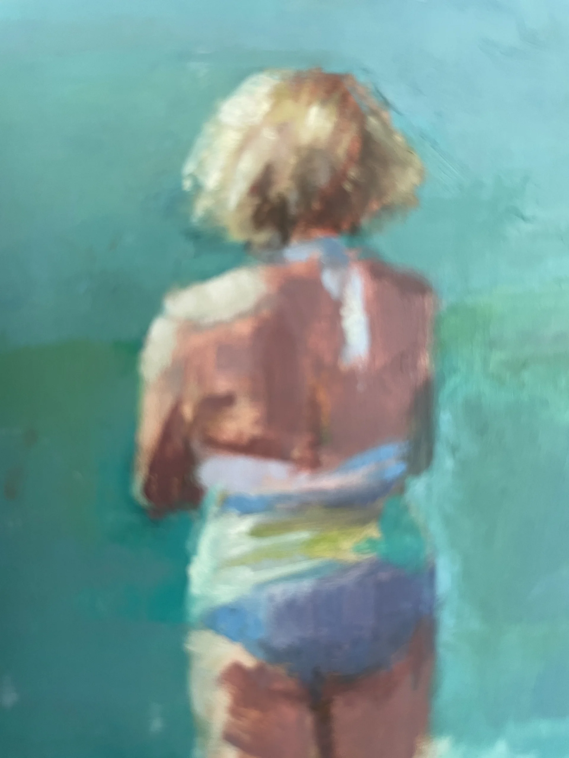 Lovely painting on board of young girl on the beach, looking out at the horizon, and standing in a couple …